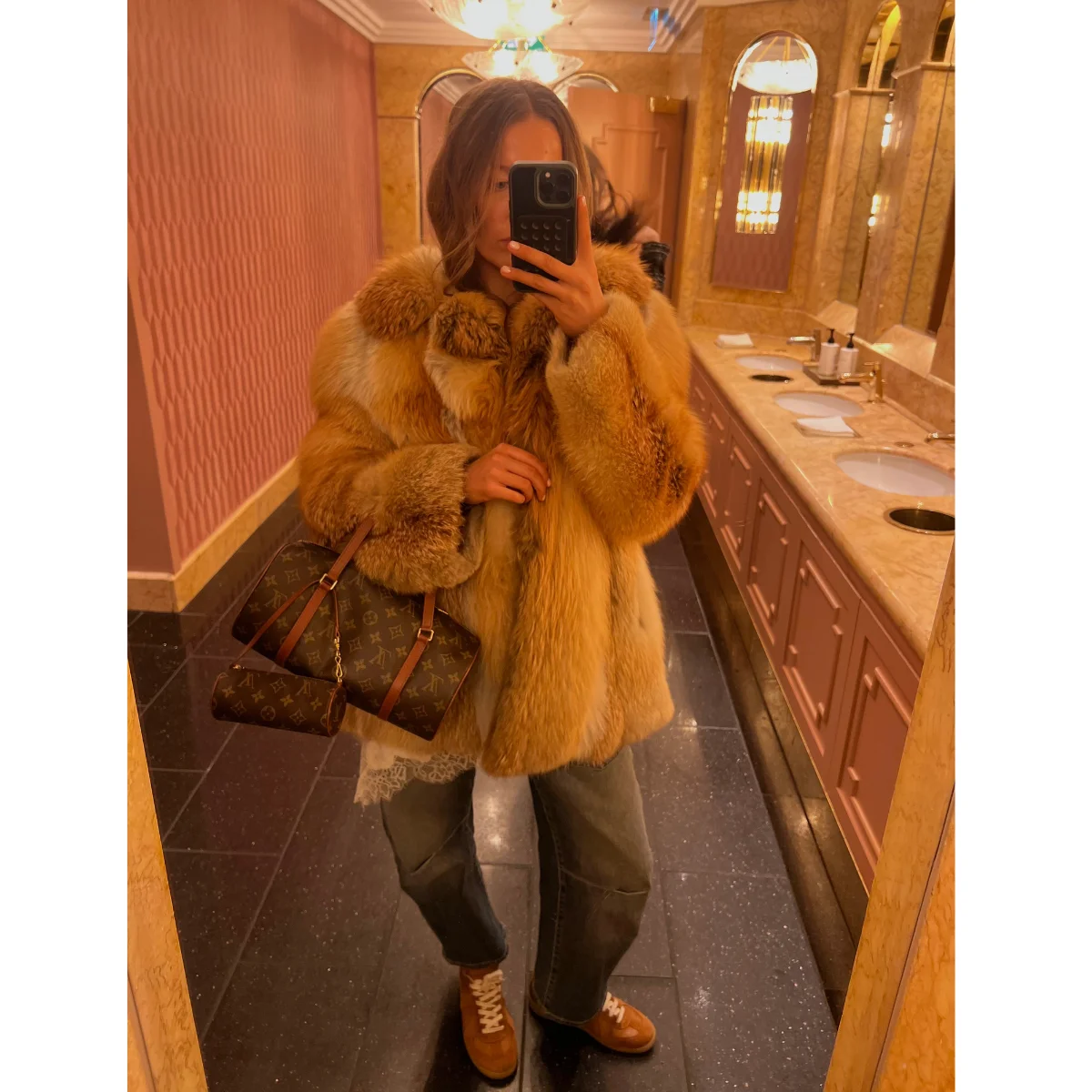 Cosy vibes, waking up in the city and picking up groceries for a Sunday dinner with my family. This incredible, fiery ginger fur coat was a find from my most recent trip to Paris. I spotted it at midday and, after a boozy lunch with my mum, it was still there when we went back, so it had to be mine. I’m wearing Nili Lotan jeans, my new favourite dressy trainers from Maison Margiela, and my super-fun Louis Vuitton Papillon bag from Luxury Exchange, which I absolutely adore. Truly my favourite bag at the moment!