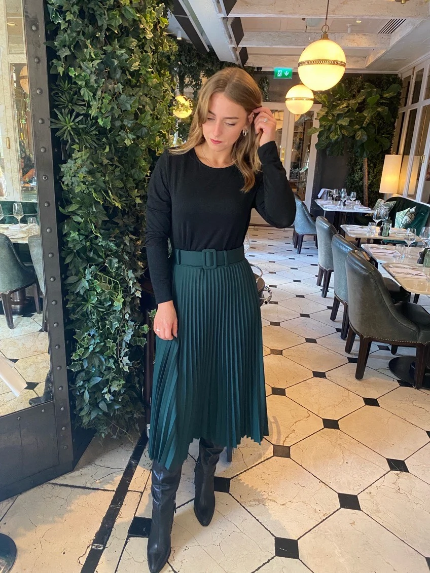 A lot of my week consists of meetings – thankfully we’re back to face-to-face communication – and there’s no better way to go into a meeting than with confidence… and a pair of knee-high boots! I’ve always loved the idea of playing with silhouettes and enhancing the natural shape of my body, so drawing attention to your waistline with a belted pleated skirt is a great way to show off your natural female curves. Emerald green is one of my favourite colours and it’s perfect for autumn/winter. My default dressing will always be more dark than colourful, I revert back to basics (like this top) a lot of the time and therefore do tend to wear a lot of black. However, I do venture into the world of pop colours from time to time, especially when I need to lift my spirits!