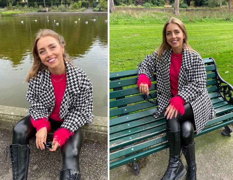 As I previously mentioned, I do tend to default to darker tones but I try to push myself to wear more colour. When I do, I always go for a strong pop of colour that really stands out like this bright fuchsia jumper with a feathered cuff. I love experimenting with my fashion, sometimes it connects and sometimes you look back and go… ‘What was I thinking?!’ But that’s what I love about fashion, you can be a different version of yourself each day and test the waters with whatever you like in that moment. Another great styling hack is to combine different textures, this is always very appealing to the eye. When worn together, the check coat, the feathered jumper and the leather leggings allow you to play around and create a more interesting look!