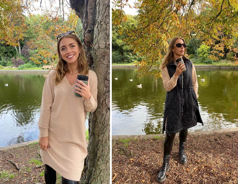I am a big nature lover and I always find being outdoors on a Sunday is the perfect way to collect your thoughts and let yourself recharge. Life can move very fast and it’s important to allow yourself those downtime moments, connecting to the world around you. With this, comfort and warmth (especially in these cold months) is key! I love to layer up as I think this gives you the opportunity to still express your style through the variations of what you’re wearing. A gilet is perfect for this, especially when combined with a knitted jumper dress, some leather leggings and of course, boots! It’s the ultimate autumn/winter look – falling between function and fashion.