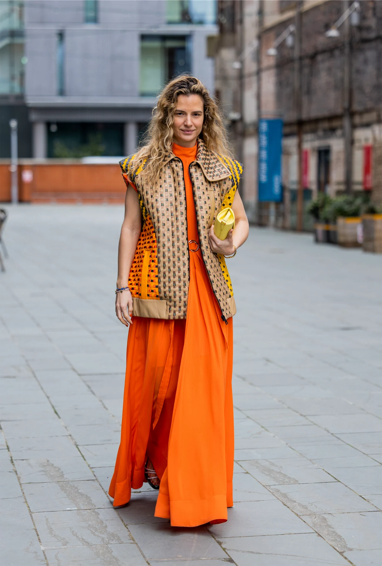I was feeling dressy again this Saturday morning to attend the Eudon Choi show, at 11am. I opted for an orange gown from the brand’s spring/summer 2023 collection in orange chiffon – one of the colours I love the most and that compliments my skin the best. The yellow leather bag in my hand is from the brand too and is the perfect accessory that goes perfectly with a beautiful Martina Spetlova leather sleeveless jacket – I let the print of the jacket do all the talking!