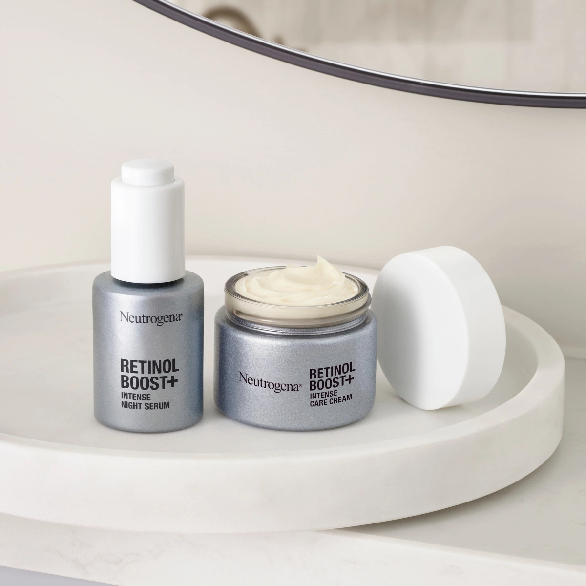 Fortunately, the Neutrogena Retinol Boost range has six products for day and night to help build your regime, including the Day Cream SPF 15, €34.99, a lightweight cream that improves tone and texture, targets signs of ageing, and helps protect the skin from further photo ageing. The Eye Cream, €30.99, is another marvel, correcting signs of ageing around the delicate skin around the eye. The Serum, €34.99, visibly reduces the appearance of fine lines and wrinkles while boosting firmness, while the Night Cream, €34.99, works overnight to help you wake up to glowing, youthful looking skin. If you prefer a rich cream, the Retinol Boost+ Intense Care Cream, €38.99, targets signs of ageing in a creamy, hydrating formula while Retinol Boost+ Intense Night Serum, €38.99, has the highest concentration of Pure Retinol in the range, for an overnight serum that works while you sleep to help reduce the look of stubborn fine lines and deep wrinkles.