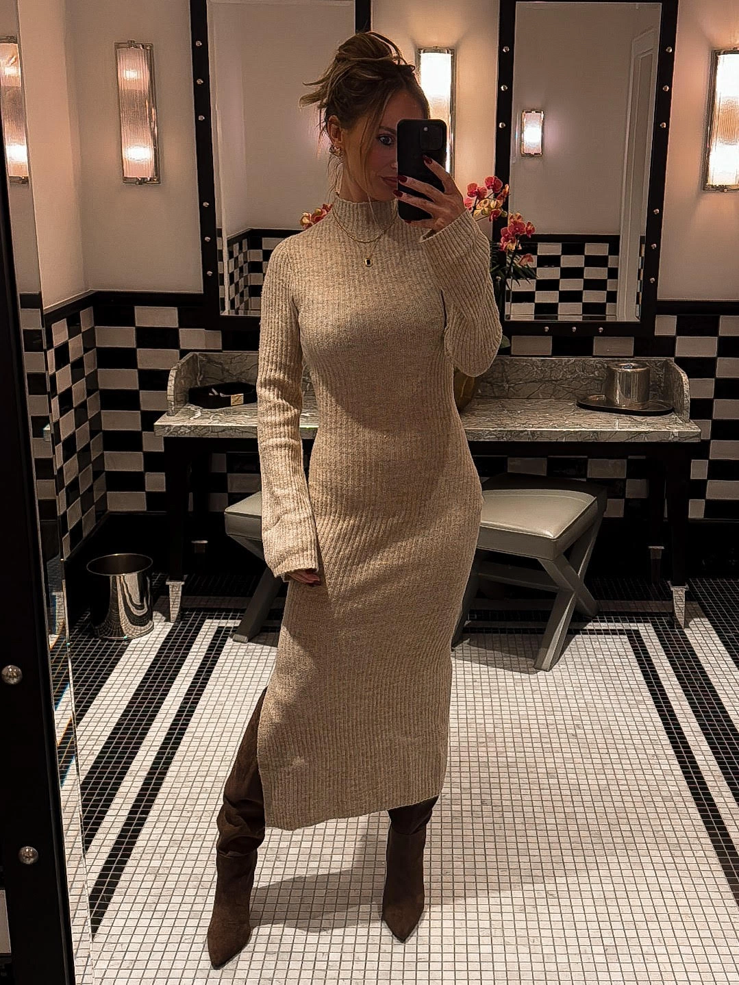 Tuesday saw us exploring Dublin’s interior design scene. This outfit was perfect for a day of browsing showrooms: a versatile H&M beige marl knit jumper layered over a white-shirred puff-sleeve dress (a Depop find!), teamed with my trusty Bronx western cow leather high boots. My Louis Vuitton bag carried all the essentials, while Ray Ban sunglasses were more for style than anything as it was a mild but grey day! With home renovations still underway after our late 2023 project, this family trip was all about looking for the perfect finishing touches for our home.