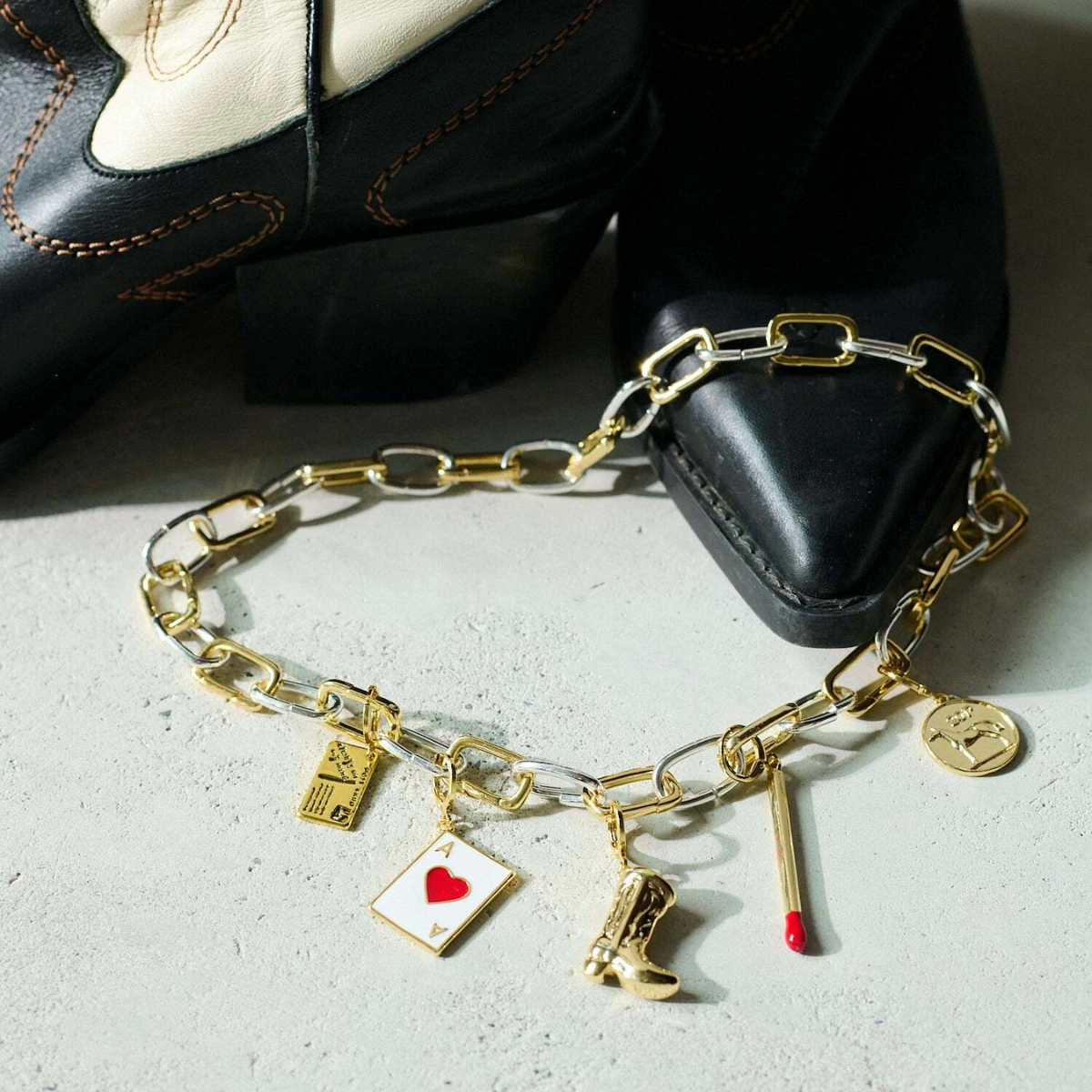 A mix of the delicate and the chunky made with gold and silver links, The Charm Collection is incredibly versatile, and can be made into a choker, a bracelet, a belly chain, or simply be left as is. Add these charms—whether you go for the ace of hearts or chill pill, the cowboy boot or match stick—to your clothes, your boots, keyrings — the choice is yours.