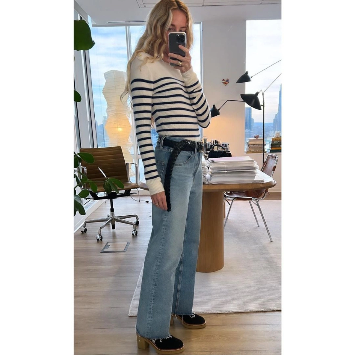 Retire the ripped, skinny jeans of your youth and replace them with a pair of high-waist, wide-leg denim trousers instead – they’re far sleeker and look much more grown up (in a good way!) A striped shirt is an absolute wardrobe necessity too, so if you don’t have one, it’s definitely worth investing in – I guarantee you’ll wear it with pretty much everything you own. Red lipstick and a leather jacket are all you need to hit the town once the last email is sent.