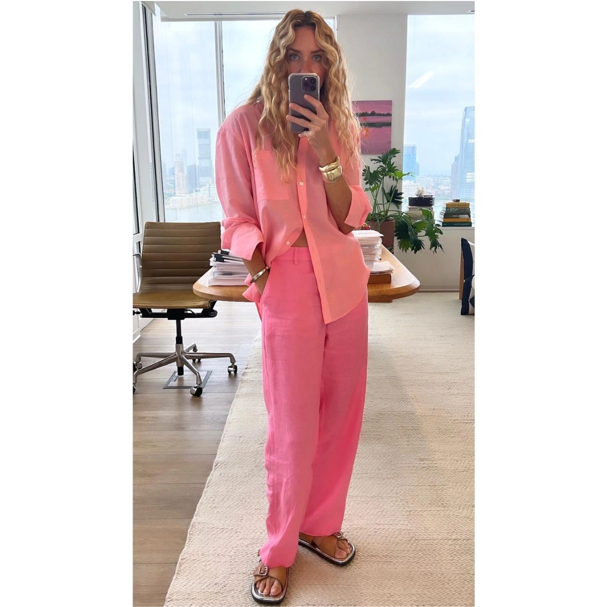 Somewhere along the way, we were conditioned to believe that officewear is synonymous with stuffy and boring. No longer! Olympia’s bubblegum pink co-ord exudes joy – I can only imagine that wearing sunshine will make your workday all the more enjoyable too.