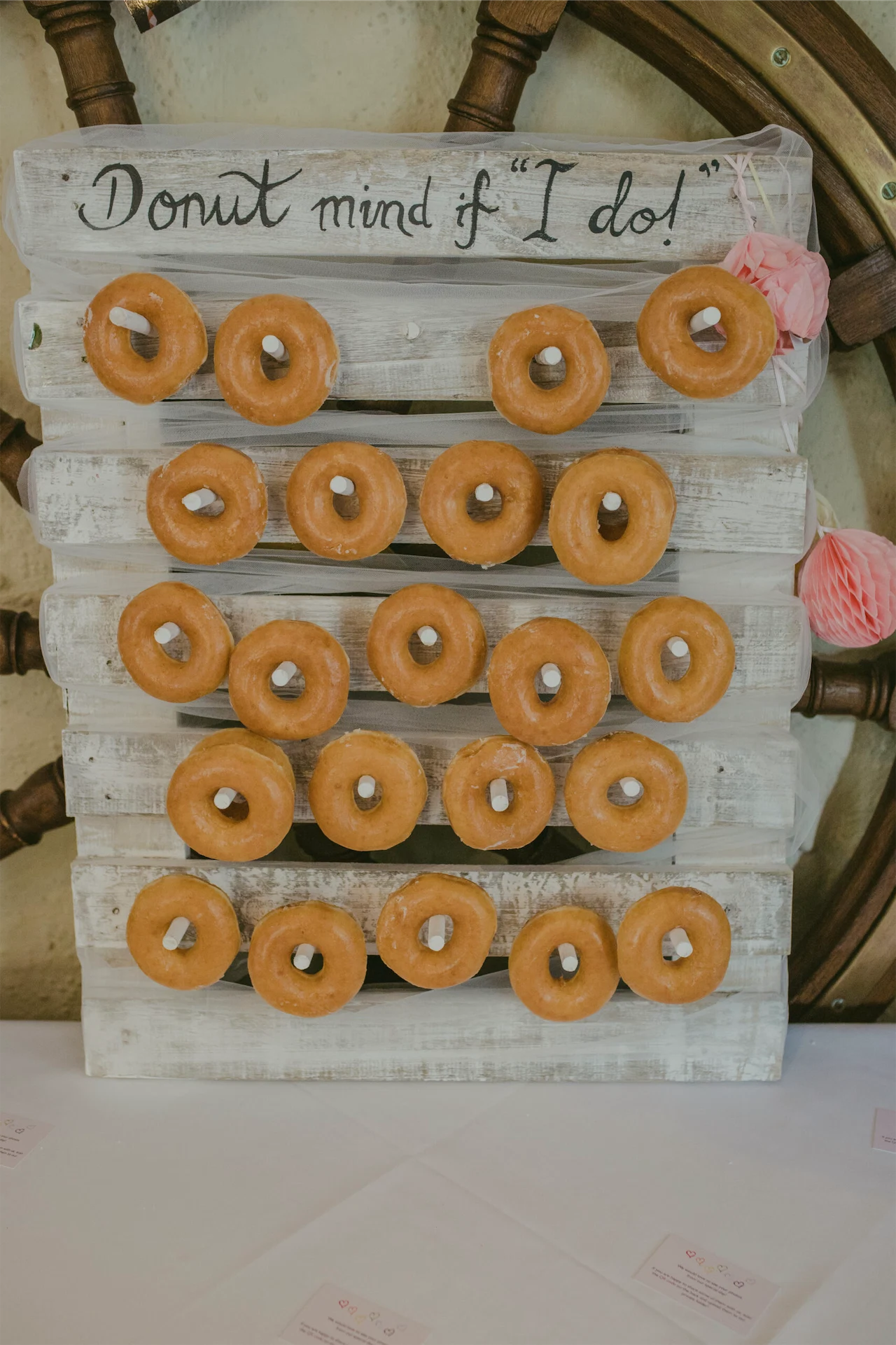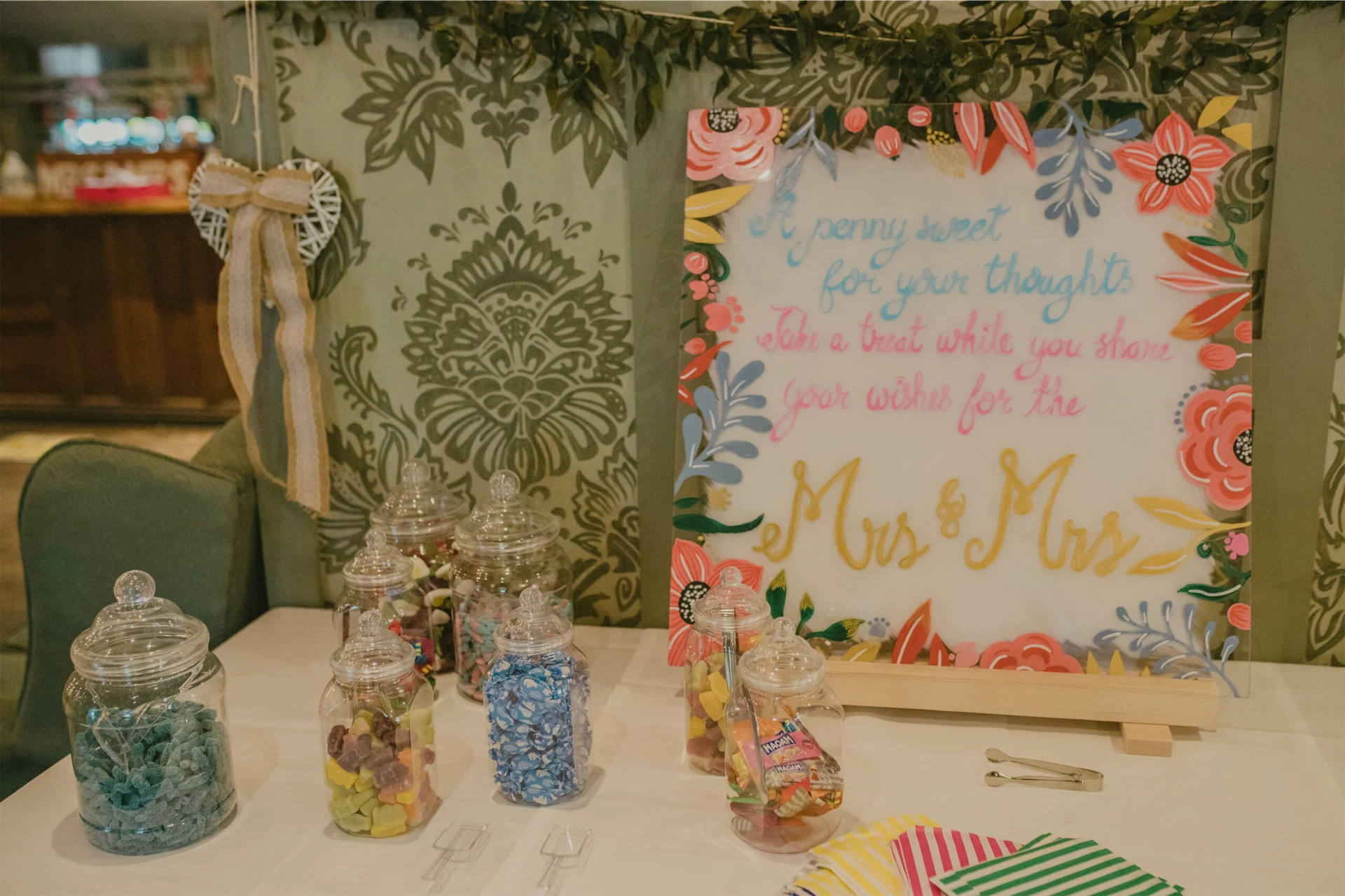We also provided some small party favours, a Krispy Kreme doughnut table, a sweet jar table, and some beautiful signage created by my creative school friends. Kieran Delaney, the technology teacher, made a lovely hand-crafted wooden sign and easel with our name and wedding date. Sharon Webster, a very talented artist, made a bespoke sign for the sweets table which added to the fun and intimacy of the ceremony.