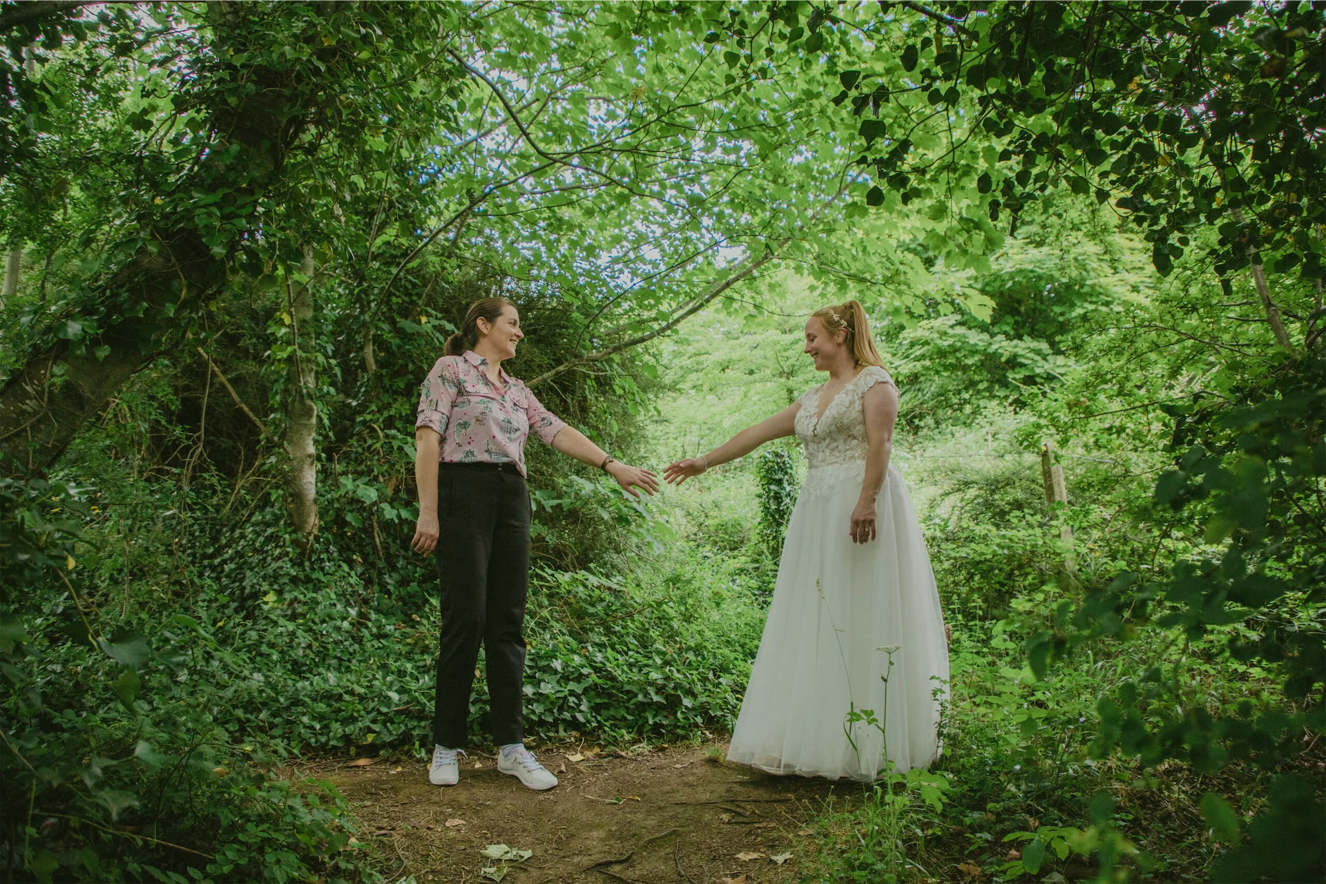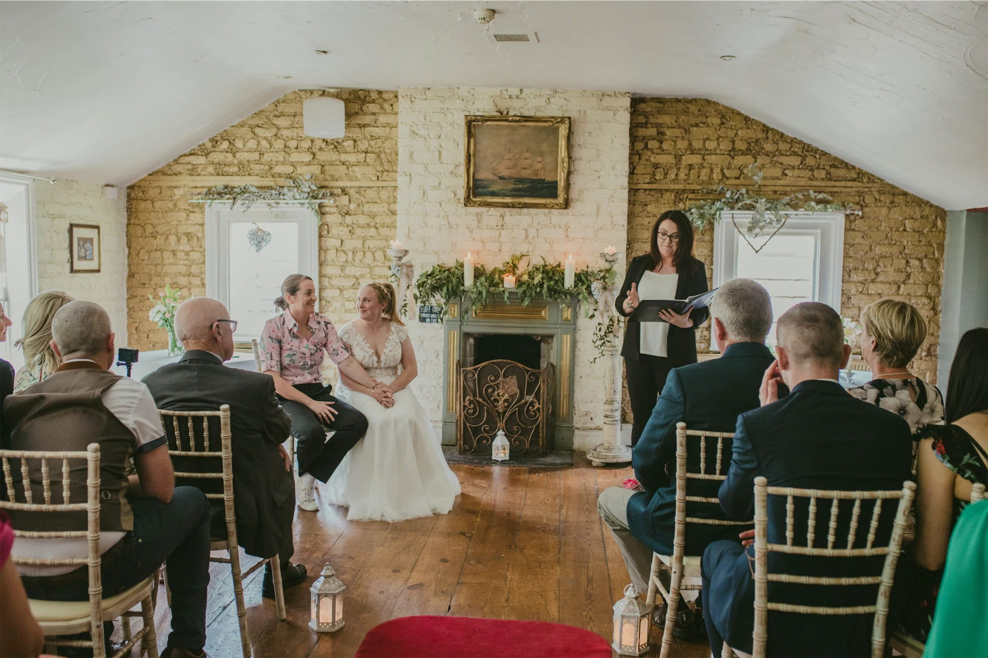 We had a humanist ceremony held in The Anglers Rest ceremony room. It was wonderfully officiated by celebrant Ruth Scott. We walked down the aisle together, then had a reading by my sister, a candle-lighting ceremony by our mothers, and exchanged vows and a few funny stories in front of our 60 guests.