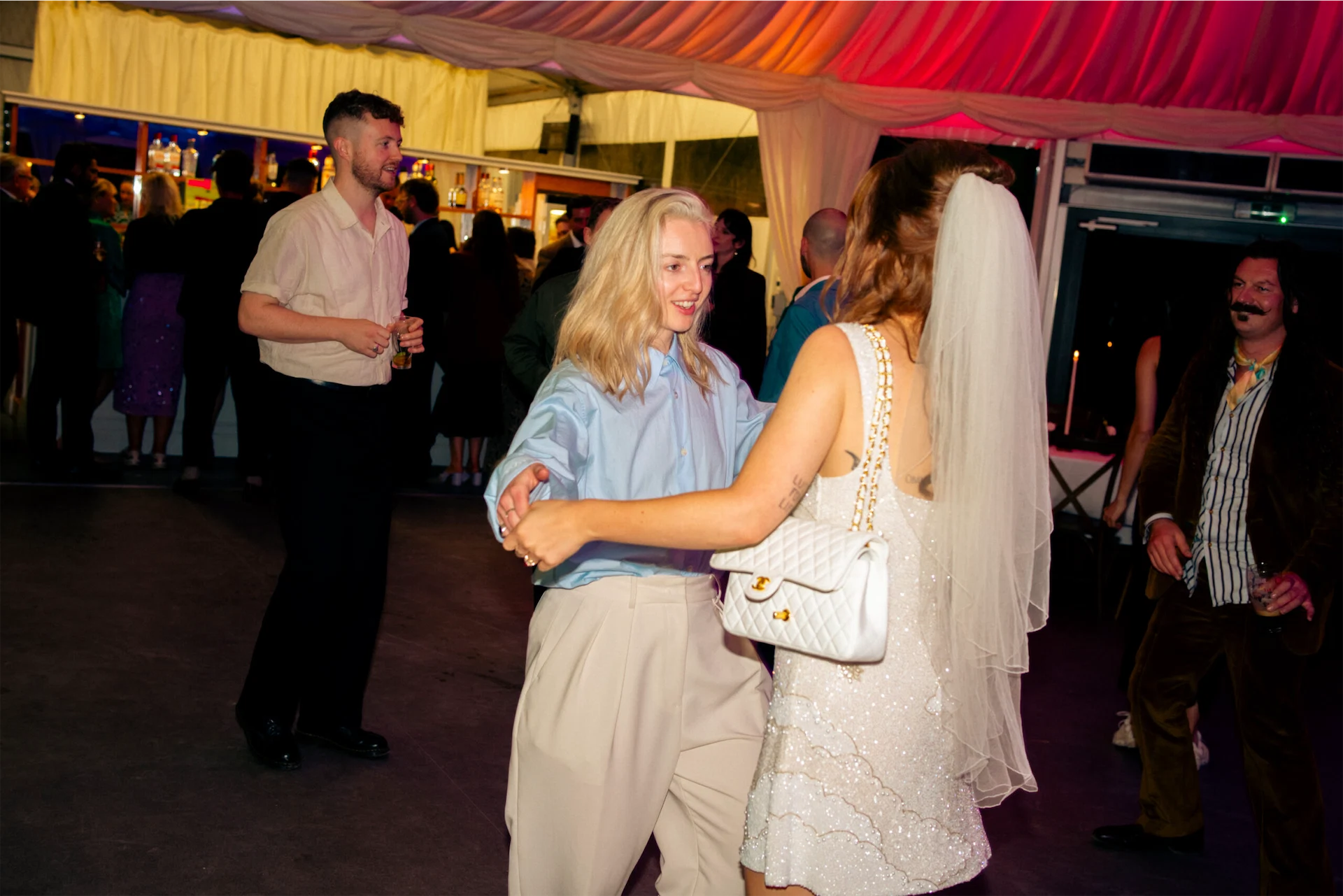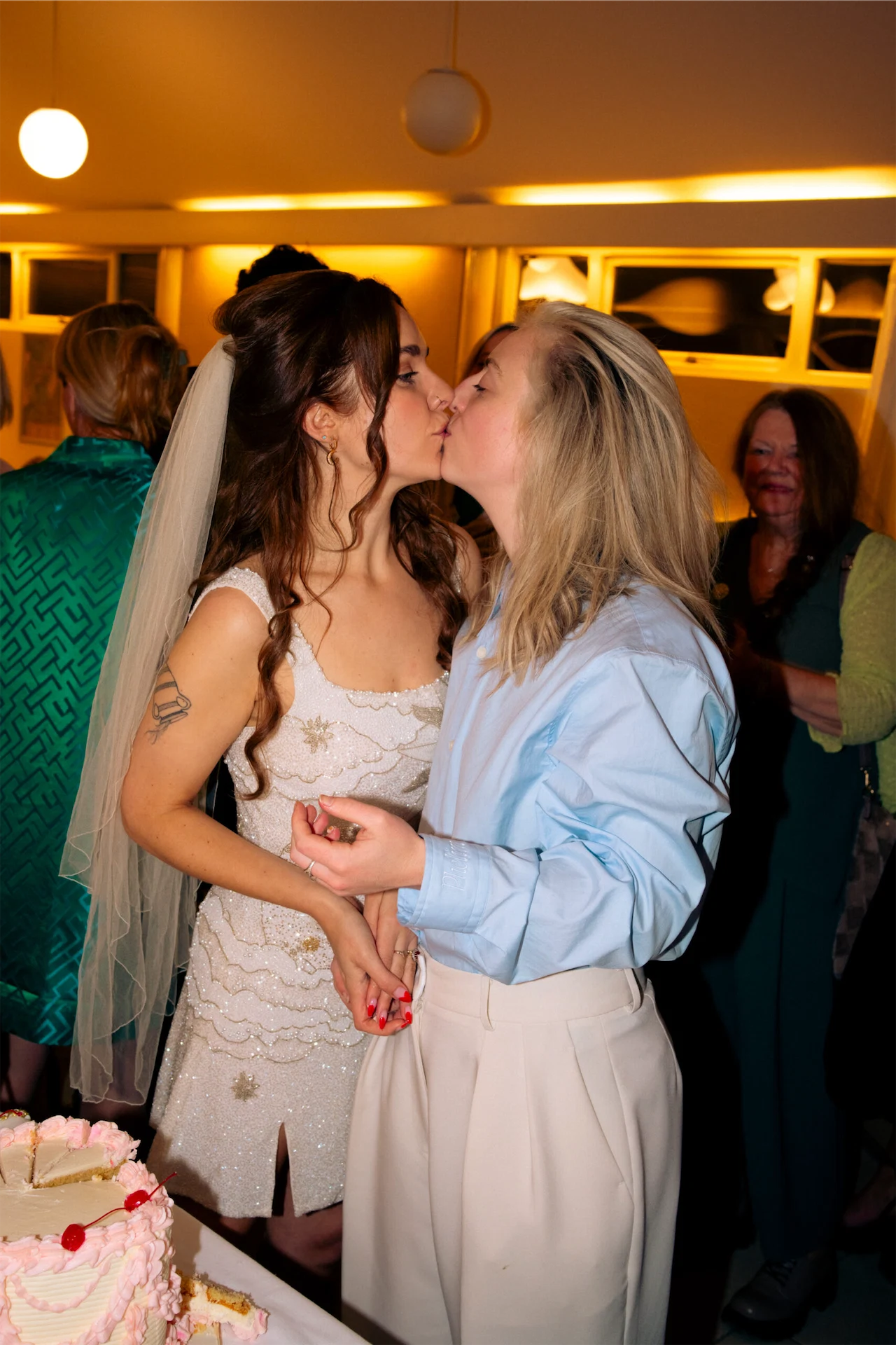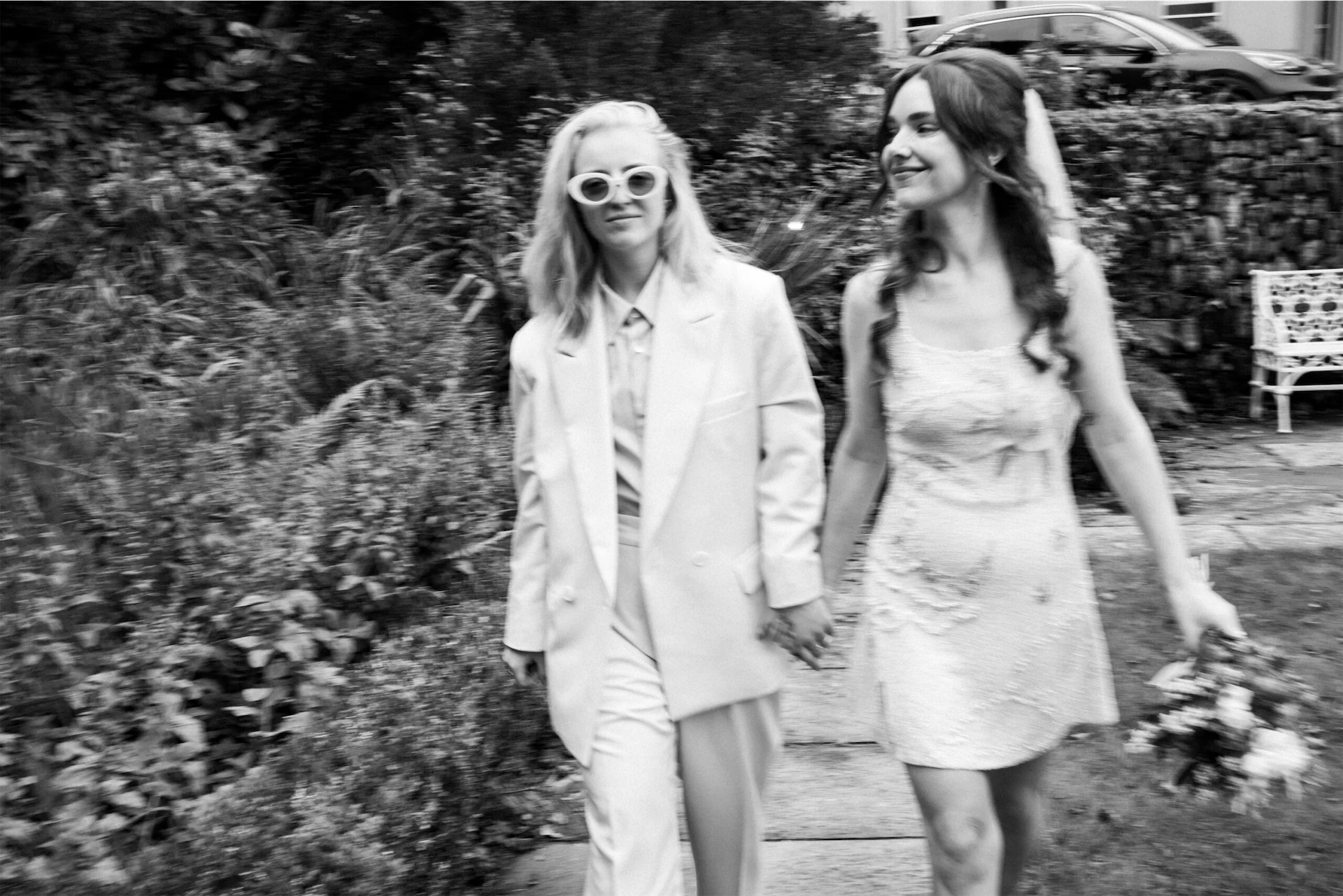 Wedding Dress: Clio Peppiatt. Wedding Suit: The Frankie Shop and Dries Van Noten. Cake: Lily Pink Bakery. Hair: Molly Farrell. Catering: Mark and Sadie, formerly of Pilgrim’s. Band: The Birdmen.
