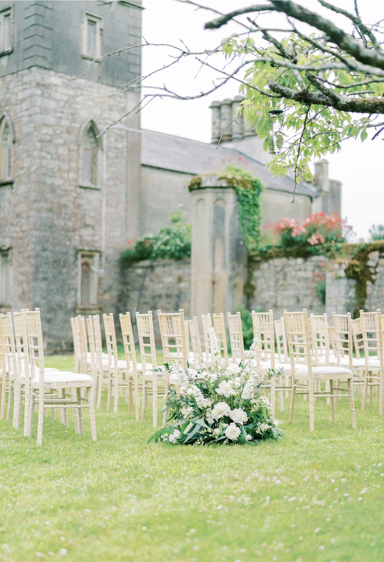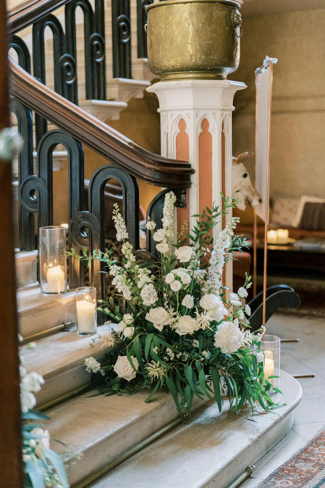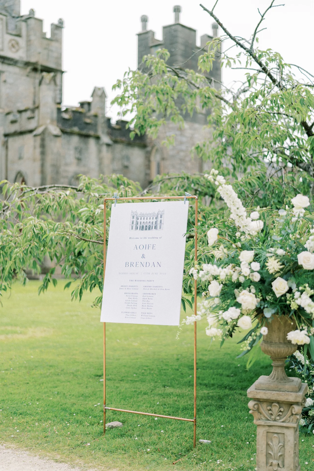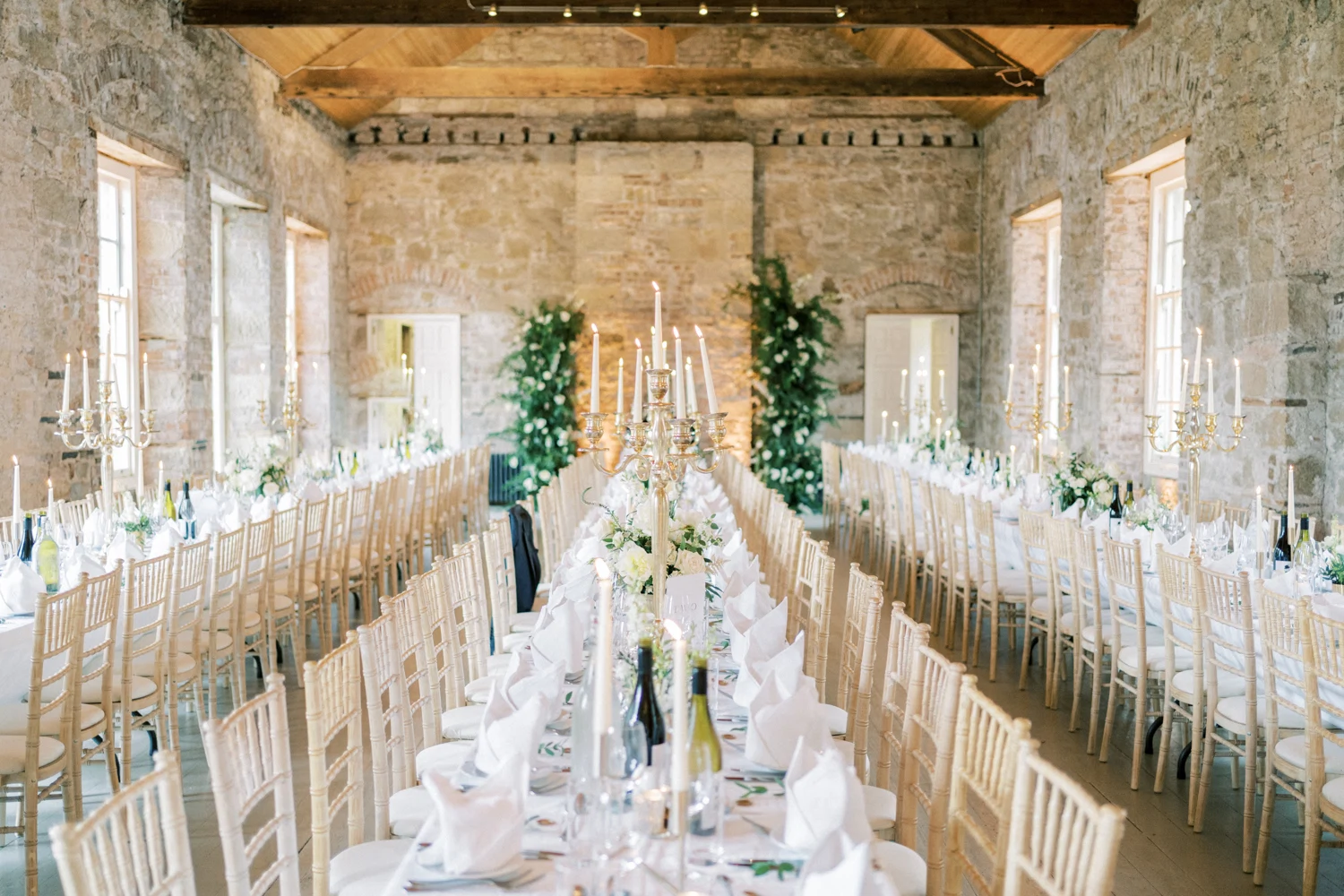 We wanted to go with something very classic, elegant, and timeless to complement the grandeur and history of Borris House (Downton Abbey vibes!). We picked a mix of green and white flowers with lots of foliage and texture as well as tapered candles and candelabras to create some height and warmth in the large space.