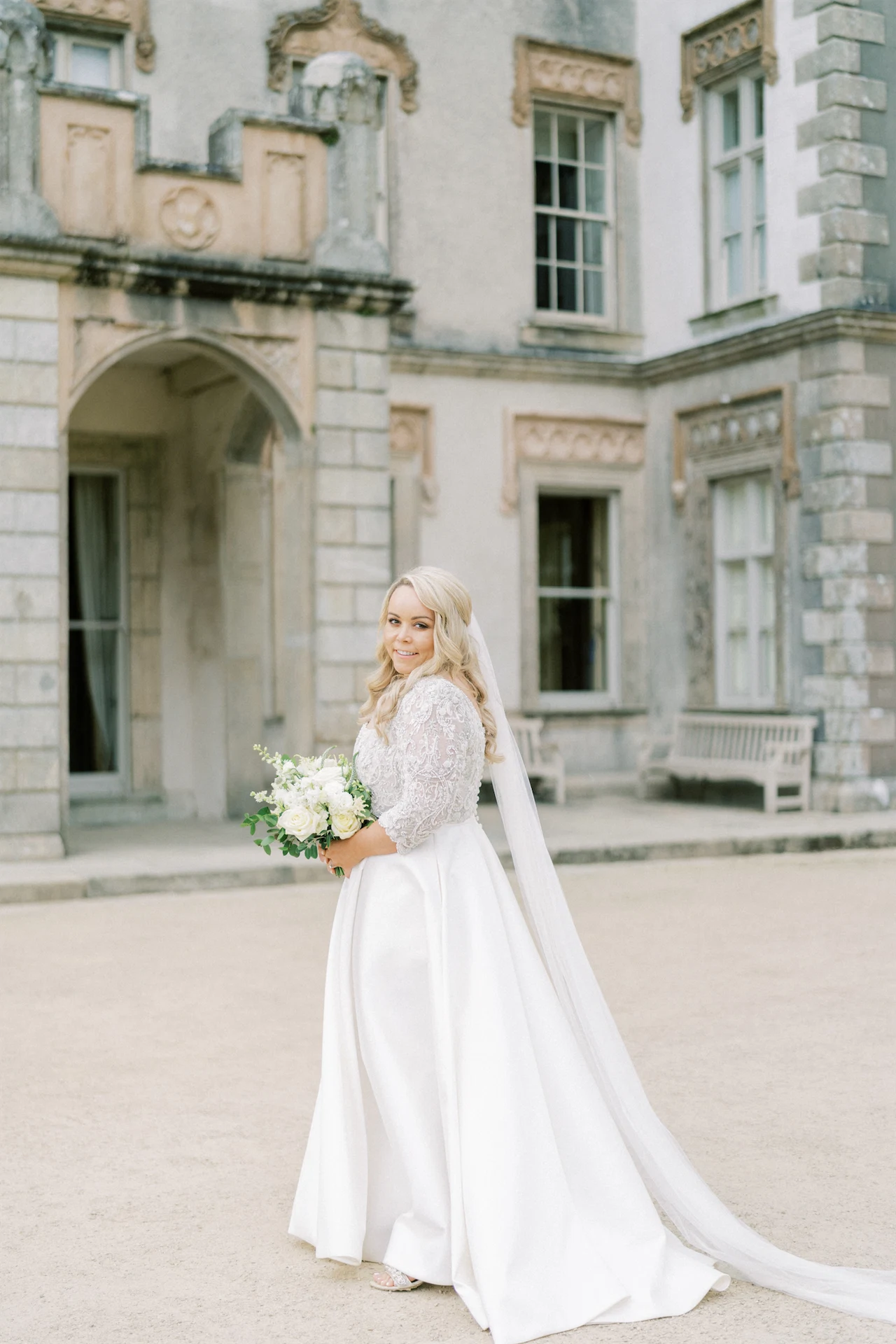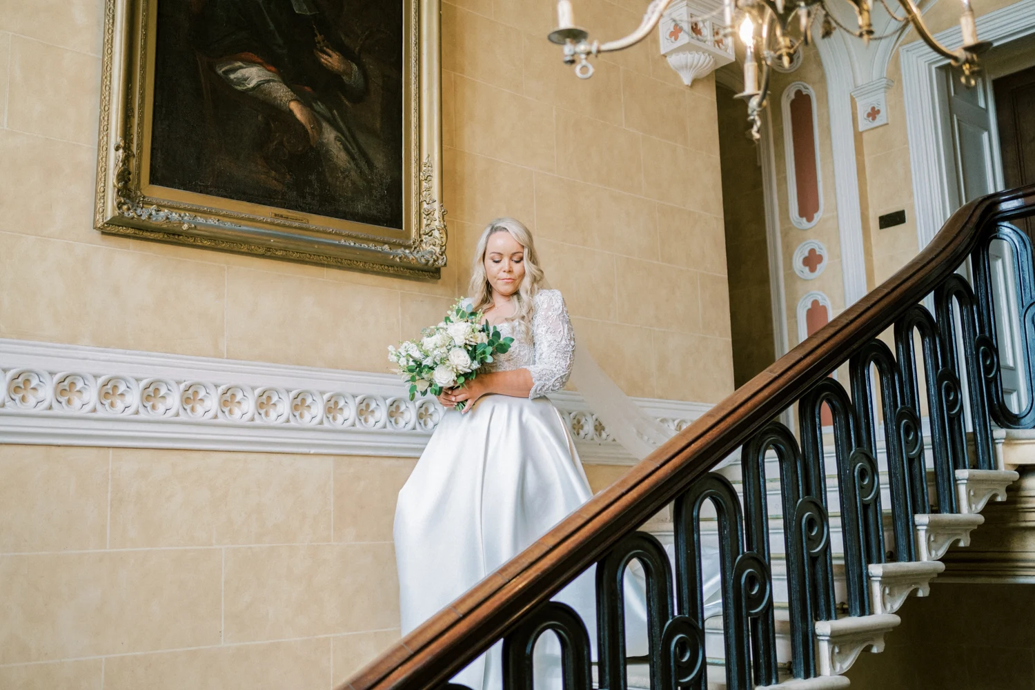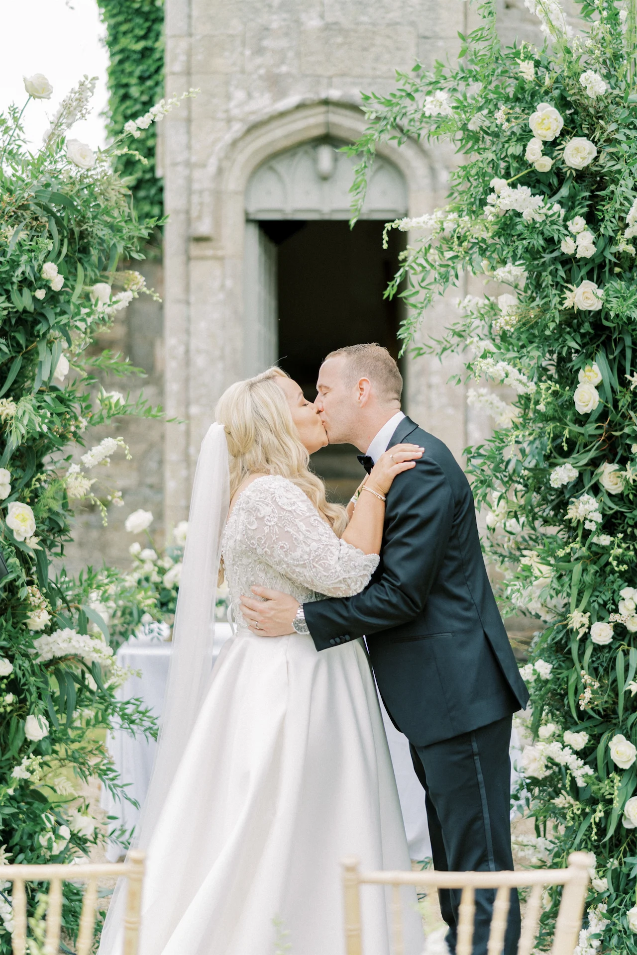 We wanted to go with something very classic, elegant, and timeless to complement the grandeur and history of Borris House (Downton Abbey vibes!). We picked a mix of green and white flowers with lots of foliage and texture as well as tapered candles and candelabras to create some height and warmth in the large space.