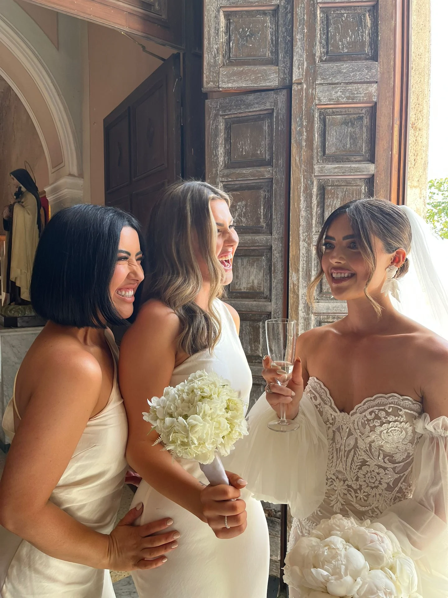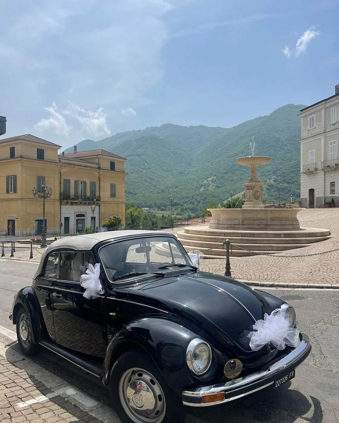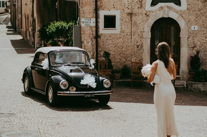 The ceremony was in a church that overlooked the mountains in Italy. I arrived in an old-fashioned black Beatle and walked down the aisle to our strings playing You’re Still The One by Shania Twain.
