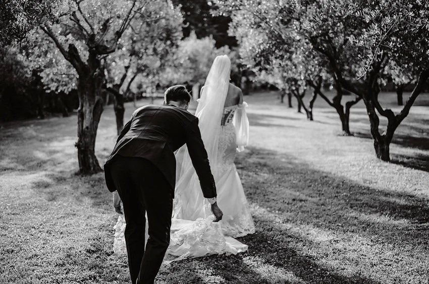 Bride’s Dress: Tamen Michael. Bride’s Shoes: Jimmy Choo. Bride’s Earrings: A.B. Ellie. Bridesmaids’ Dresses: Bec and Bridge. Groom’s Suit: Louis Copeland. Florist: Katia Santamaria. Make-Up Artist: myself. Hair Stylist: Danielle Whelan. Band: Black Tye. Food, Cake and Venue: Borgo dei Lecci Puglia. Signs, Name Places and Table Numbers: Evite You.