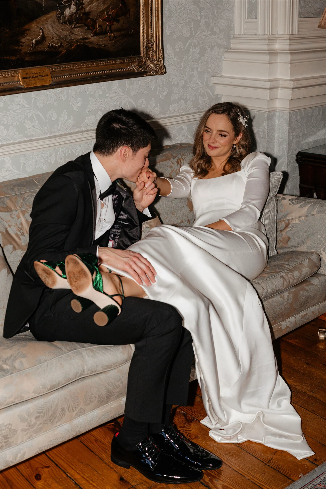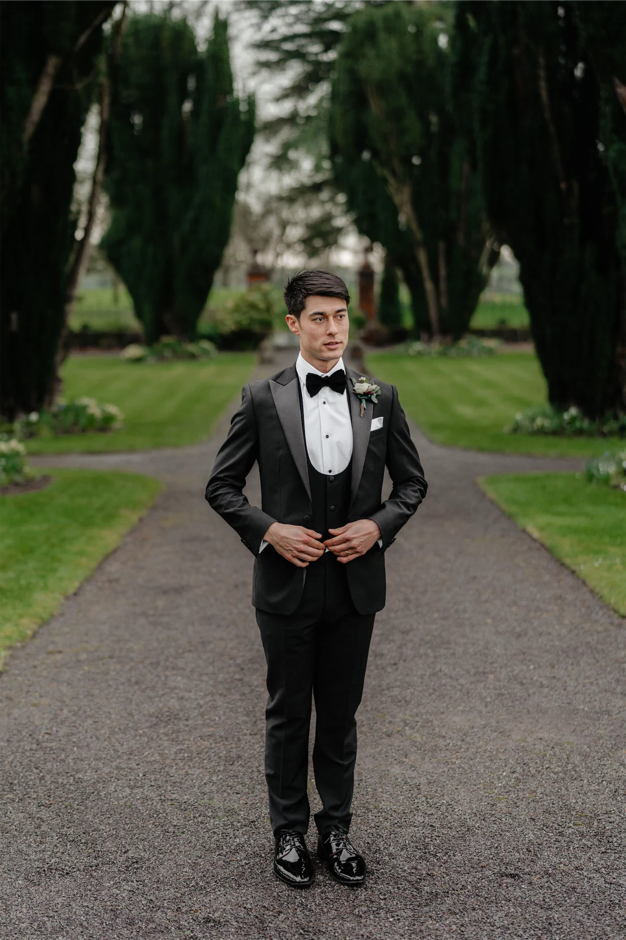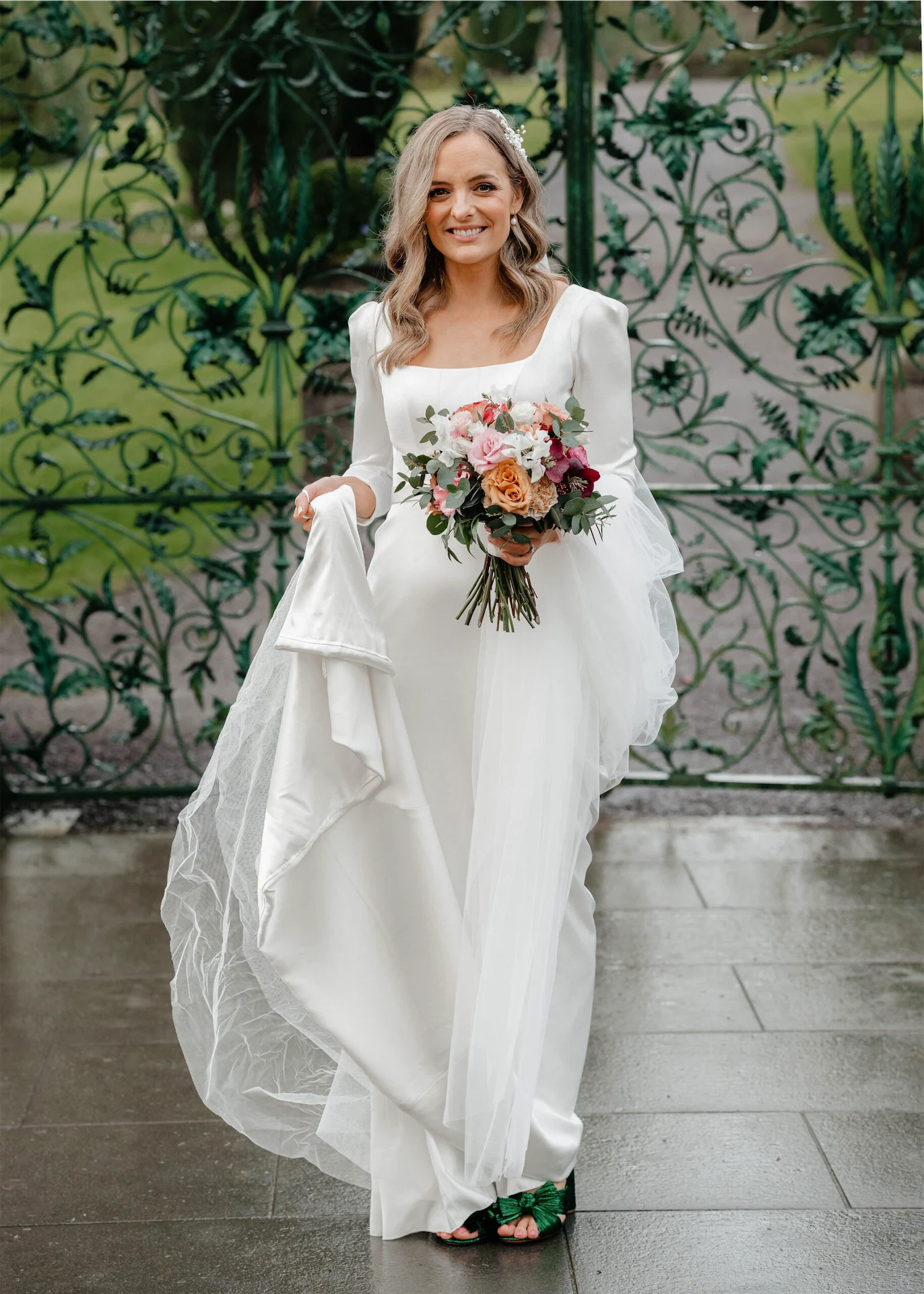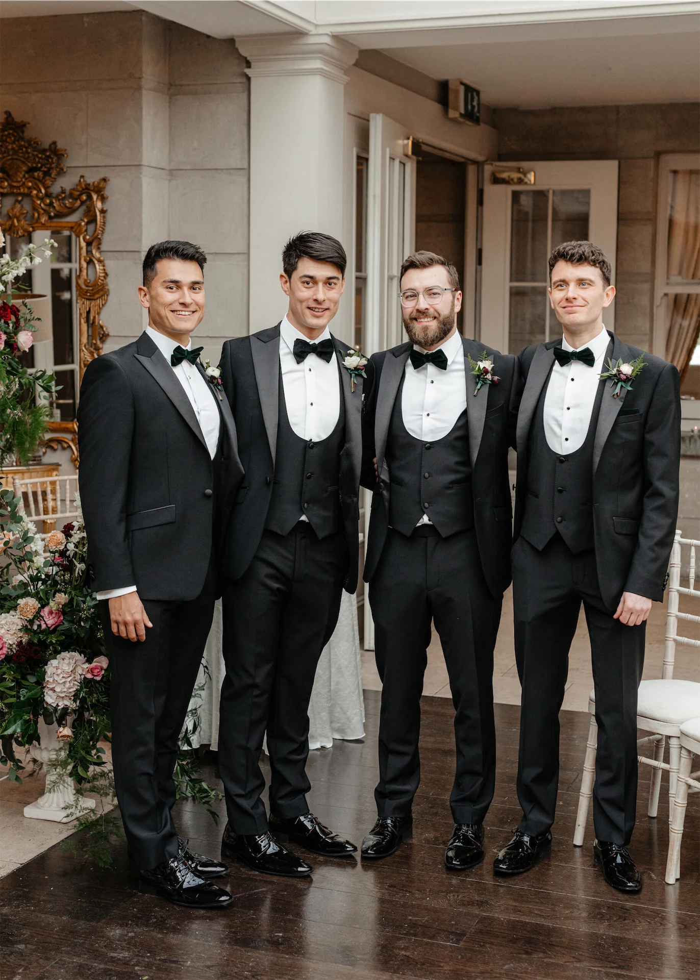 The real conversation piece was the green shoes. My sister had worn the Loeffler Randall shoes for her wedding and gone on about how comfortable they were. I tried on some other colours but my heart was set on the green. The suits were classic Herbie Frogg tuxes from Collar & Tie in Lisburn; once we decided on a classic tux look the Herbie Frogg was the clear winner. The Mother of the Groom sourced green bow ties that matched the bridesmaids perfectly. The bridesmaids’ dresses were Folkster – it has such a great selection (although the bridesmaids all ended up picking the same dress).