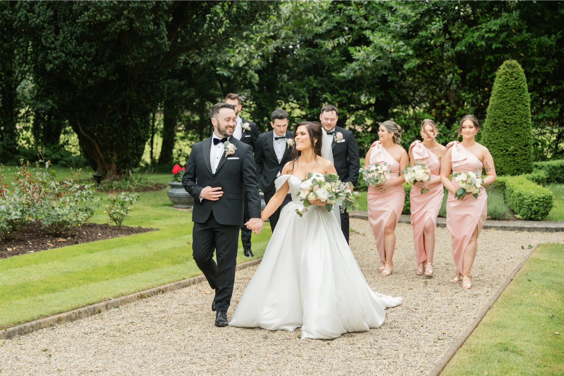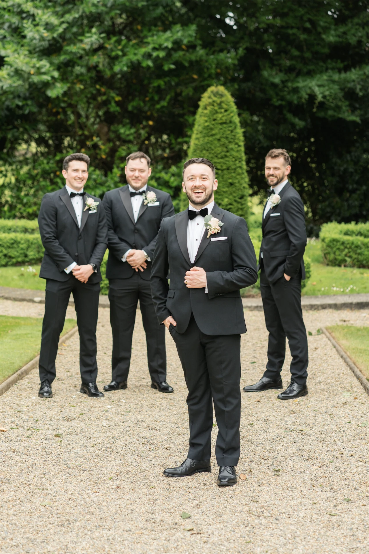 Emmet got his and his groomsmen’s suits from Detail Menswear in Kilkenny. Emmet got the three-piece black tuxedo with a velvet bow tie, while the groomsmen wore a two-piece black tuxedo with suspenders. I got my dress from Perfect Day in Lurgan, Co Armagh. I am Disney-obsessed, so this dress is from the Disney Fairytale Collection by Allure Bridal and is inspired by Belle.