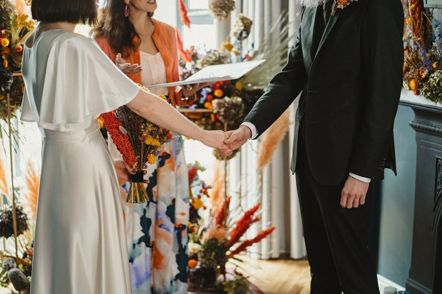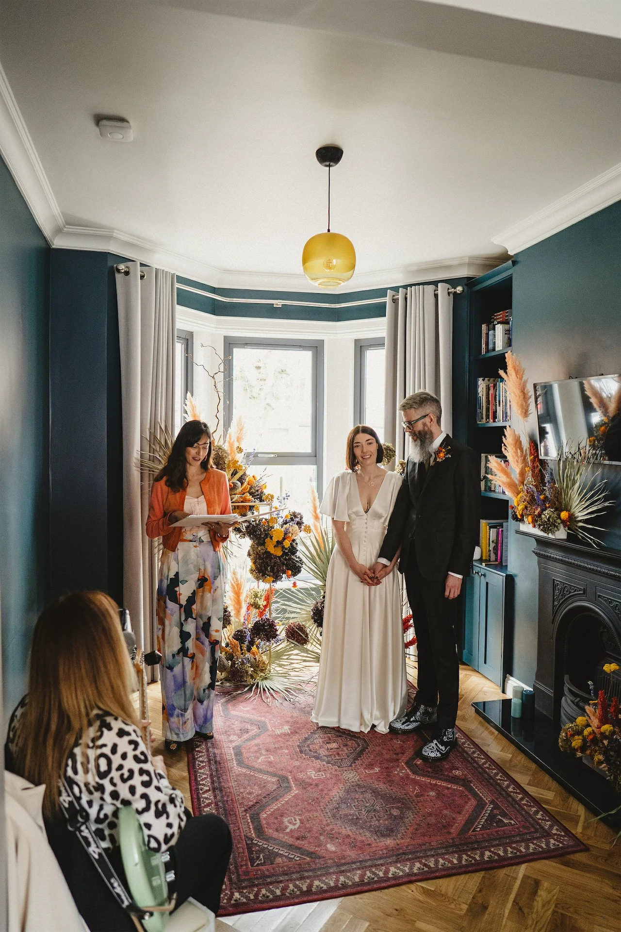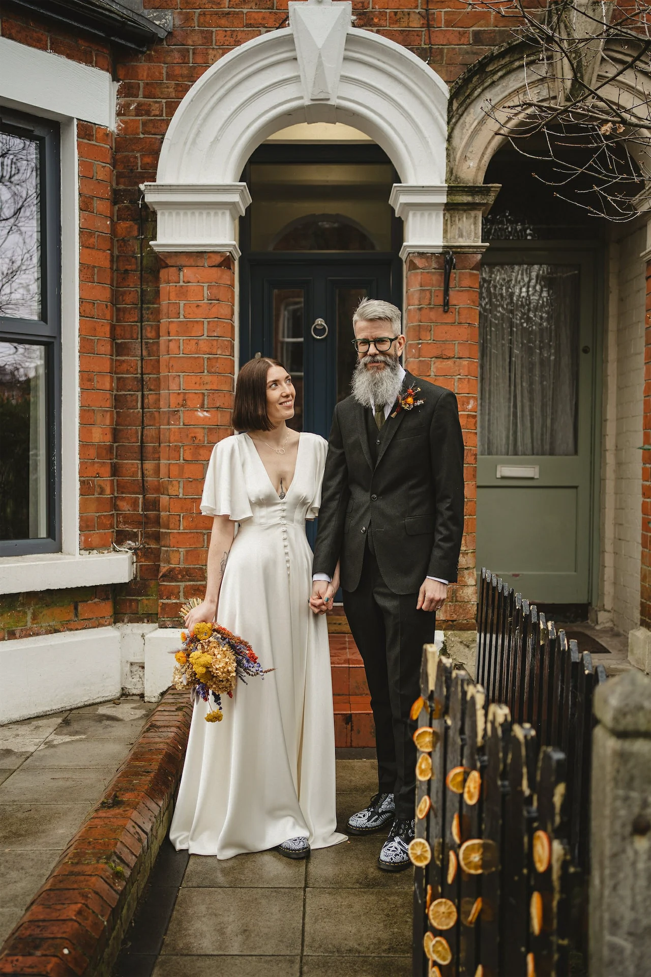Floral Earth came to the house for a second consultation the day before the wedding to rejig our flowers to fit the living room. They added so many extra touches that really made the space feel special, from the arrangements on the fireplace to the dried oranges they’d placed on our front gate.