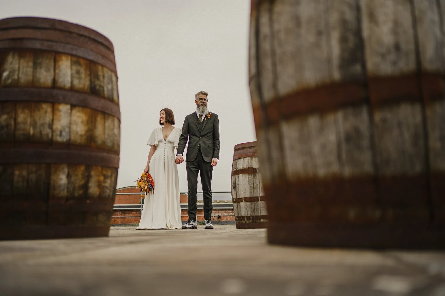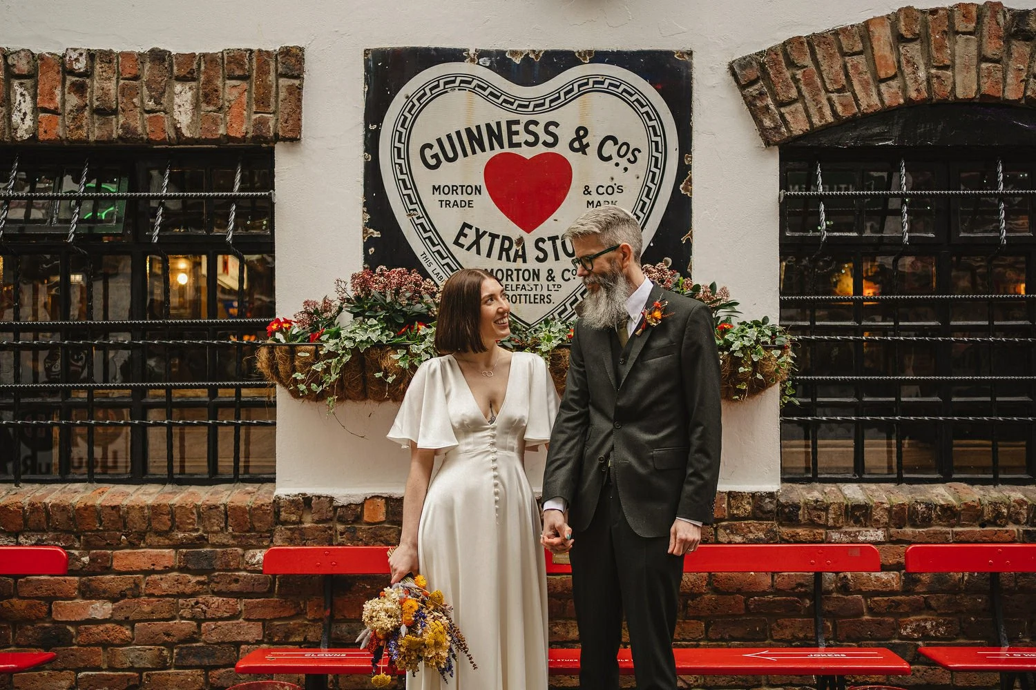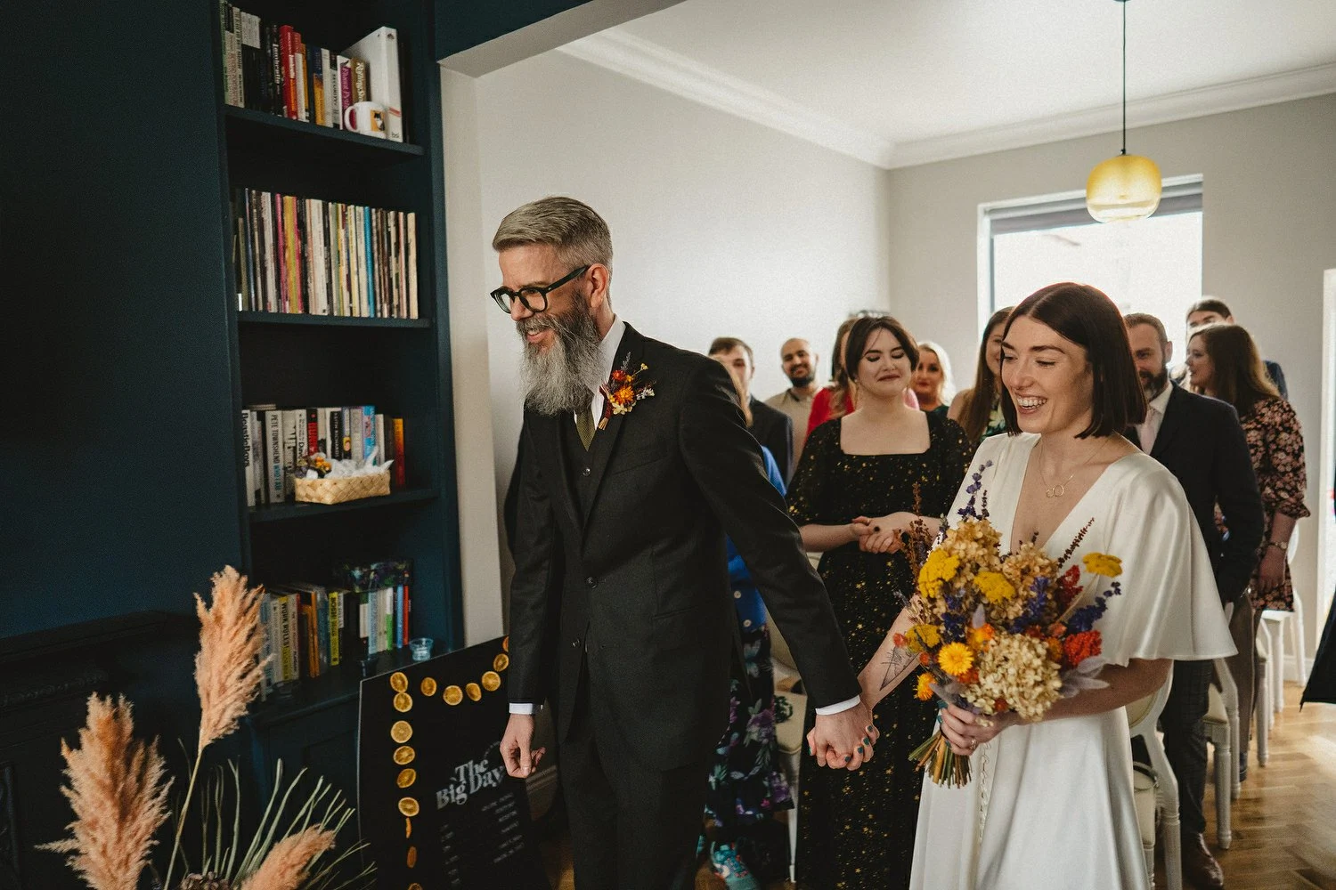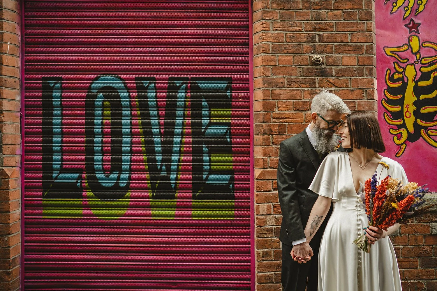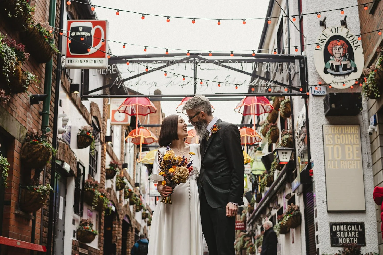 Bride’s Dress: E&W Couture. Bride’s Necklace: Lines and Current. Groom’s Suit: The Cut. Bride & Groom’s Shoes: Doc Martens painted by Leanne McWilliams Illustration. Florist: Floral Earth. Cake: GMG Creative. Food: Buba Belfast. Wedding Invites & Poster: Leanne McWilliams Illustration. Ceremony Music: Rachel Toman.