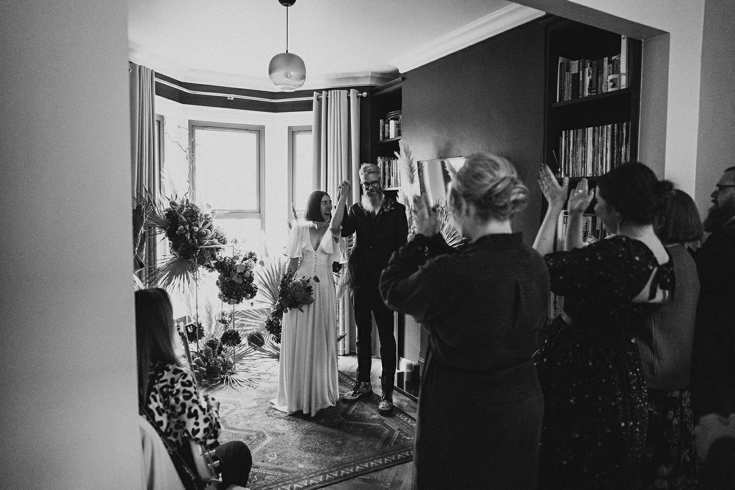 Between our friends and family and our amazing suppliers, we managed to replan everything in 48 hours. Our living/dining room became the ceremony venue, the kitchen became the bar, and we walked down our stairs together instead of up the aisle. It turned out perfectly, and we wouldn’t change a thing.