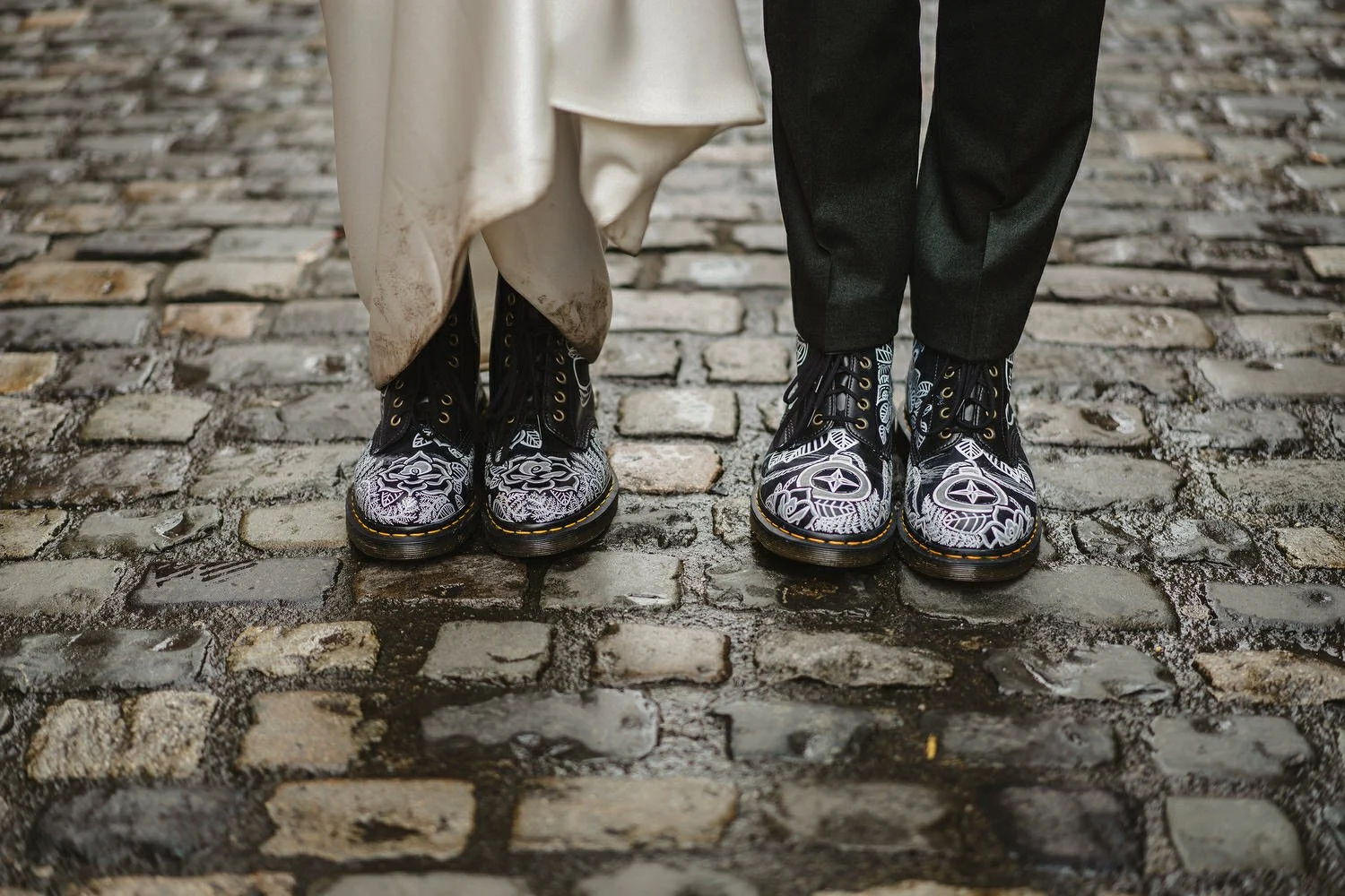 Chris always wanted a bespoke dark green suit, and we visited The Cut tailoring in Belfast. When we arrived for our appointment, Patricia had already found the perfect fabric. She guided us through picking every tiny detail from the shape of the collar and pockets to the lime green lining of the waistcoat and jacket. Both of us wore custom Doc Martens on the day, painted by our close friend and artist Leanne McWilliams.