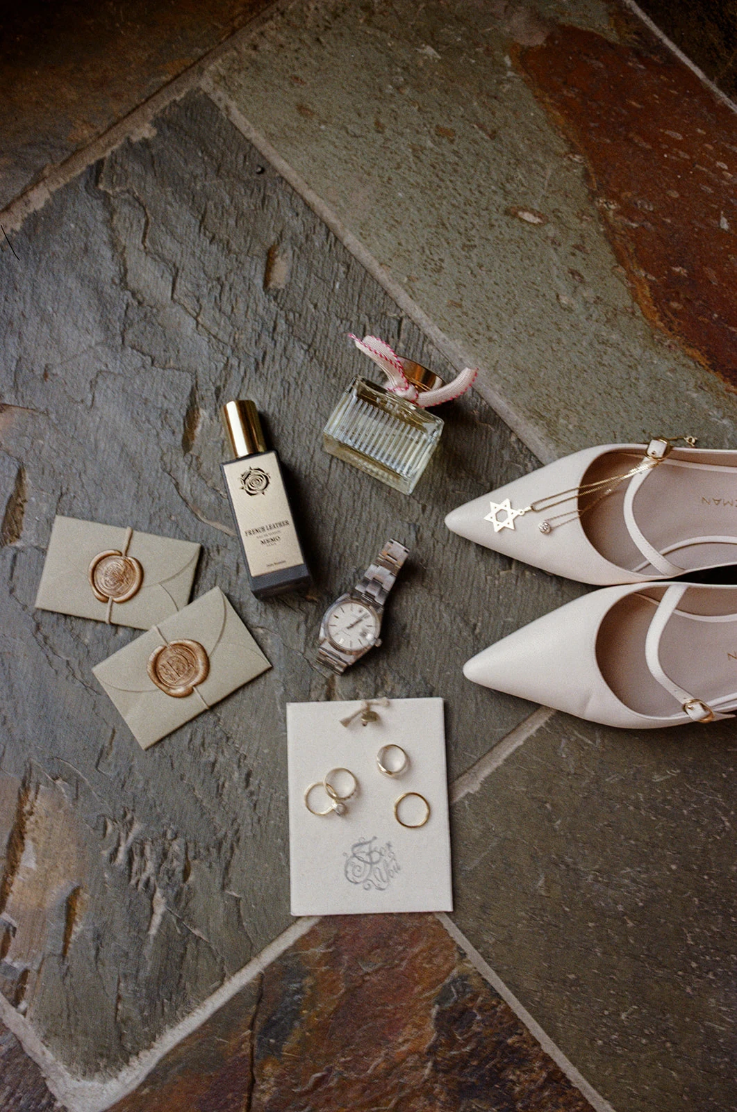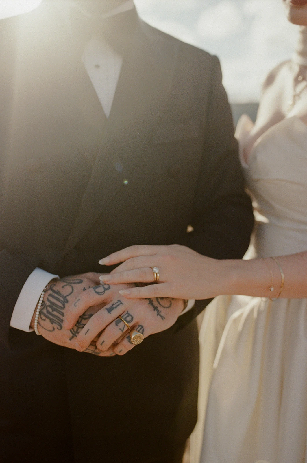 Corinne’s rings are family diamonds reset in yellow gold by Michael K Diamonds. My rings are by Brian at Soul Engraver, and my watch was a vintage Rolex that was a gift from Corinne for our engagement.