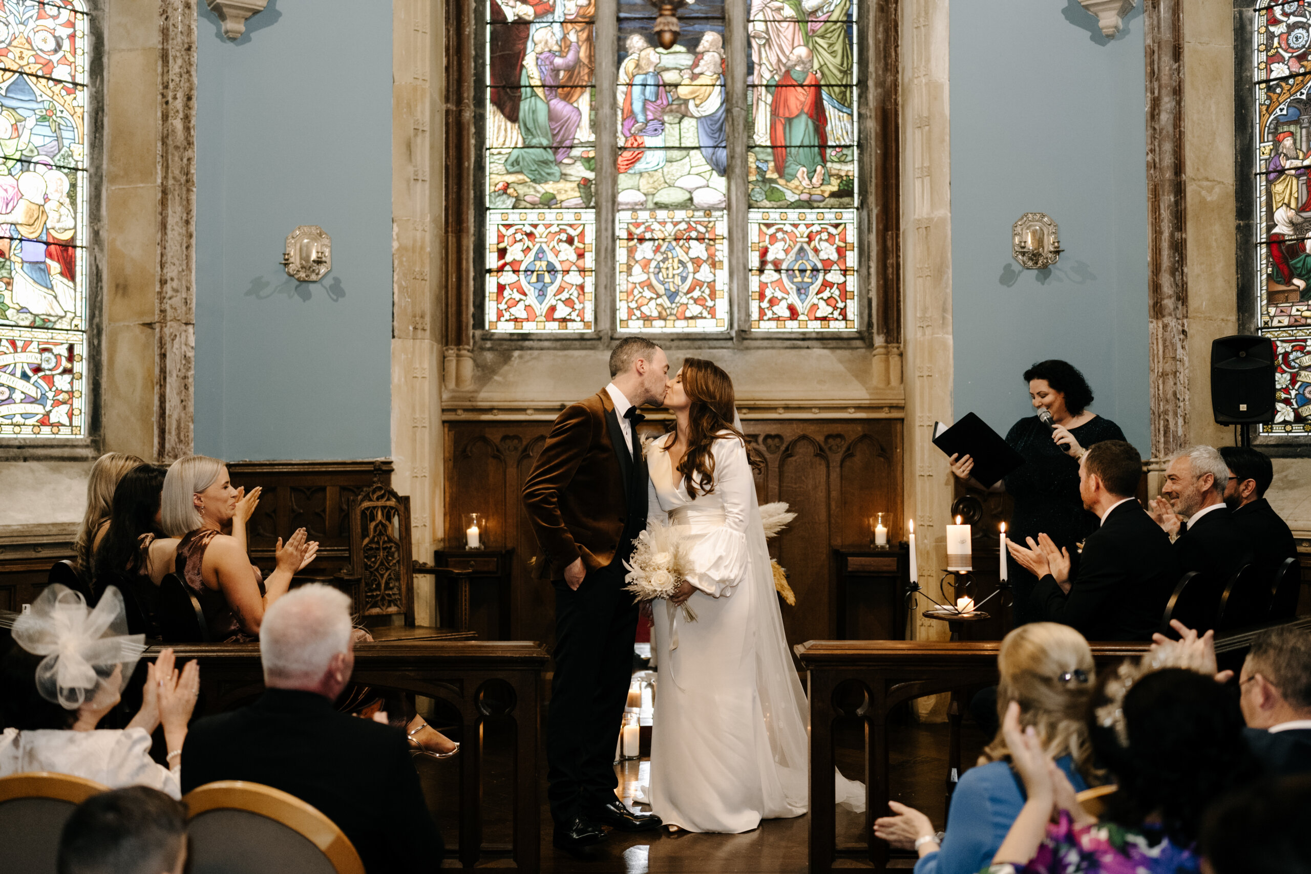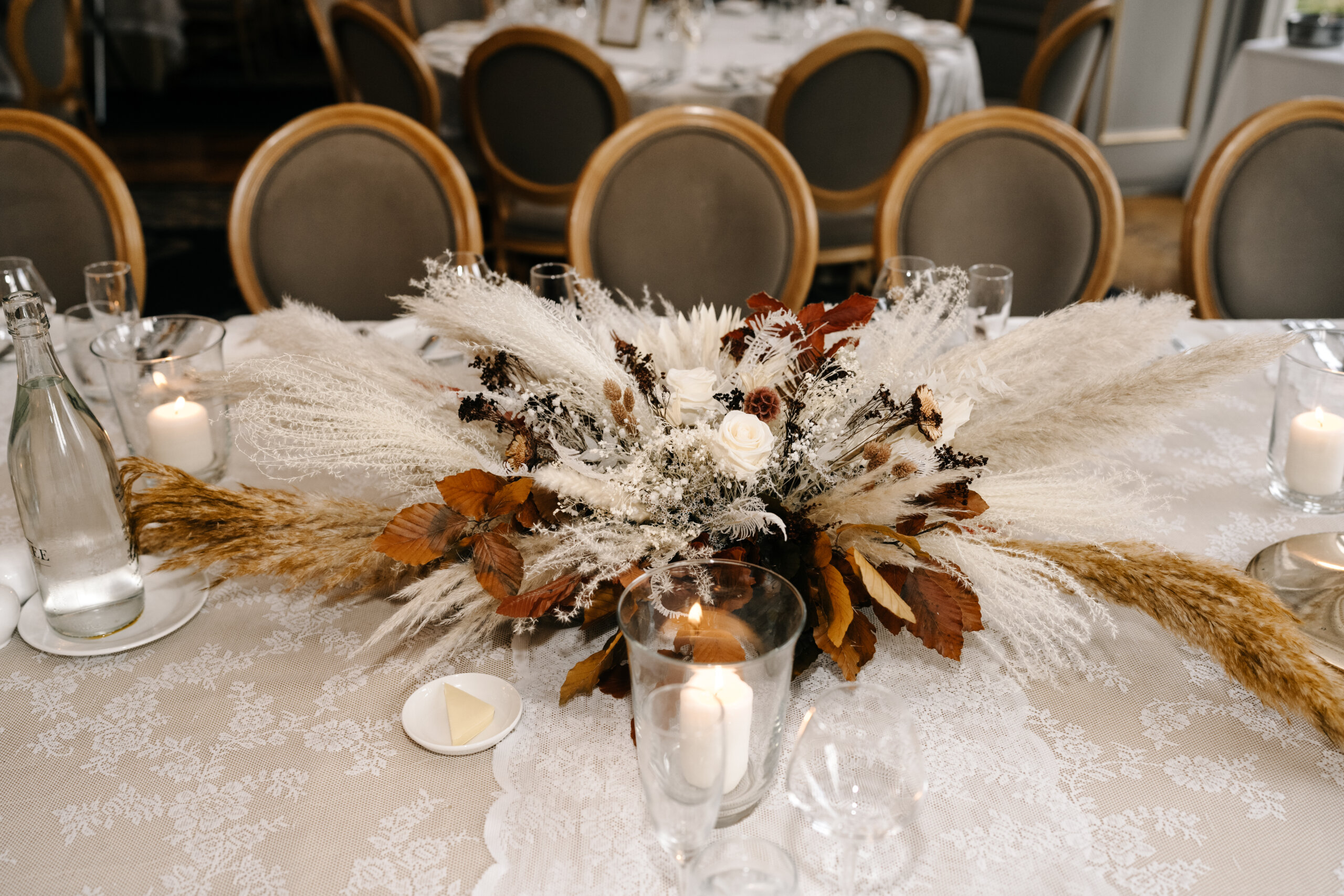 For the ceremony, I kept it very simple with one dried floral arrangement with autumnal tones from Twig and Stem, centred on the altar. I then added lots of clear glass lanterns with pillar candles. Both the floral centrepiece and candles were then used as a beautiful centrepiece for the top table at the reception. I also added personalised vellum wraps from Etsy to the napkins at each place setting. The venue itself is so stunning, especially the dining room; it really didn’t need much added decor.