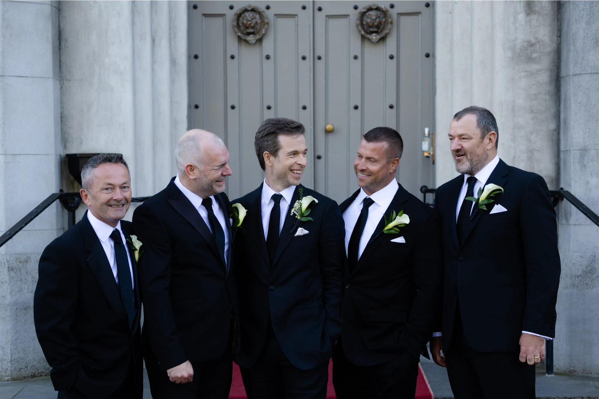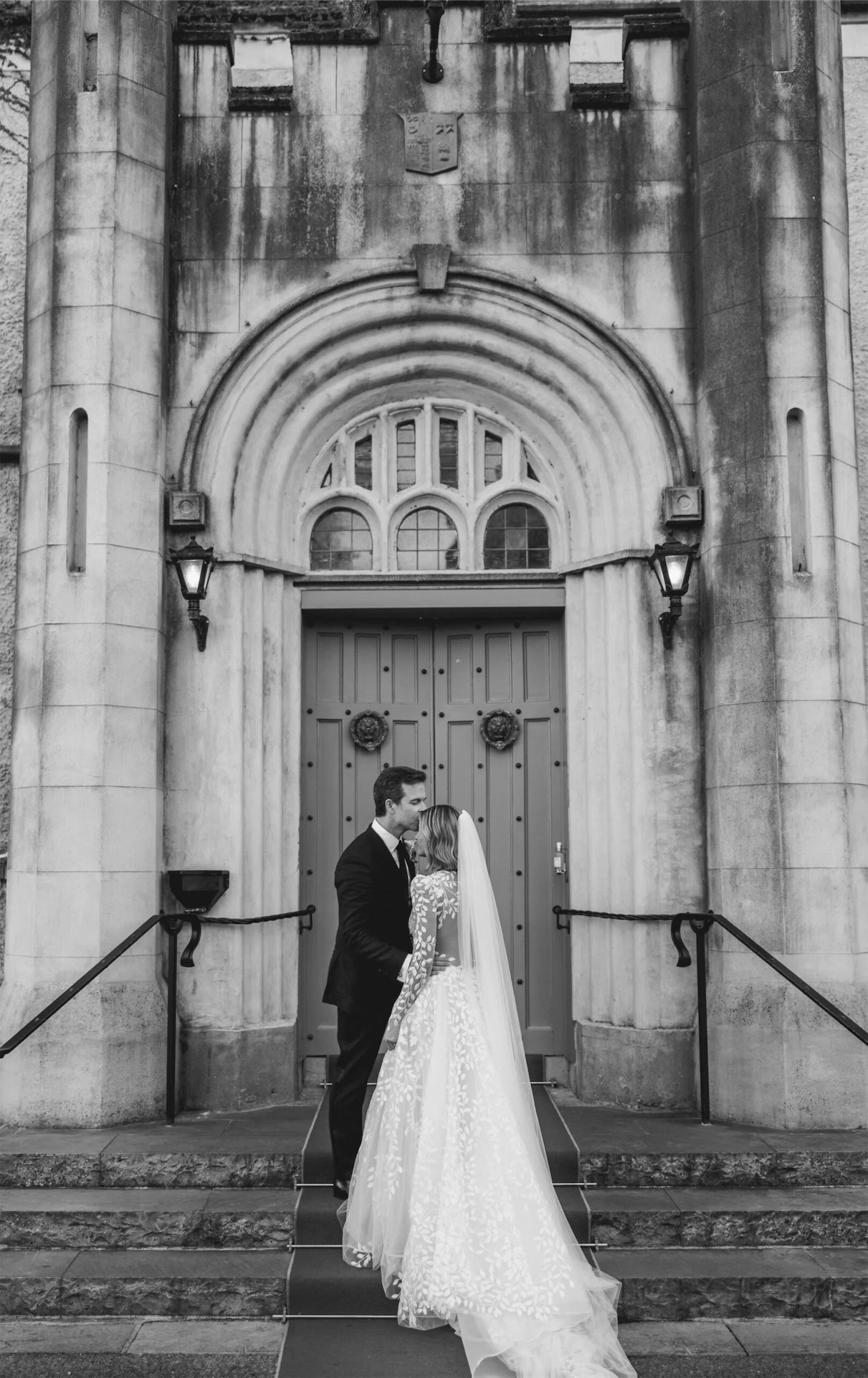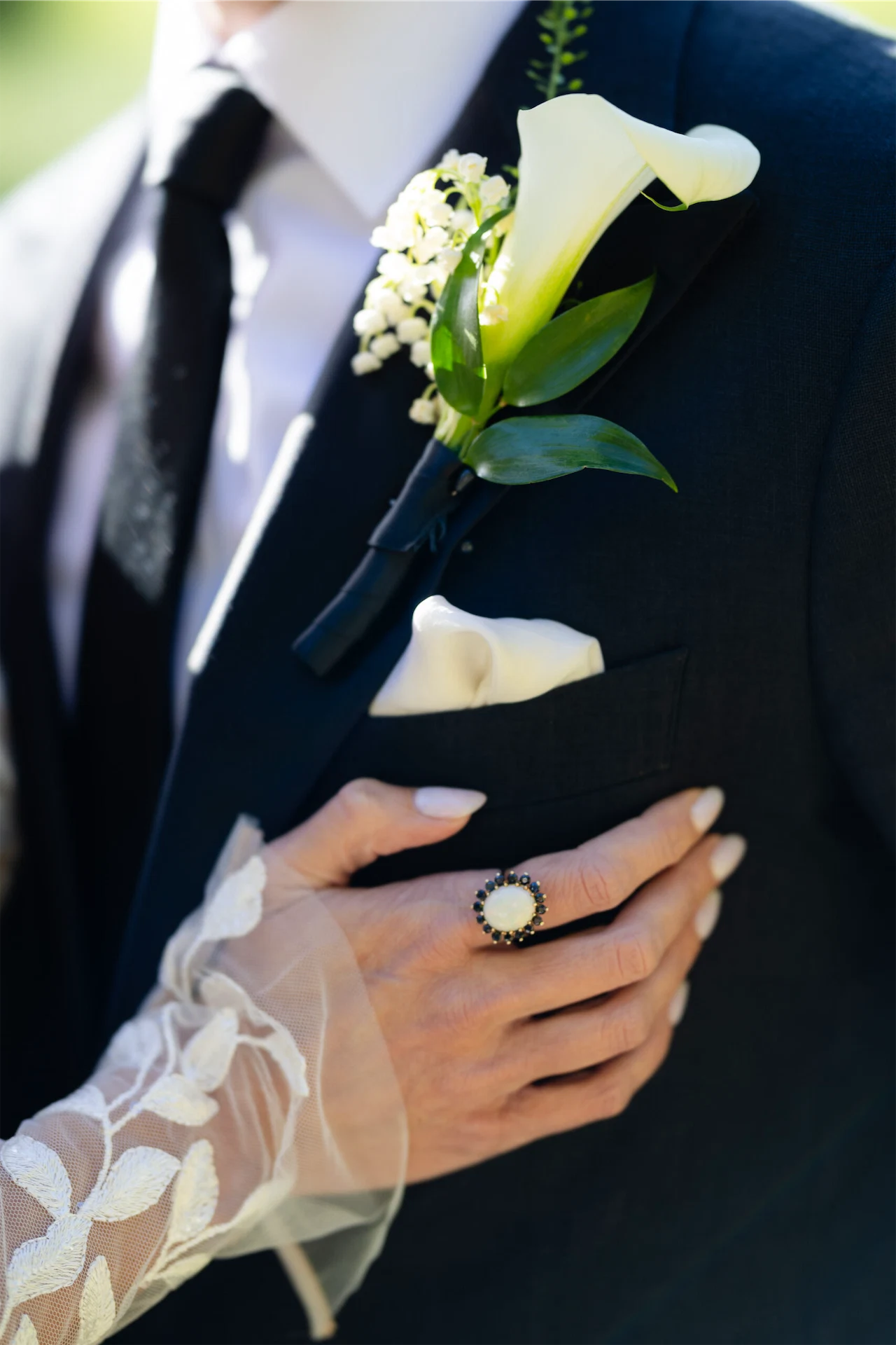 Greg wore a custom black Irish linen tuxedo by Proper Cloth, celebrating his Irish heritage with a modern twist. Each accessory held sentimental value, honouring loved ones who had passed — I wore Gregory’s mother’s engagement ring, his grandmother’s opal, and my own grandmother’s angel pin, secured to the ribbon of my bouquet. Greg wore his late friend Christo’s pocket square and his father’s cufflinks, while his boutonniere included lily of the valley, his mother’s favourite flower, making his attire profoundly personal.
