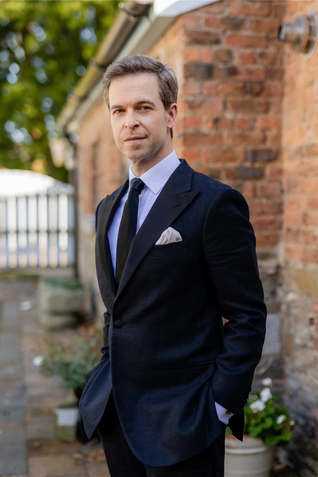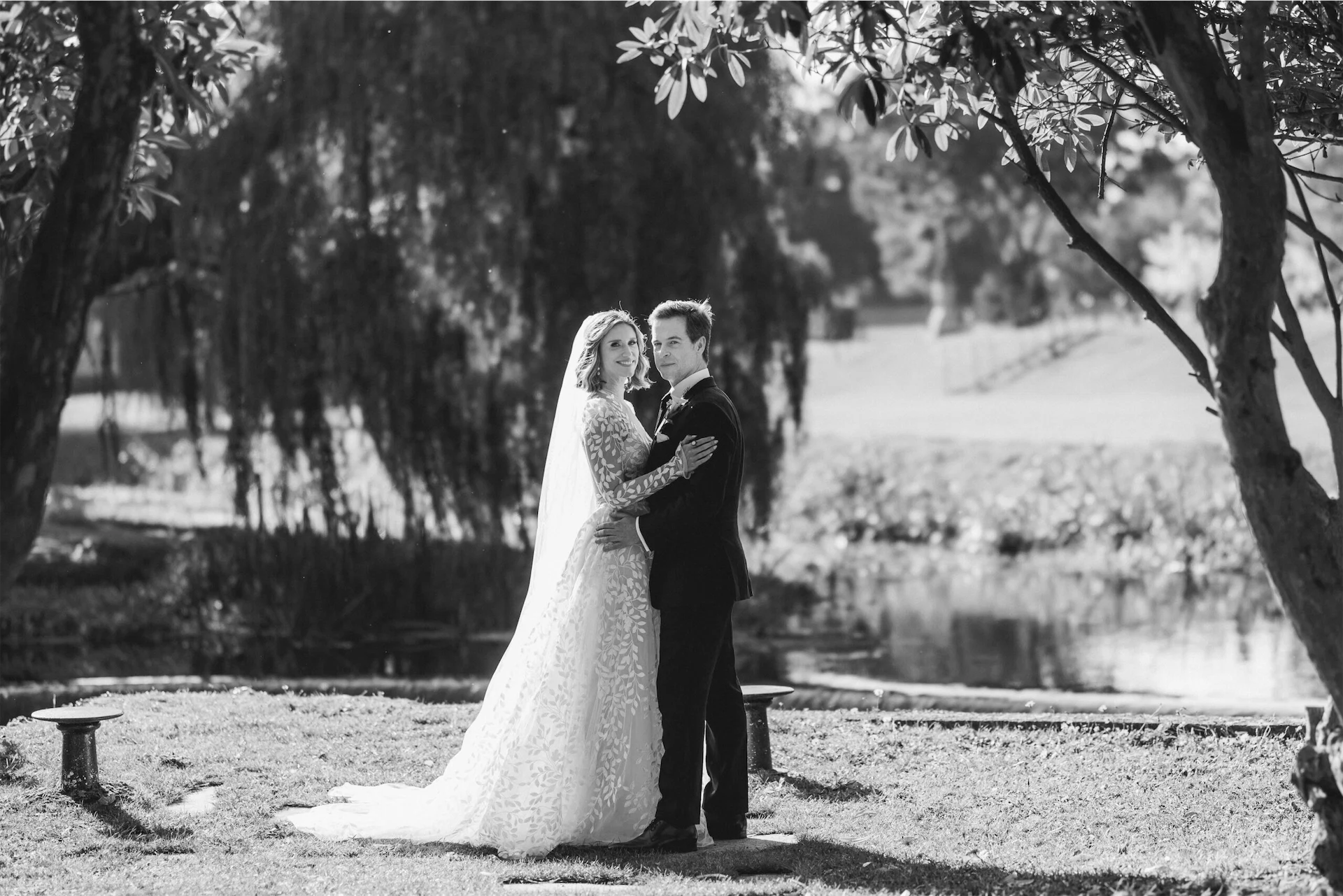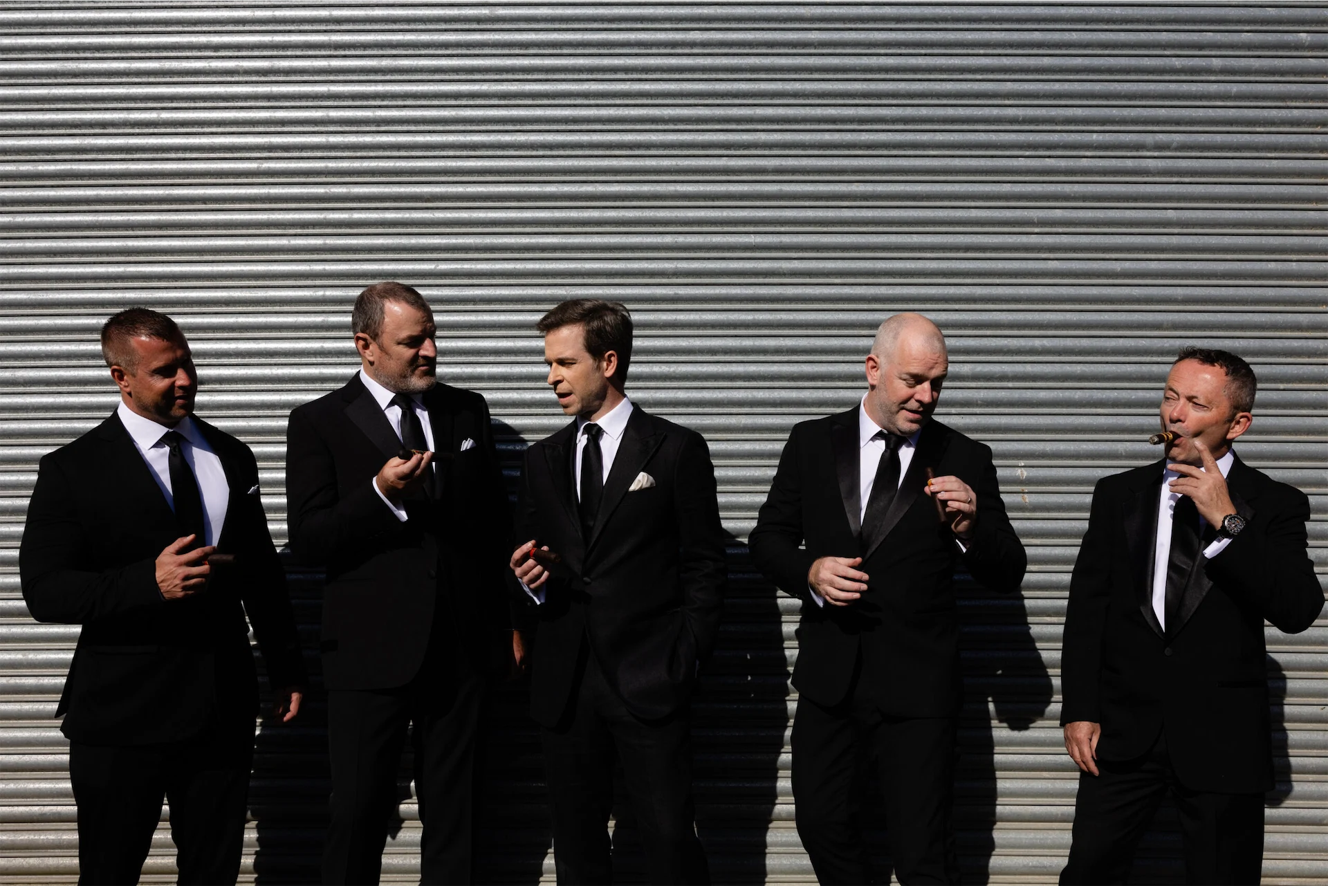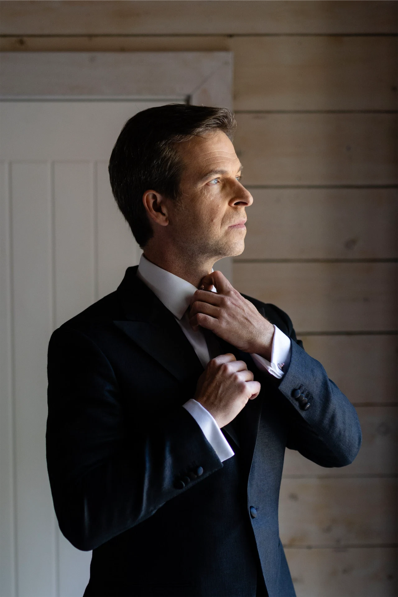 Greg wore a custom black Irish linen tuxedo by Proper Cloth, celebrating his Irish heritage with a modern twist. Each accessory held sentimental value, honouring loved ones who had passed — I wore Gregory’s mother’s engagement ring, his grandmother’s opal, and my own grandmother’s angel pin, secured to the ribbon of my bouquet. Greg wore his late friend Christo’s pocket square and his father’s cufflinks, while his boutonniere included lily of the valley, his mother’s favourite flower, making his attire profoundly personal.