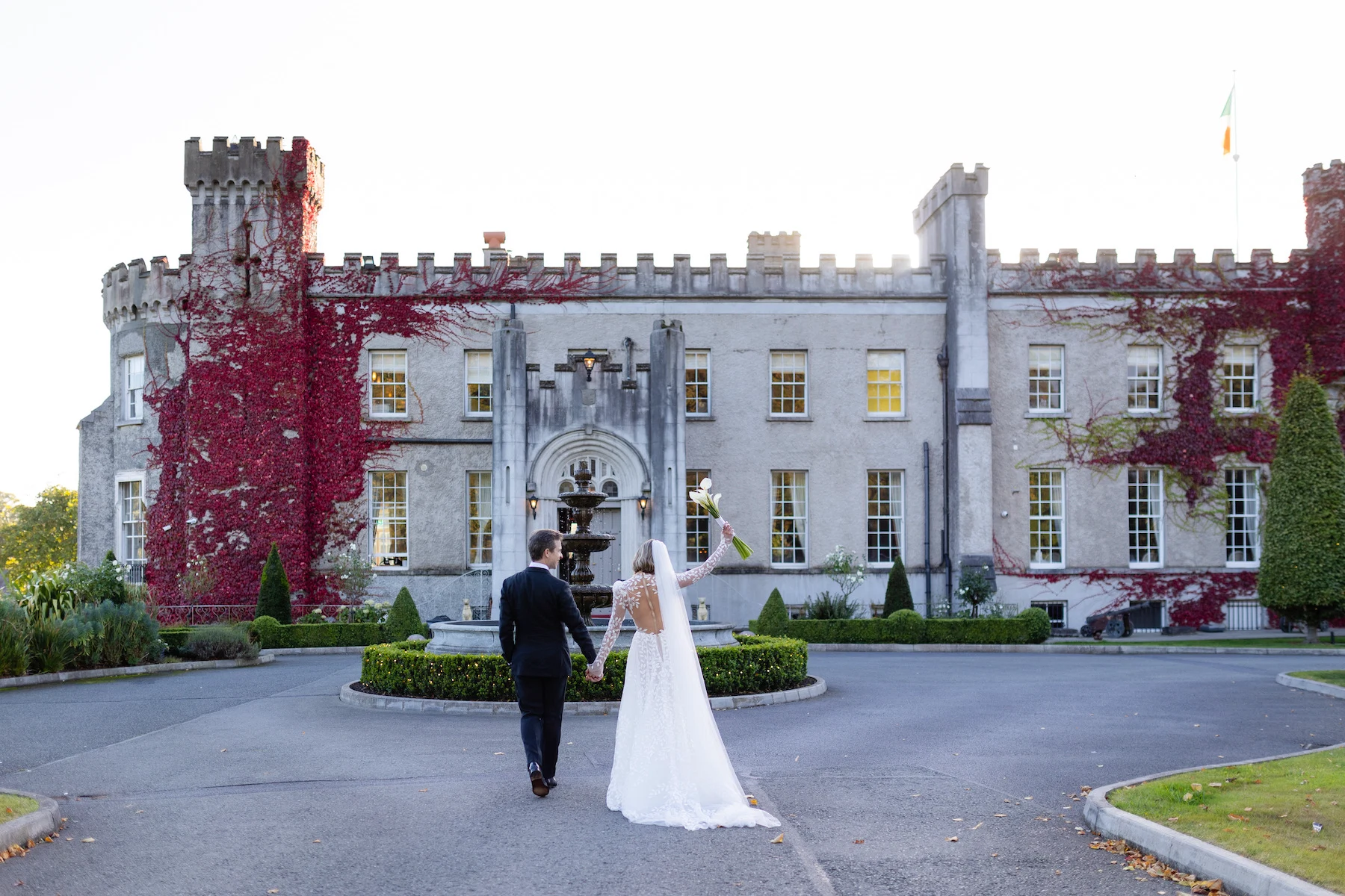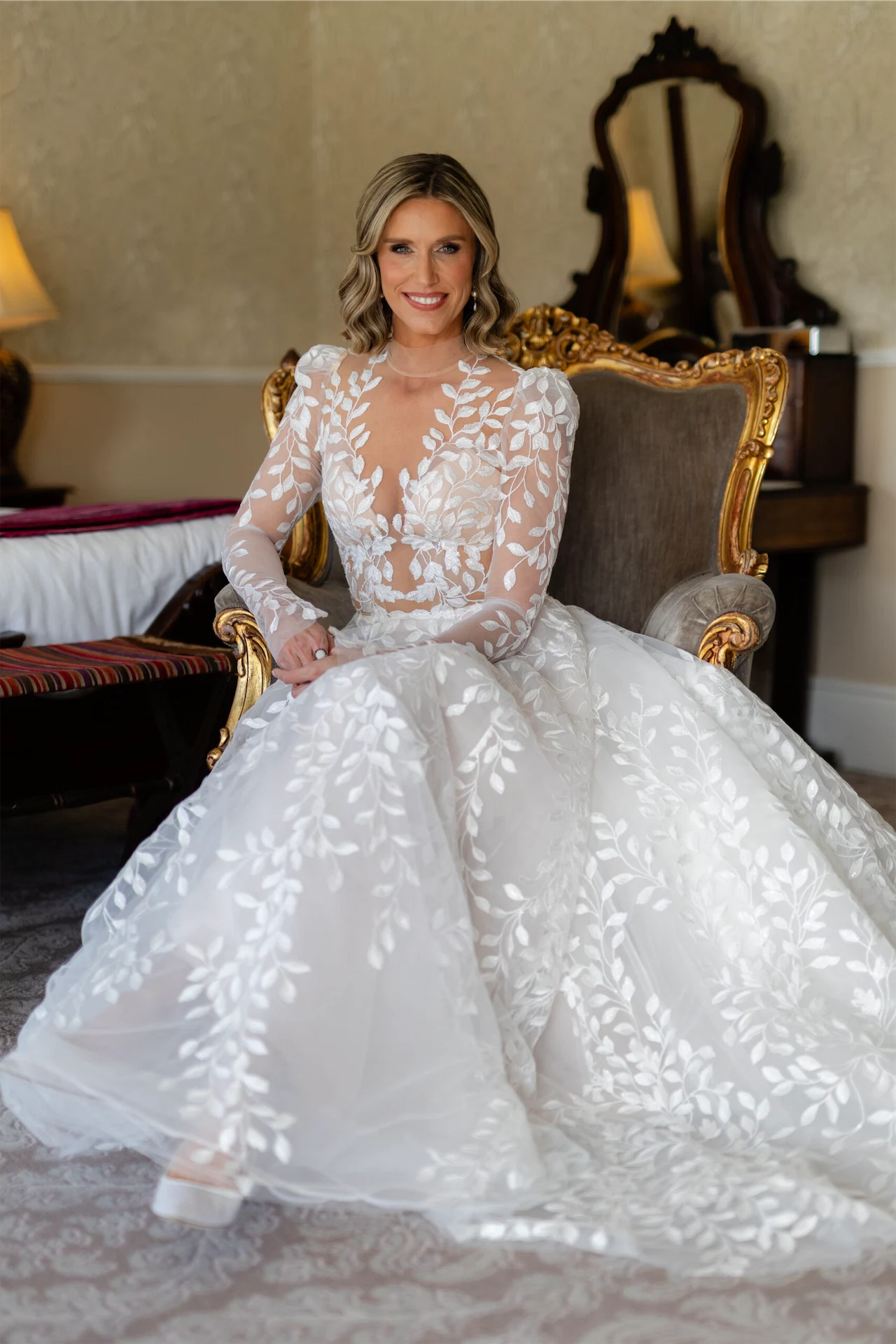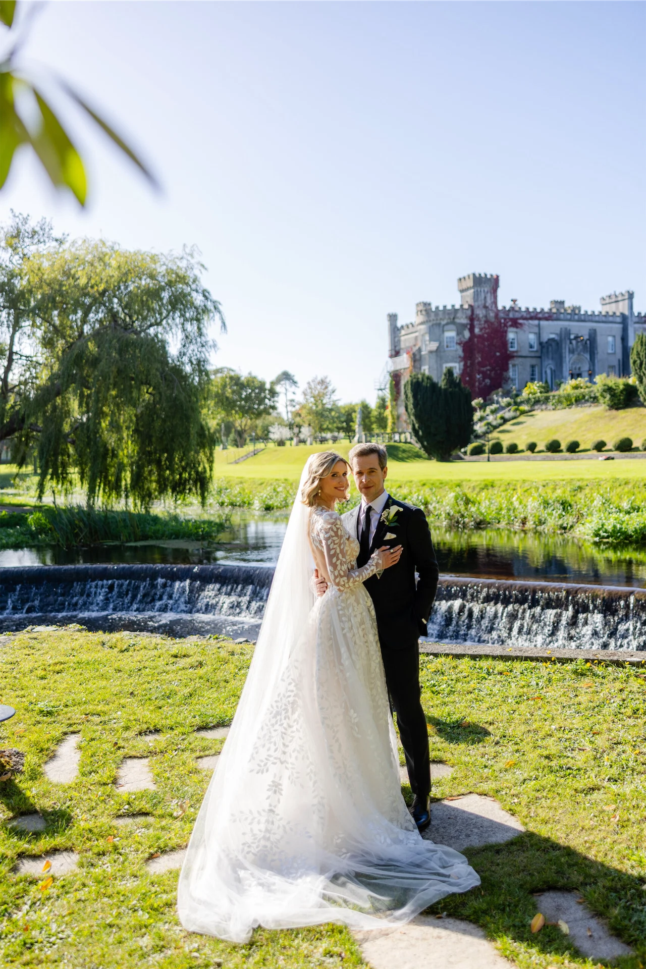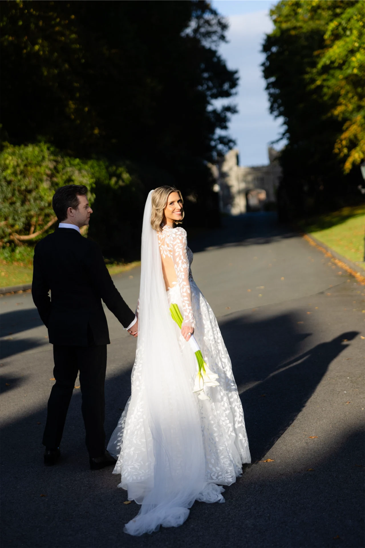 I chose a Pnina Tornai gown adorned with intricate lace detailing, beautifully complementing the timeless elegance of Bellingham Castle. The dress embodied both sophistication and romance, with delicate appliqué that mirrored the lush greenery surrounding the castle.