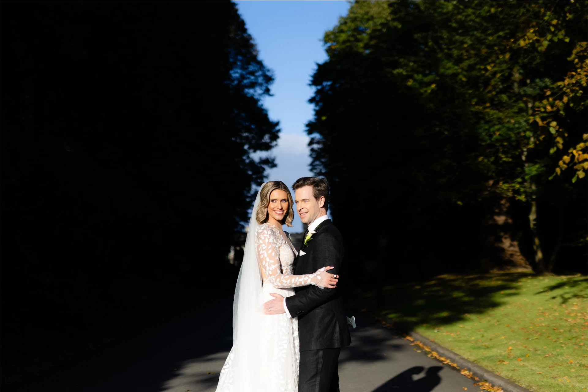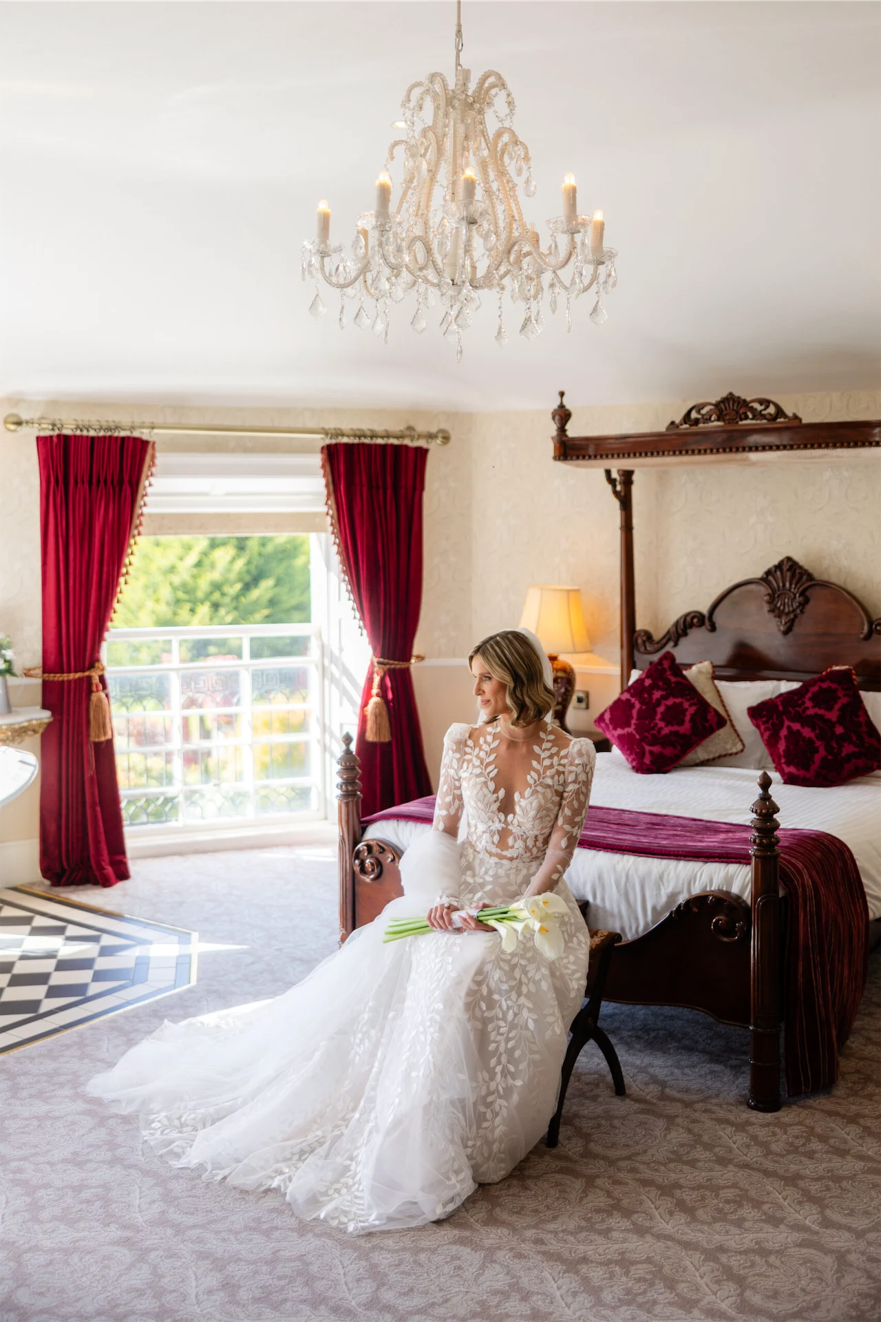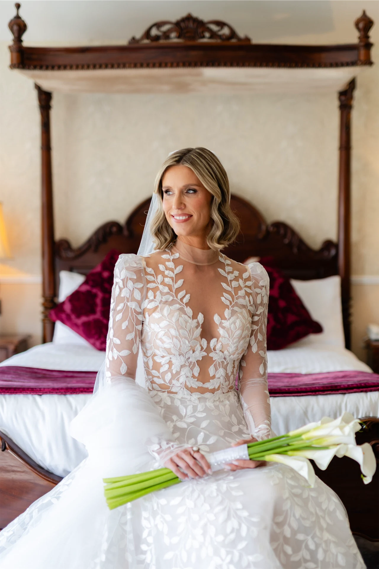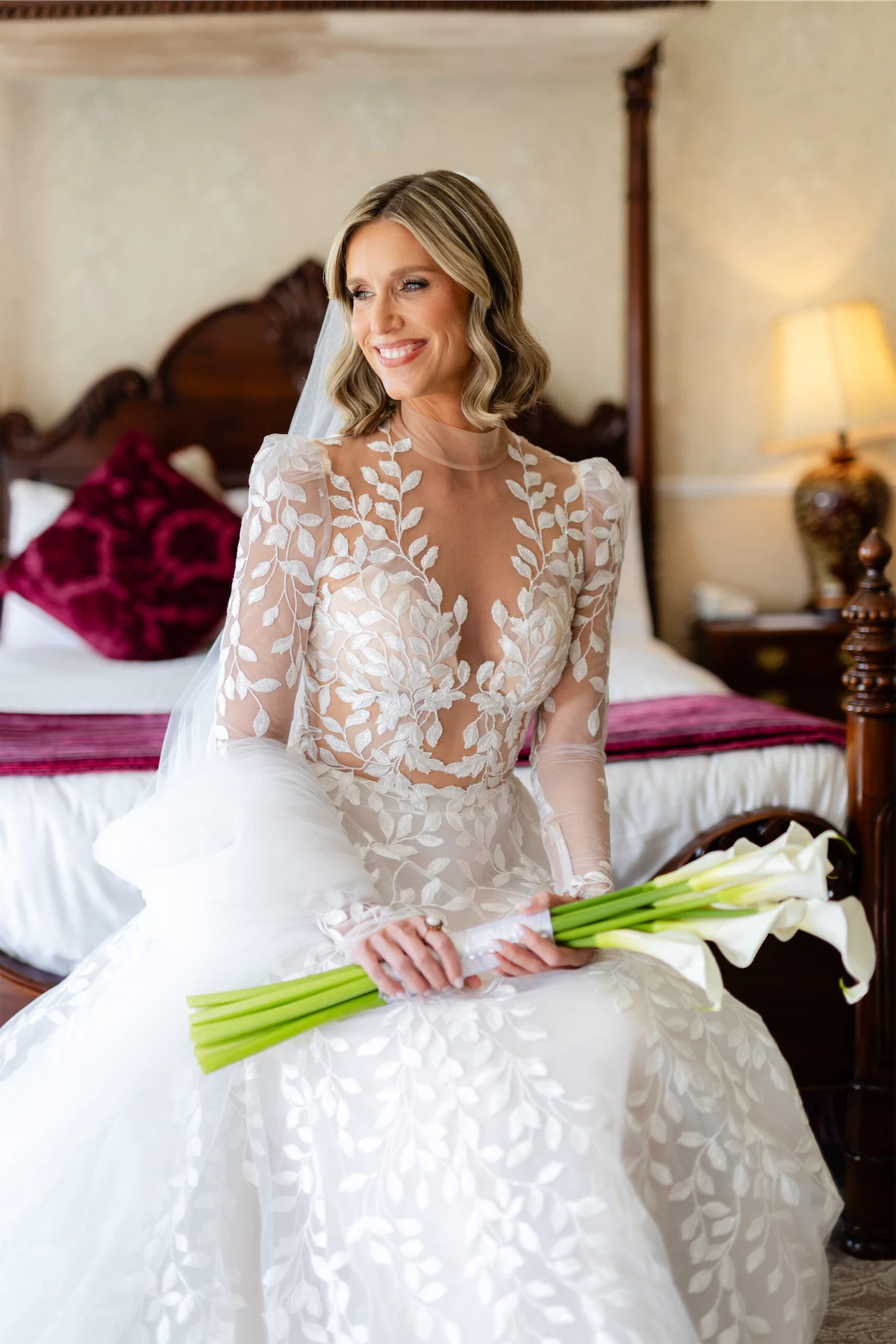 I chose a Pnina Tornai gown adorned with intricate lace detailing, beautifully complementing the timeless elegance of Bellingham Castle. The dress embodied both sophistication and romance, with delicate appliqué that mirrored the lush greenery surrounding the castle.