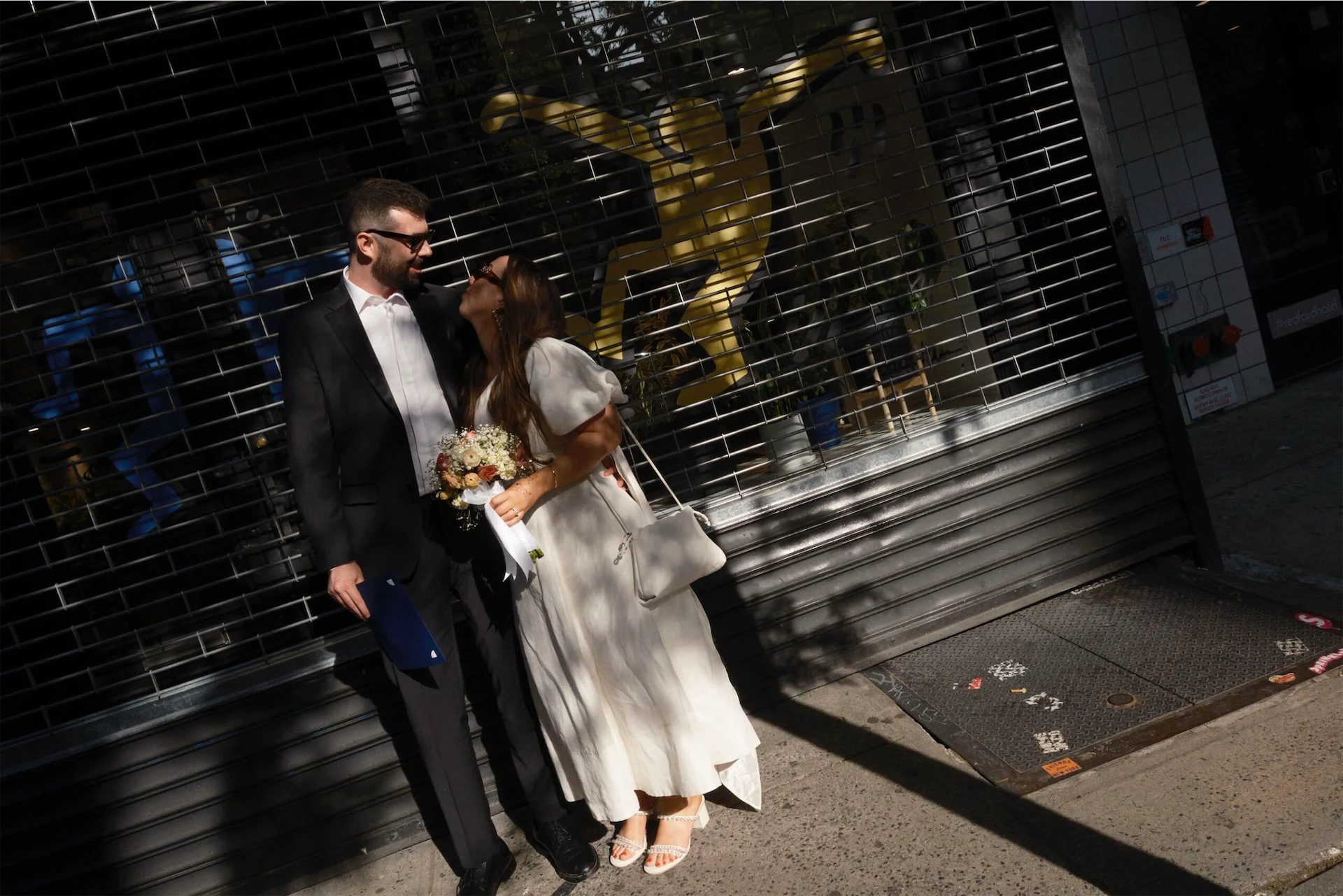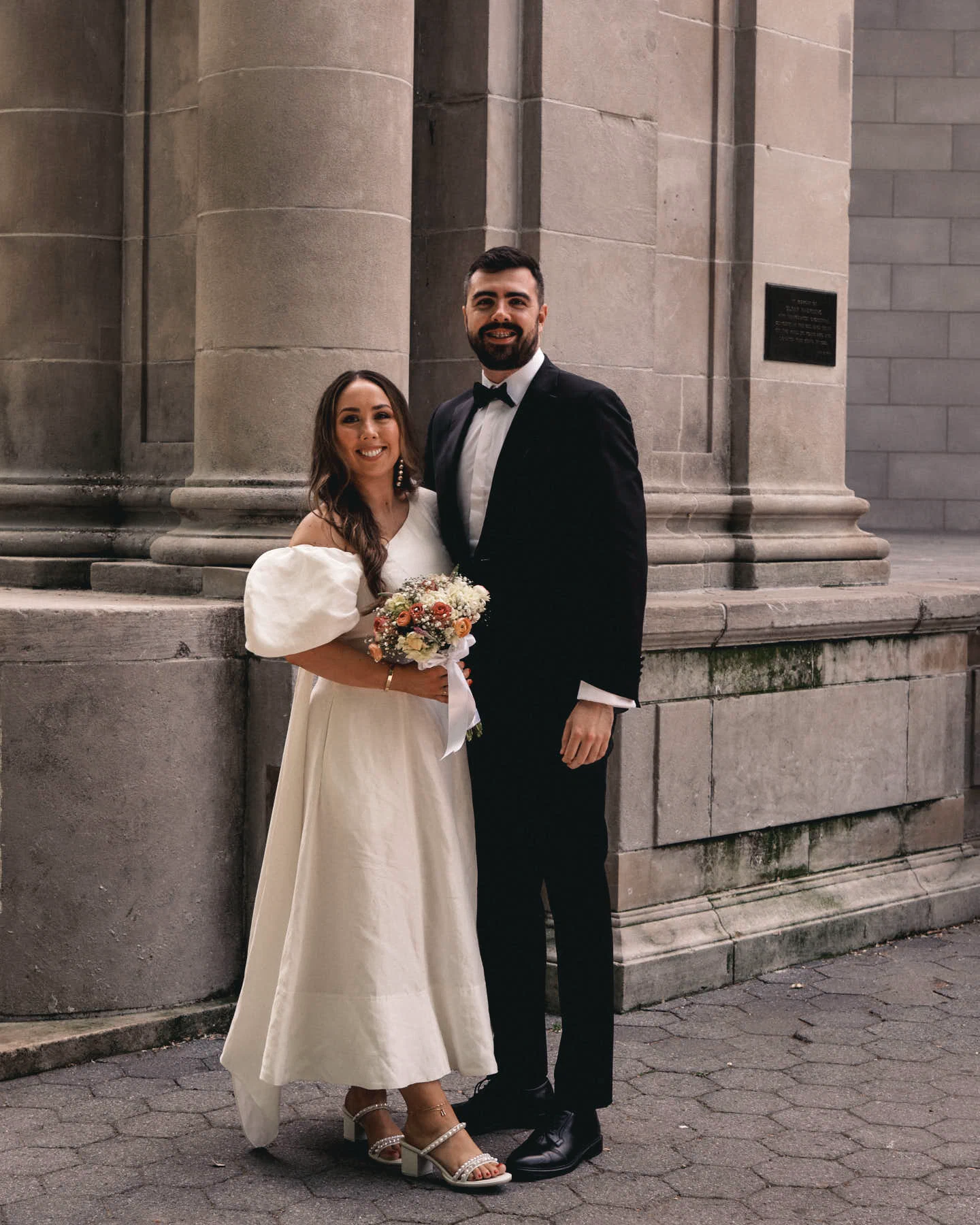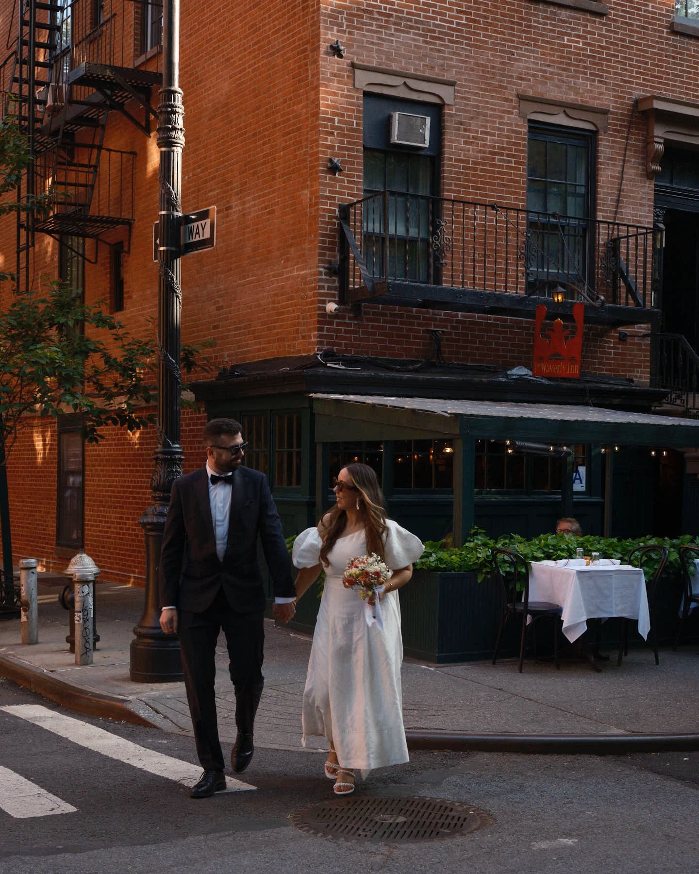 Wedding dress: Aje. Bride’s shoes: Dolce Vita. Bride’s jewellery: Magda Butrym. Groom’s suit: Moss Bros. Groom’s tie: Dior. Groom’s shirt: Remus Uomo. Florist: Bouquet by the beautiful Cira in Wholefoods Columbus Circle. Food & Venue: The Waverly Inn.