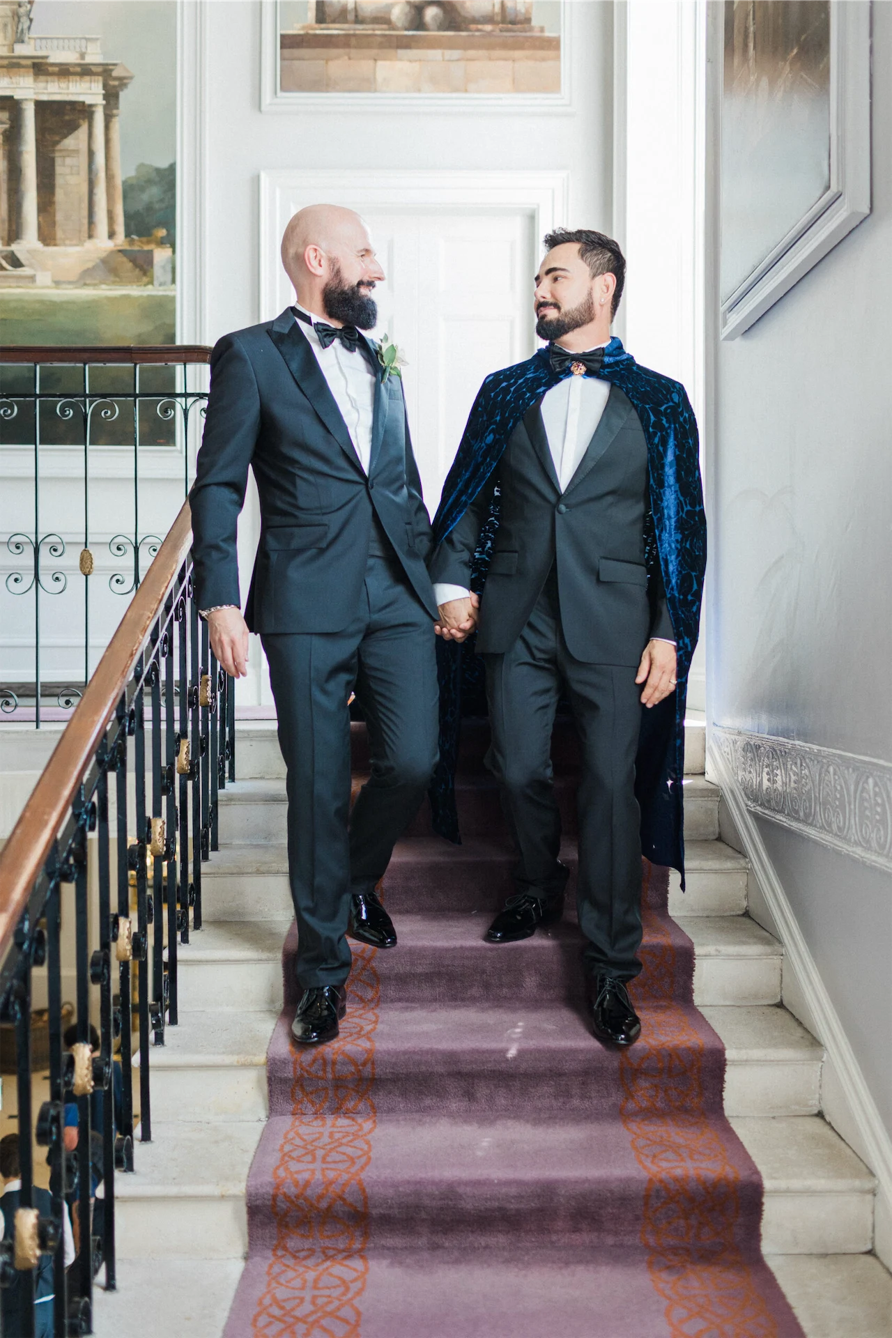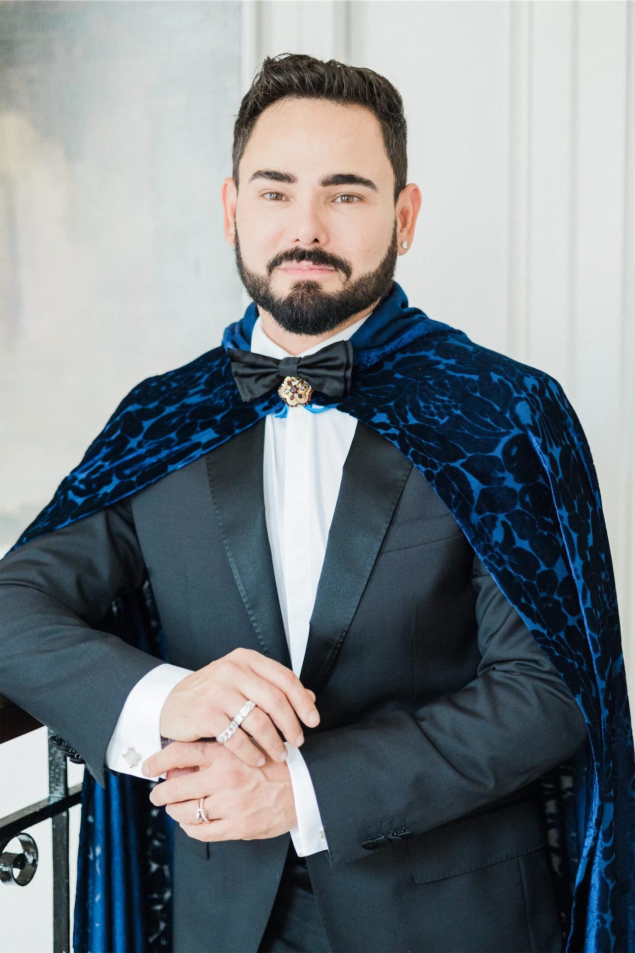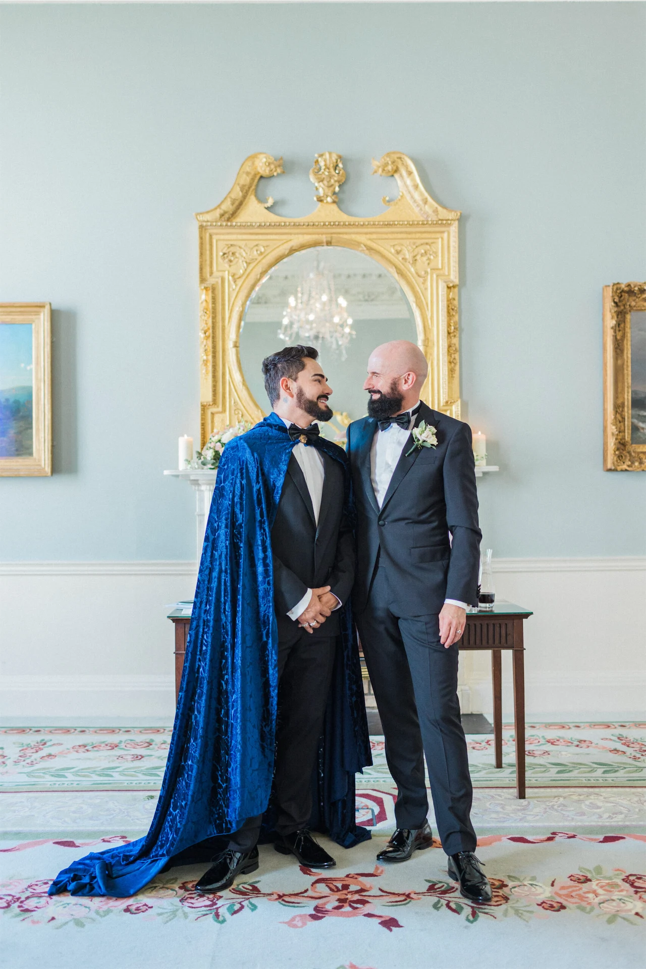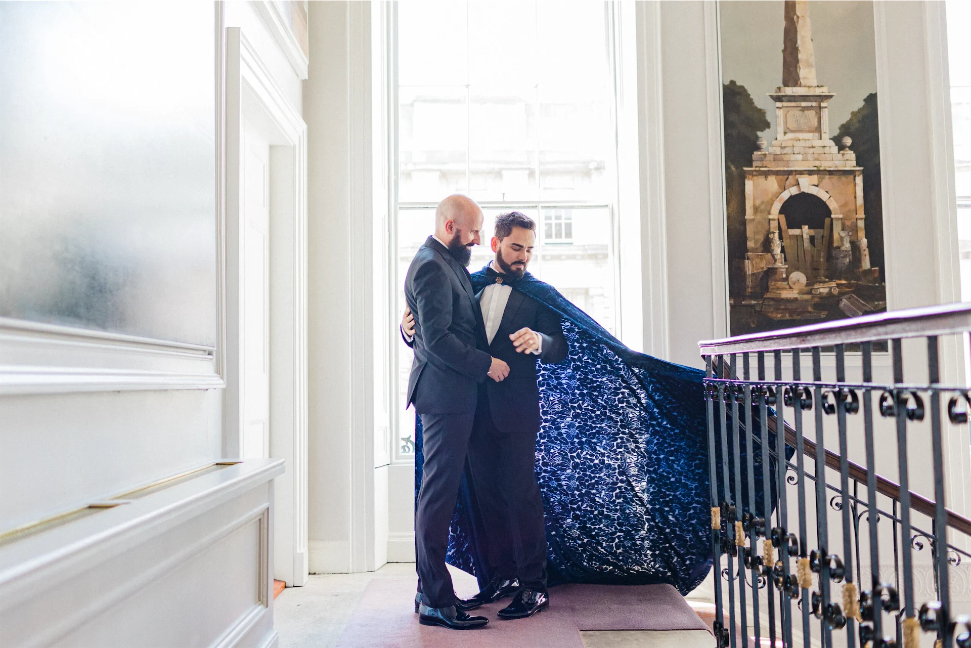 Given the elegant surroundings of The Merrion, a classic and well-tailored tuxedo seemed like the perfect option. We chose Hugo Boss for their full outfits and shoes. However, to add a little extra glamour and presence Hud also opted for a translucent midnight blue cloak from El Costurero Real, Barcelona.