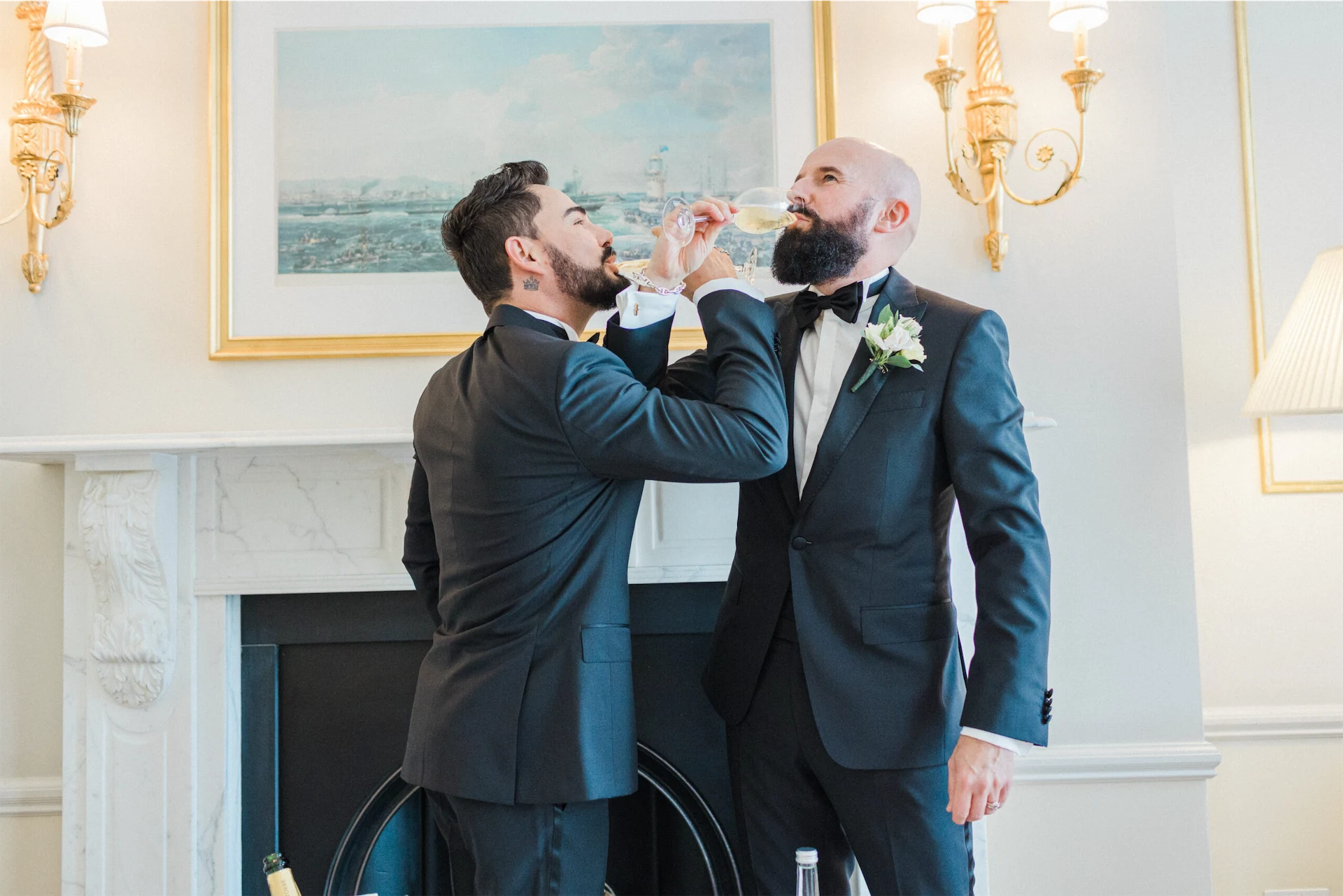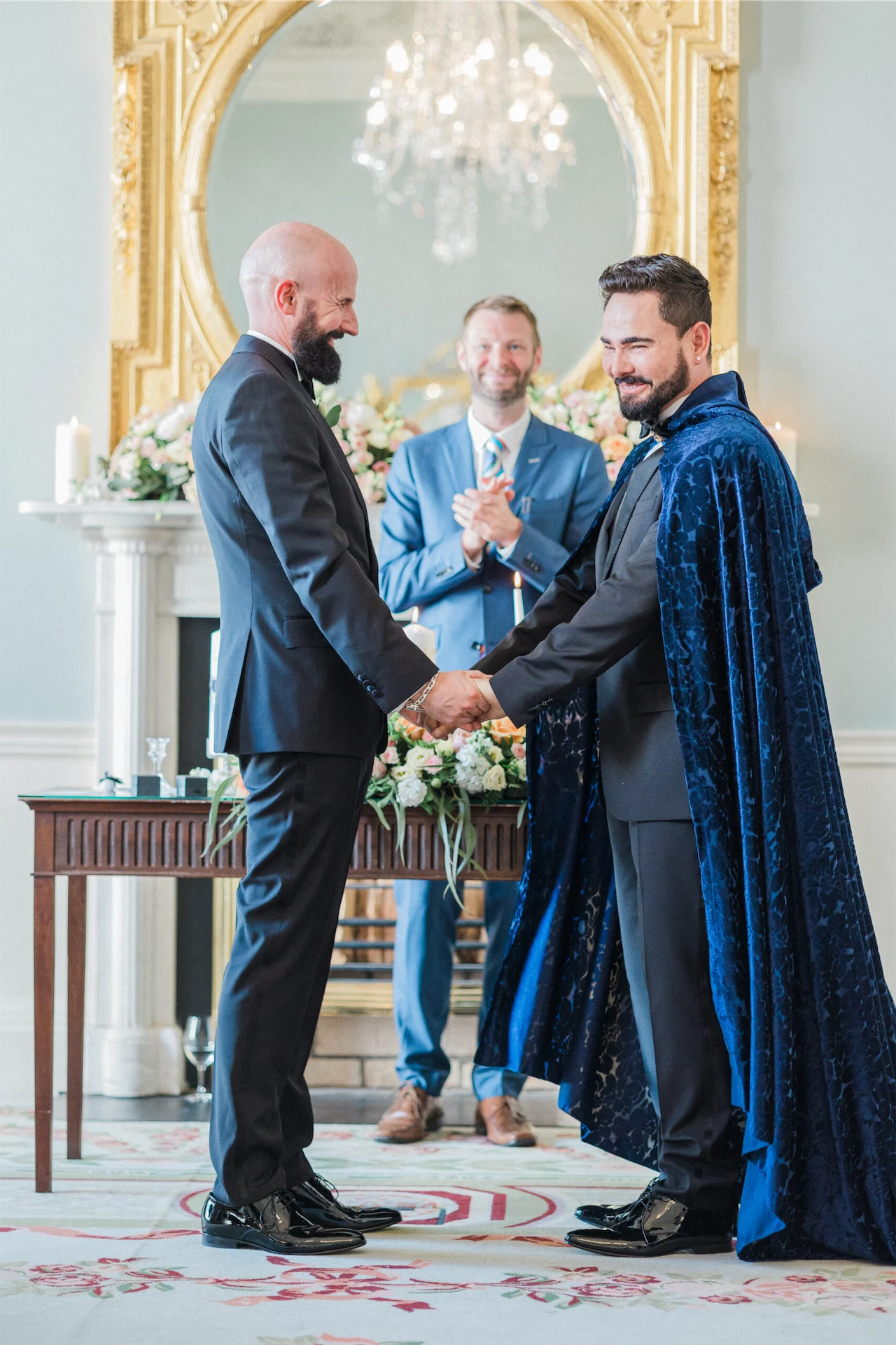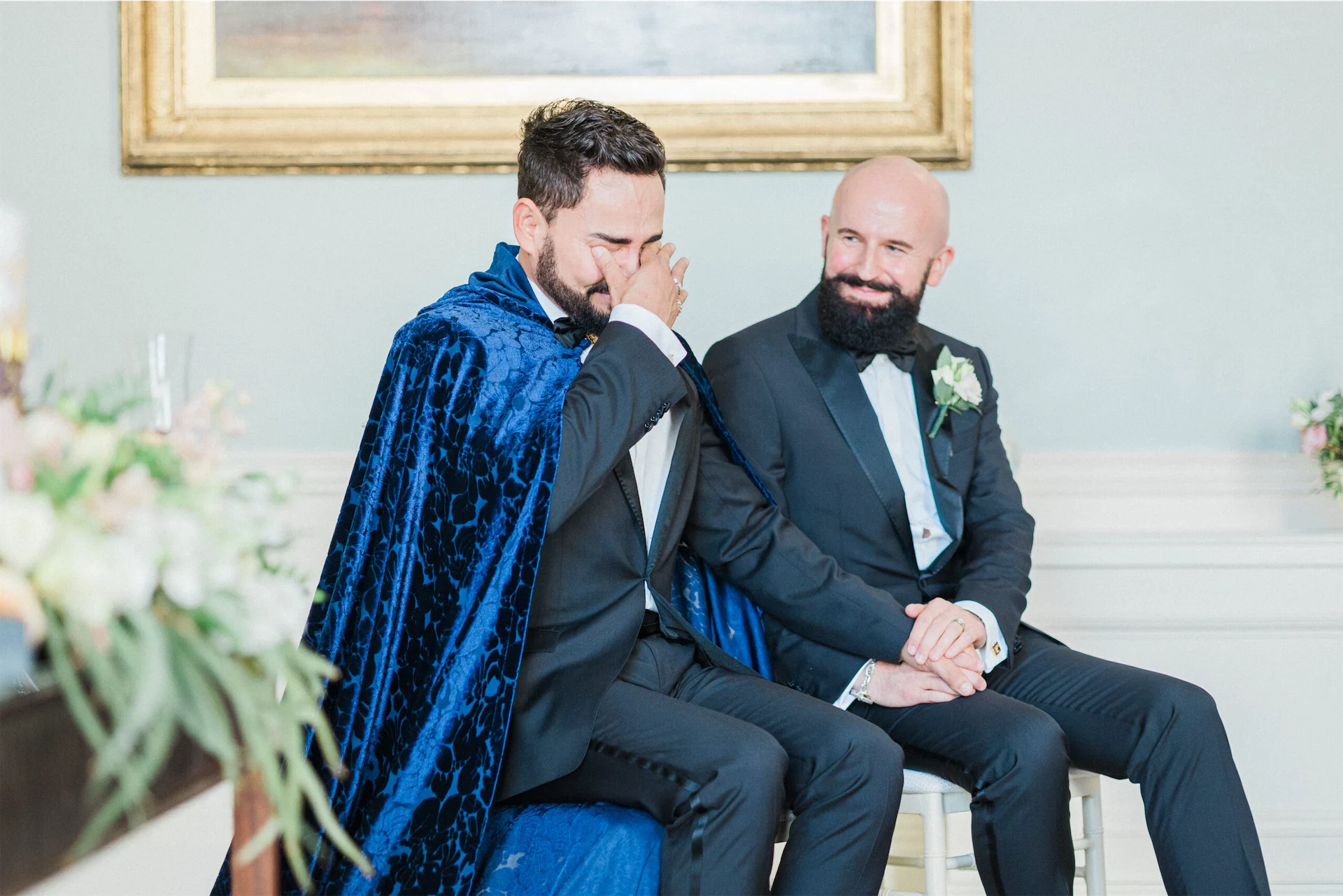 Given the elegant surroundings of The Merrion, a classic and well-tailored tuxedo seemed like the perfect option. We chose Hugo Boss for their full outfits and shoes. However, to add a little extra glamour and presence Hud also opted for a translucent midnight blue cloak from El Costurero Real, Barcelona.