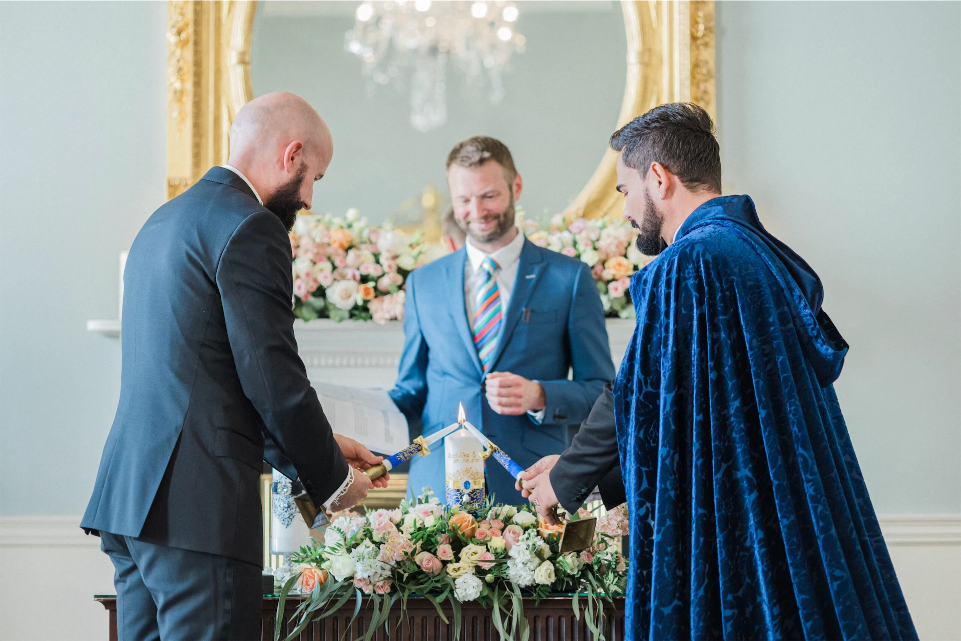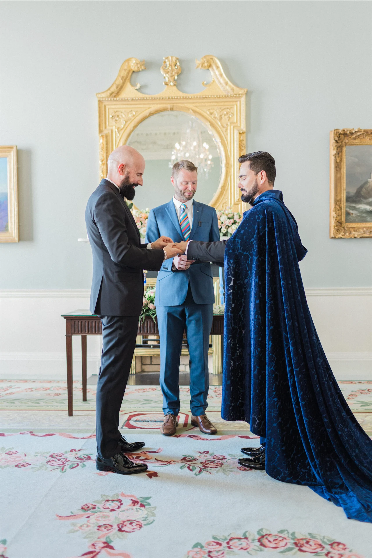 Hud'Alex and John celebrated their big day in the beautiful Georgian setting of The Merrion in Dublin. Coming from different cultures, their ceremony rituals helped unite their blended family and was filled with fashionable touches – including a gorgeous midnight blue cloak.