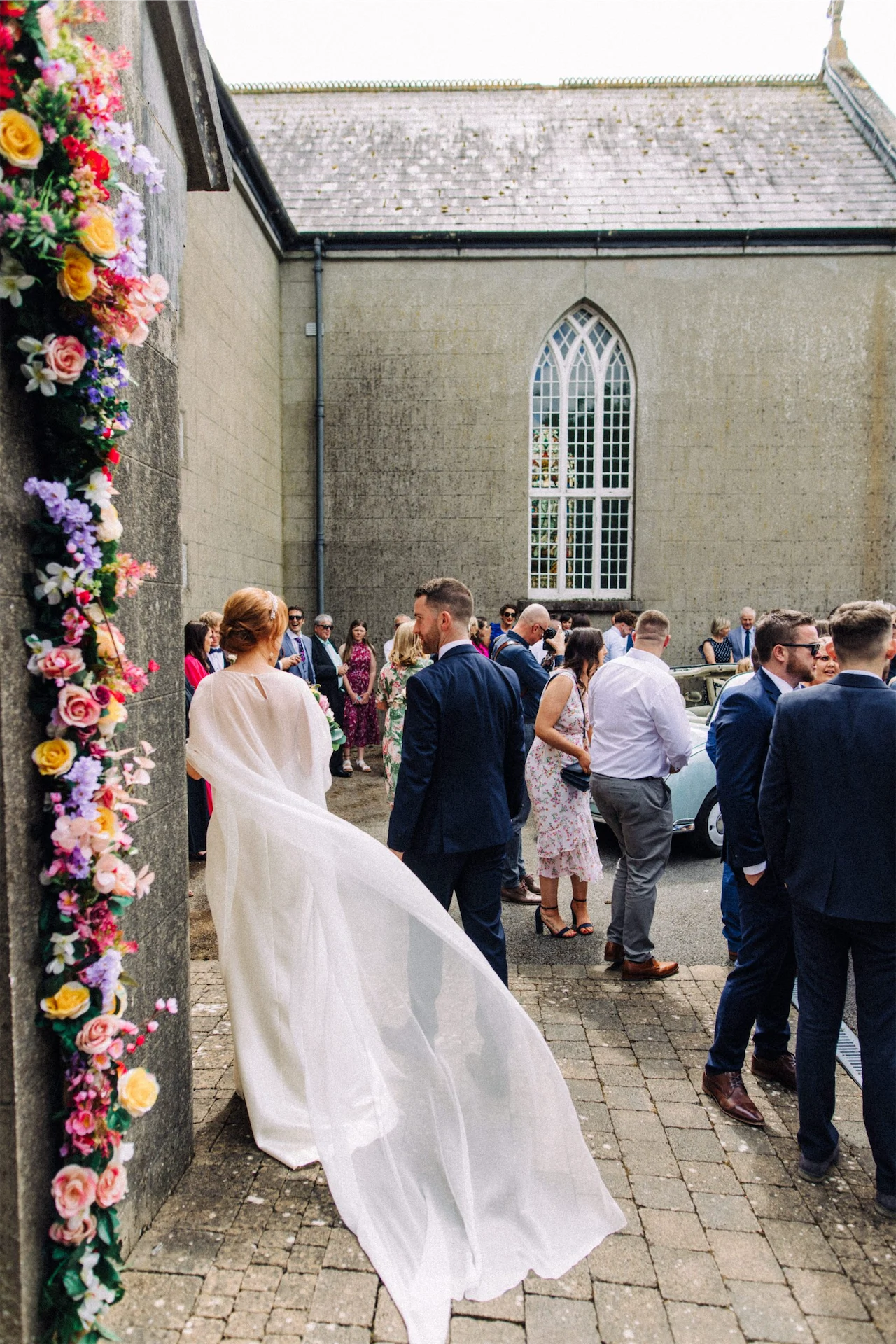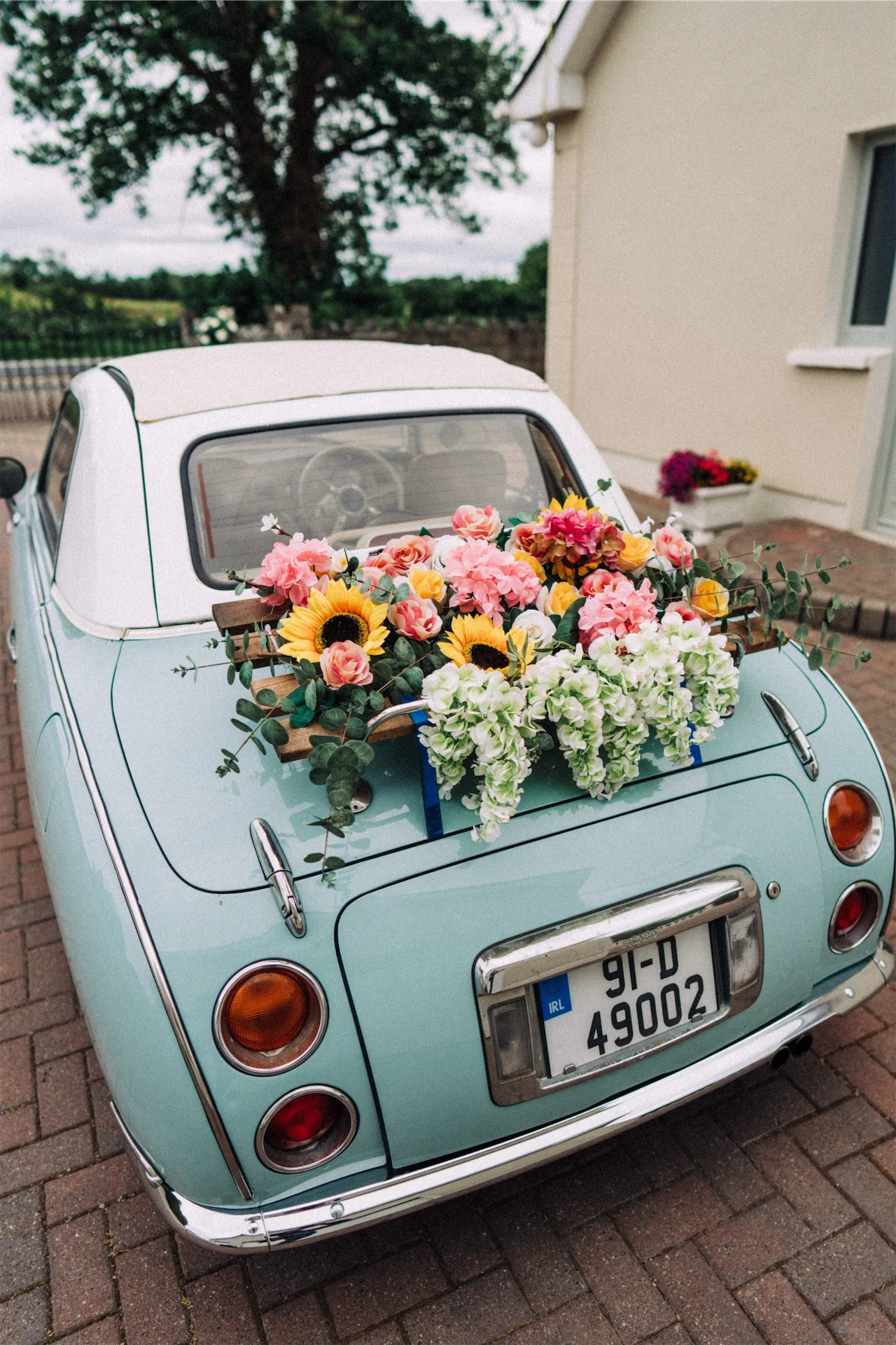 Paula and Patrick have always been creative and love to take on DIY projects, so they made the flower arch and arranged it around the church door as well as the flower arrangement on the back of the Nissan Figaro. Bouquets and alter flowers were arranged by Flower Innovations in Kells, Co Meath, who followed the brief perfectly – summery, youthful and colourful.