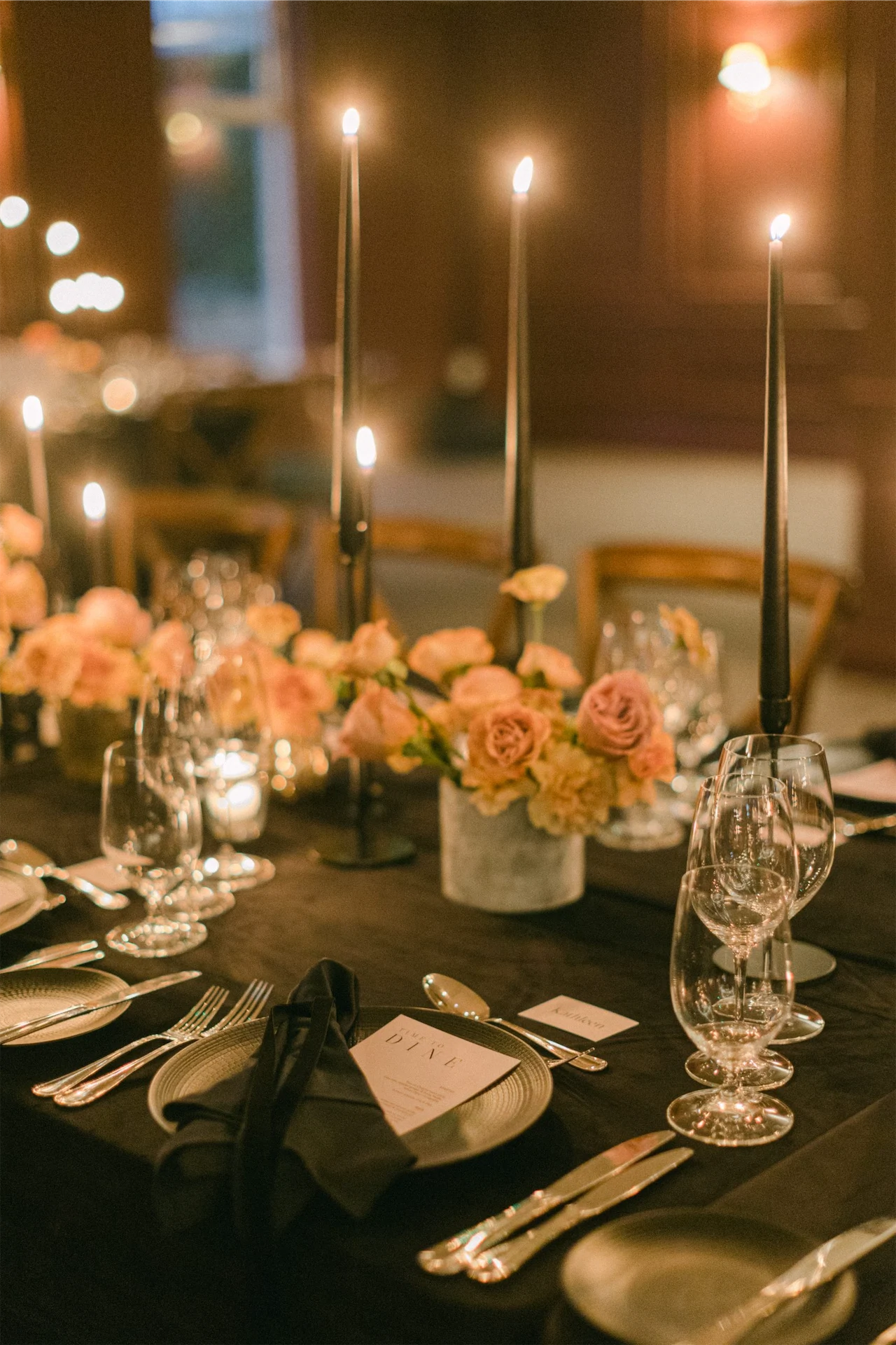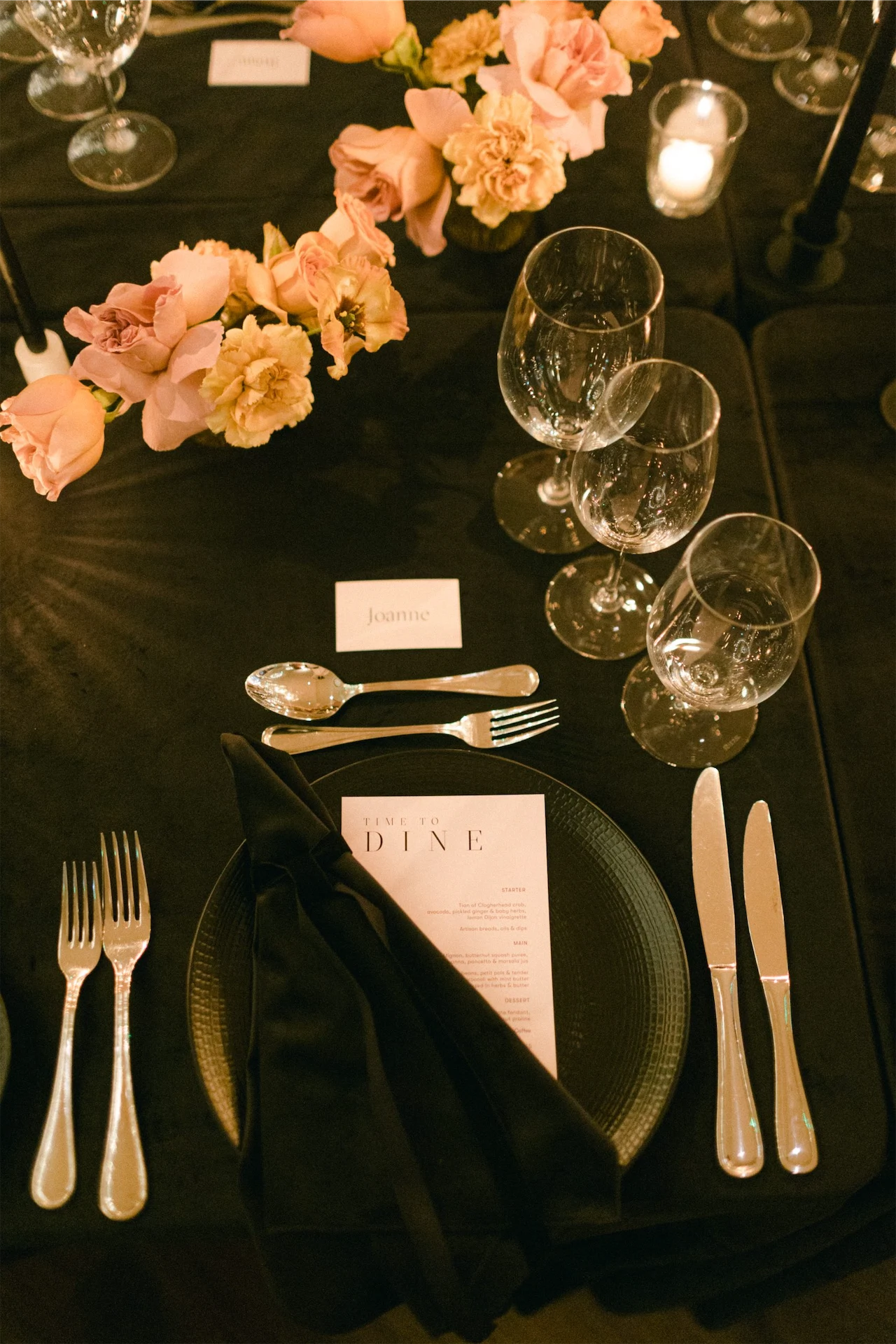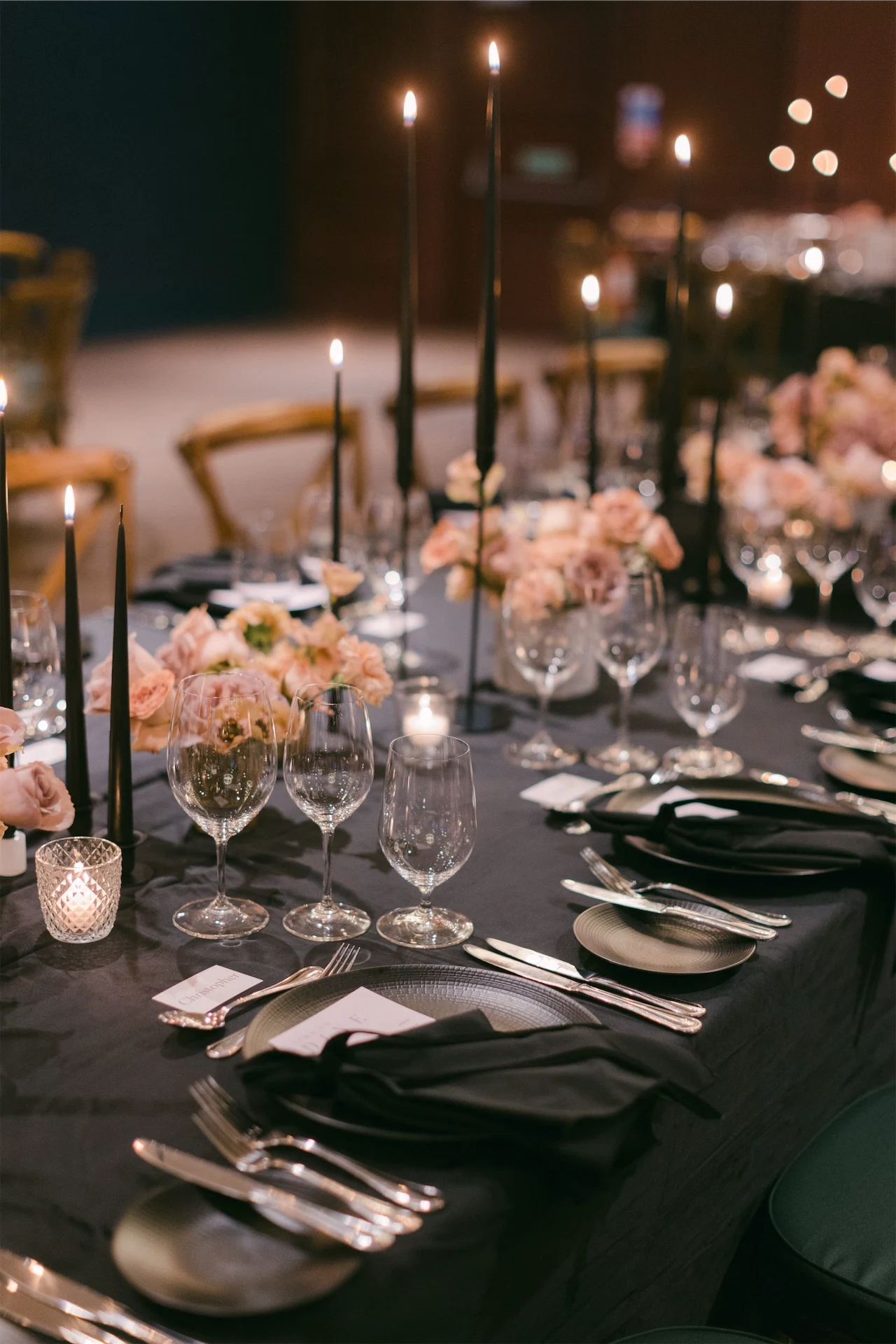 It was all about the decor and styling for me! Everything from the flowers and stationery, to the bridesmaid dresses and tabletop details was deeply considered. We decided on an all-black look for our dining room. Everything was black – the candles, candle holders, plates, velvet napkin and table linen.