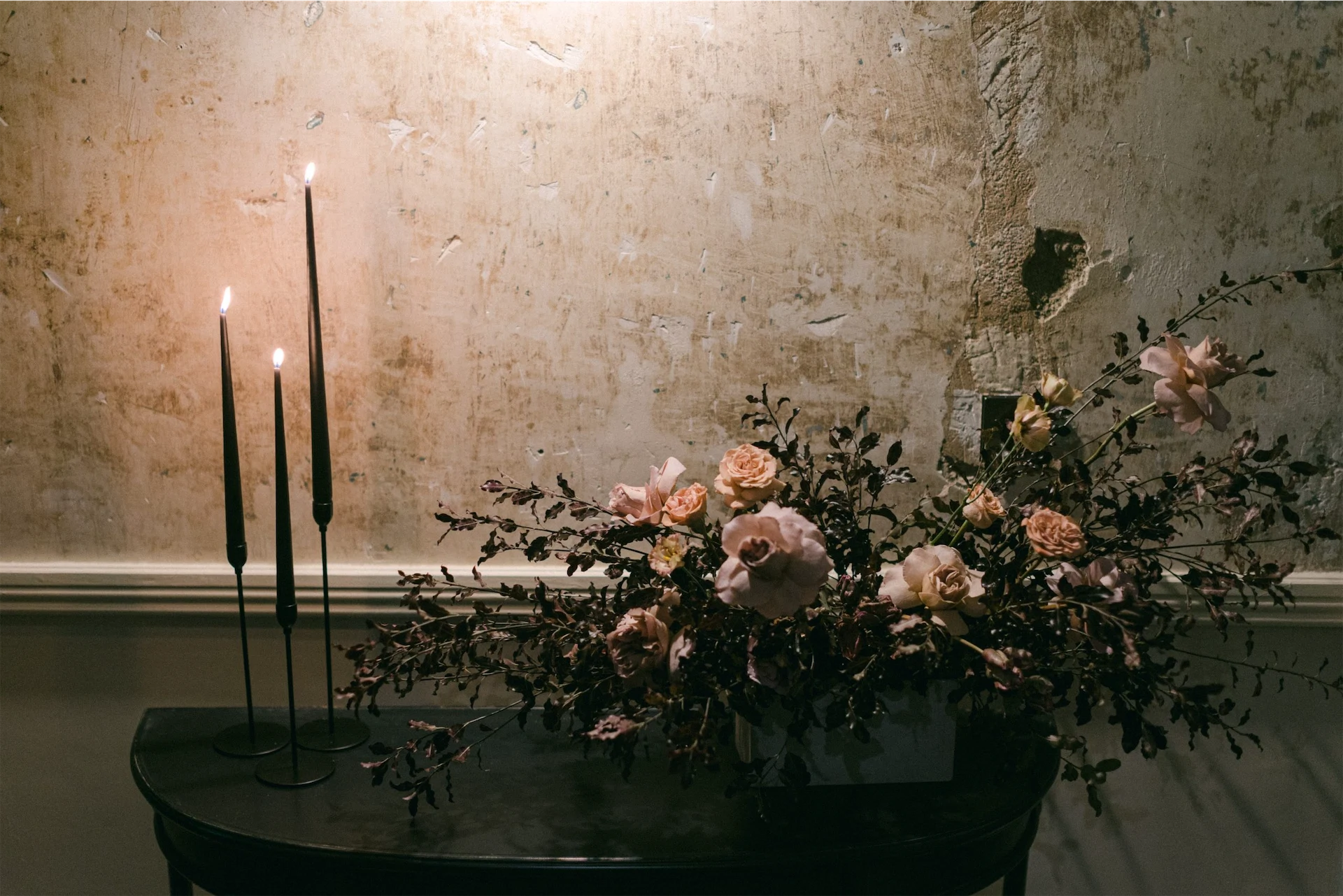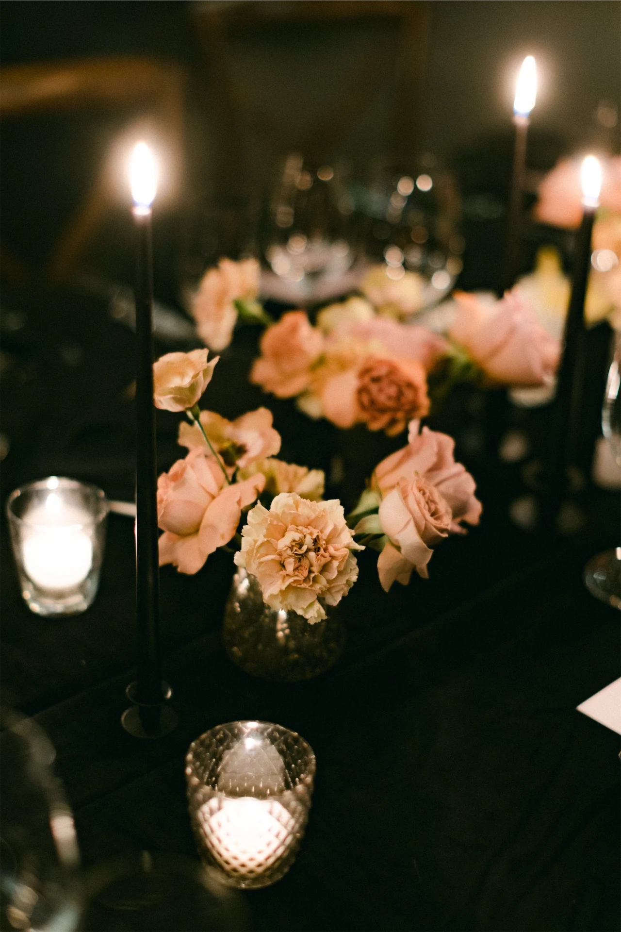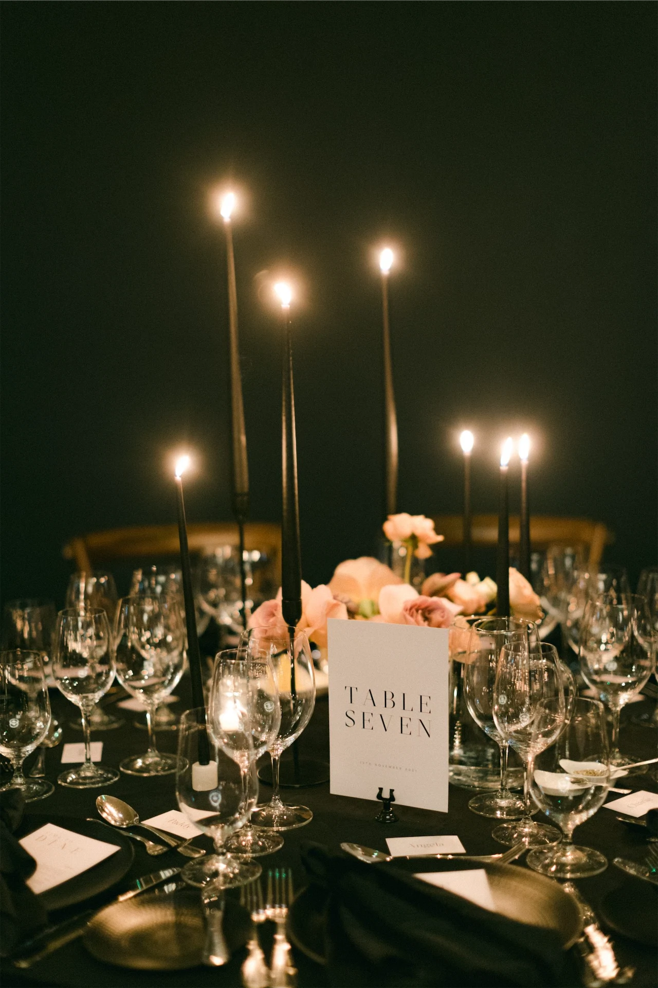 It was all about the decor and styling for me! Everything from the flowers and stationery, to the bridesmaid dresses and tabletop details was deeply considered. We decided on an all-black look for our dining room. Everything was black – the candles, candle holders, plates, velvet napkin and table linen.