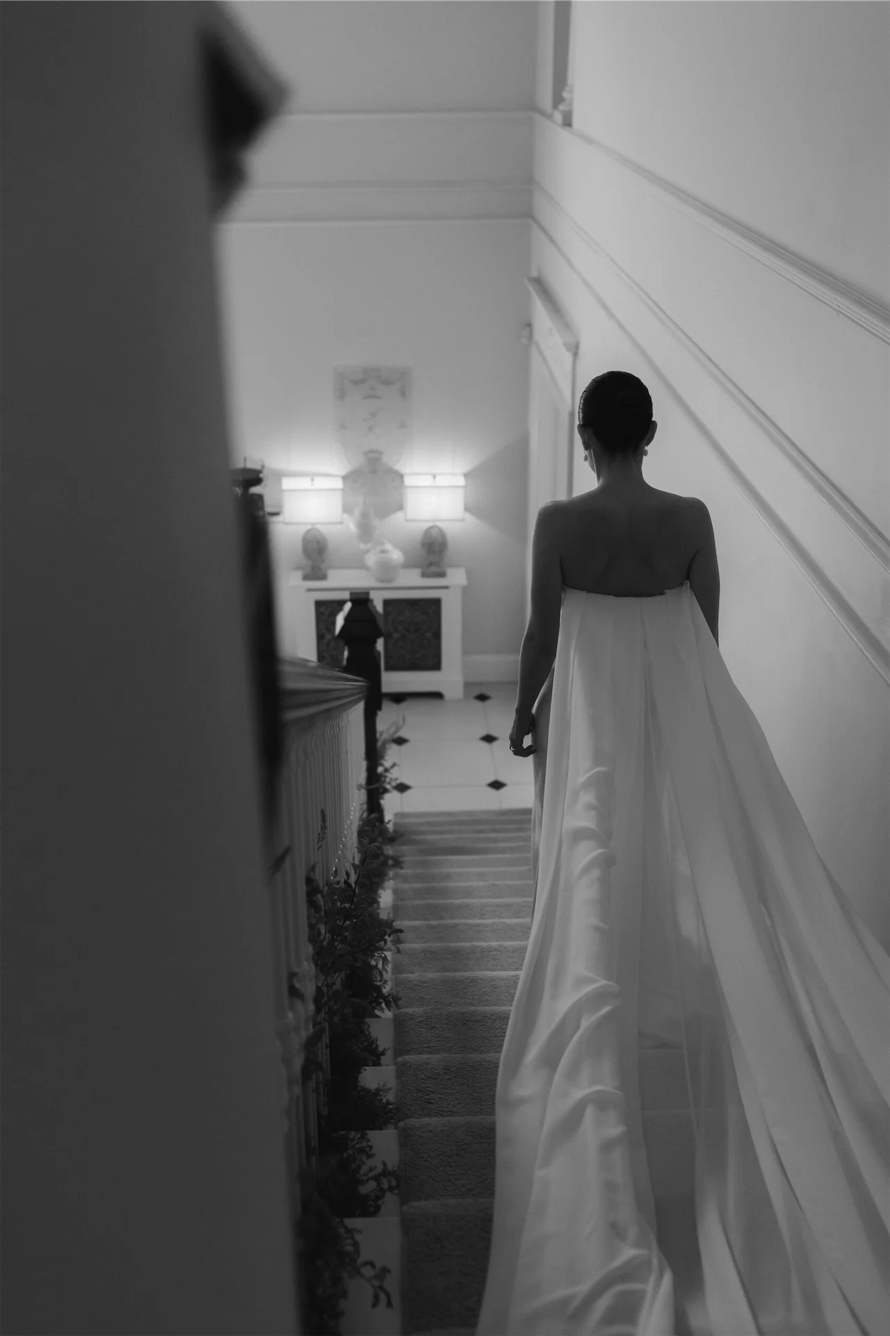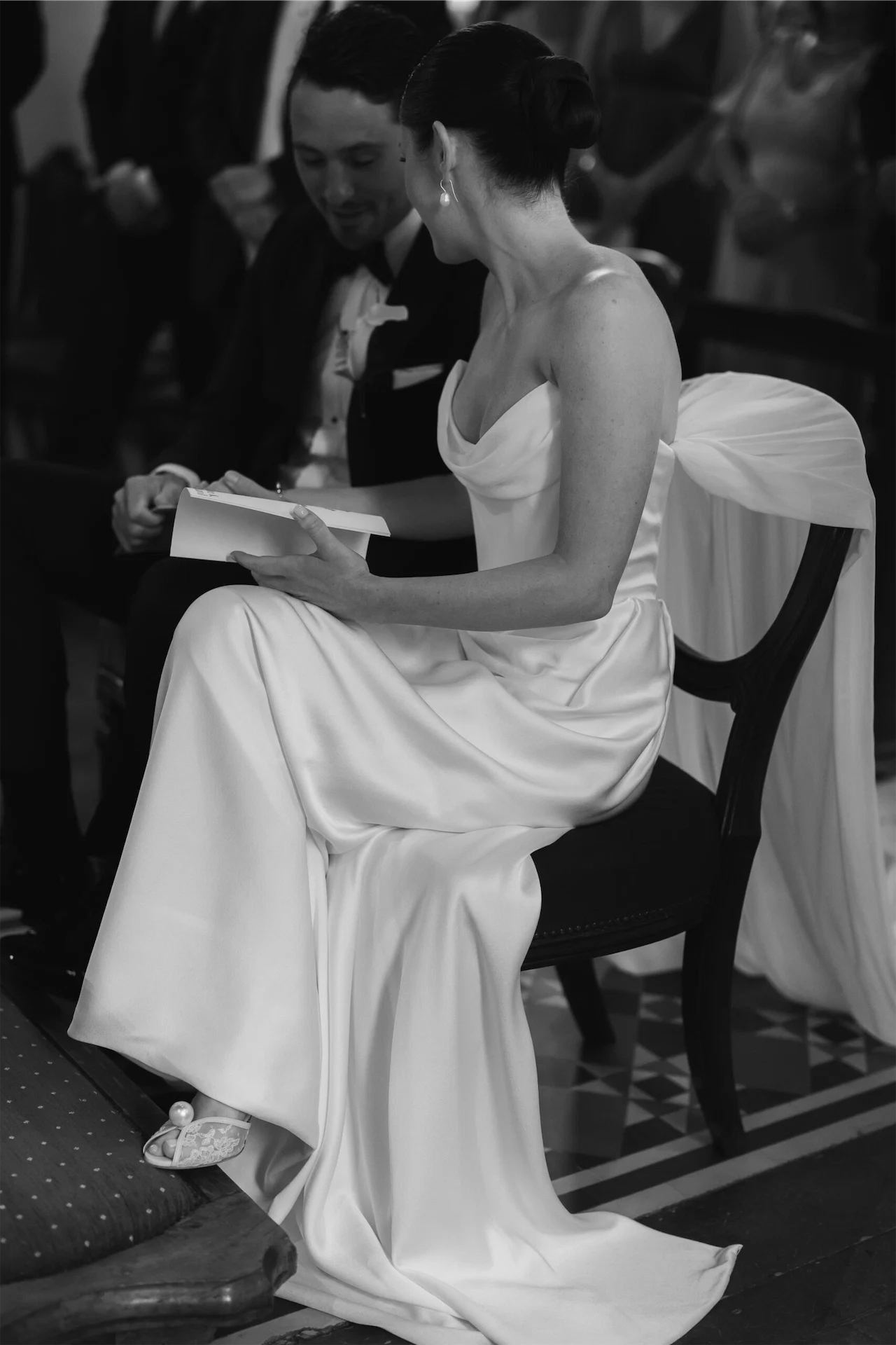 Wedding dress: Vivienne Westwood from Vivienne Westwood, Davies Street in London. Bride’s shoes: Jimmy Choo. Groom’s suit: Louis Copeland. Stationery: Keady Row. Embroidered napkins: Sew Bella, London. Make-up: Ailbhe Lynch.