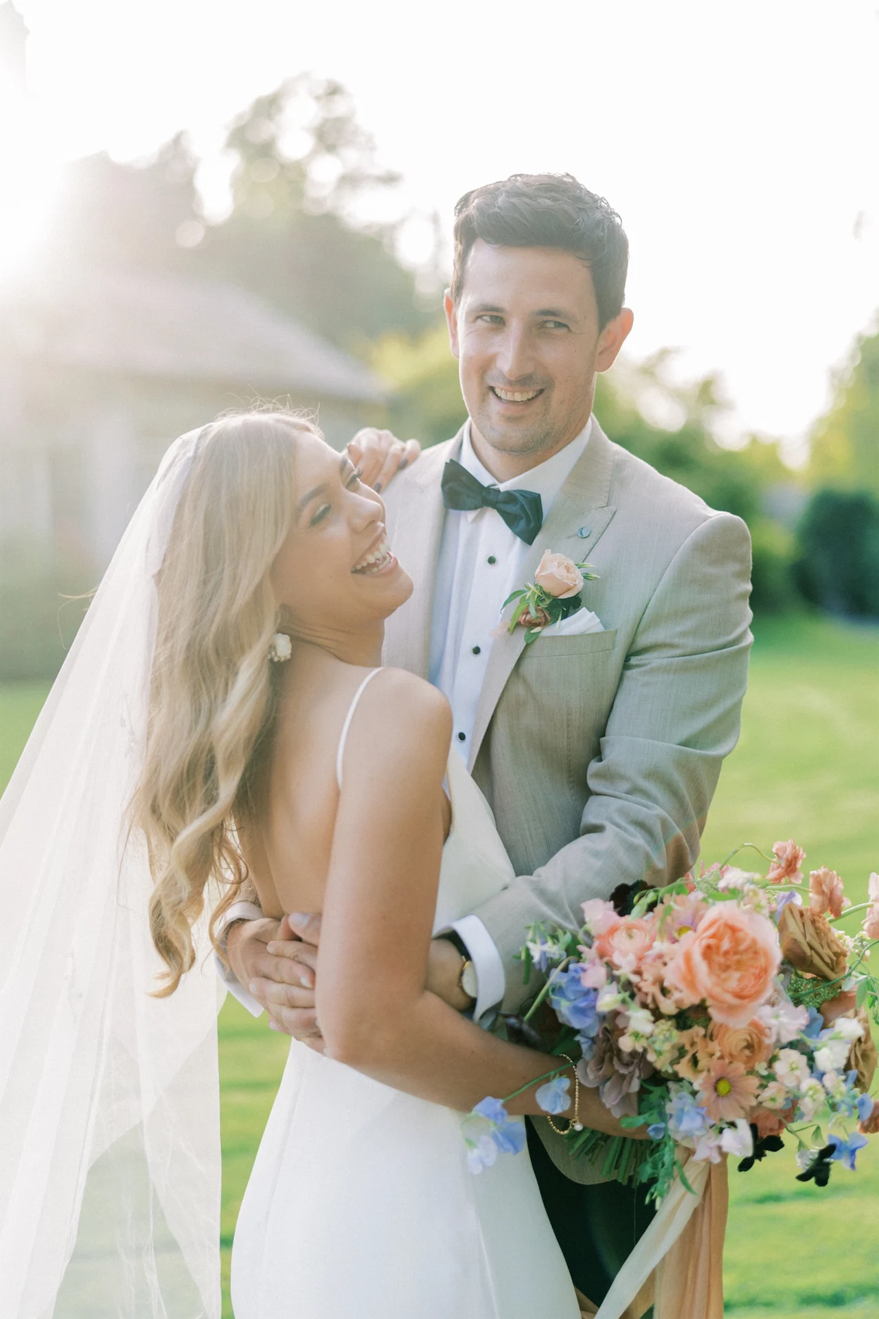 The bridesmaids wore a dark navy Ghost dress. The groomsmen were in black tuxes while David went for a beige-coloured Remus Uomo jacket for something a little different than the groomsmen.
