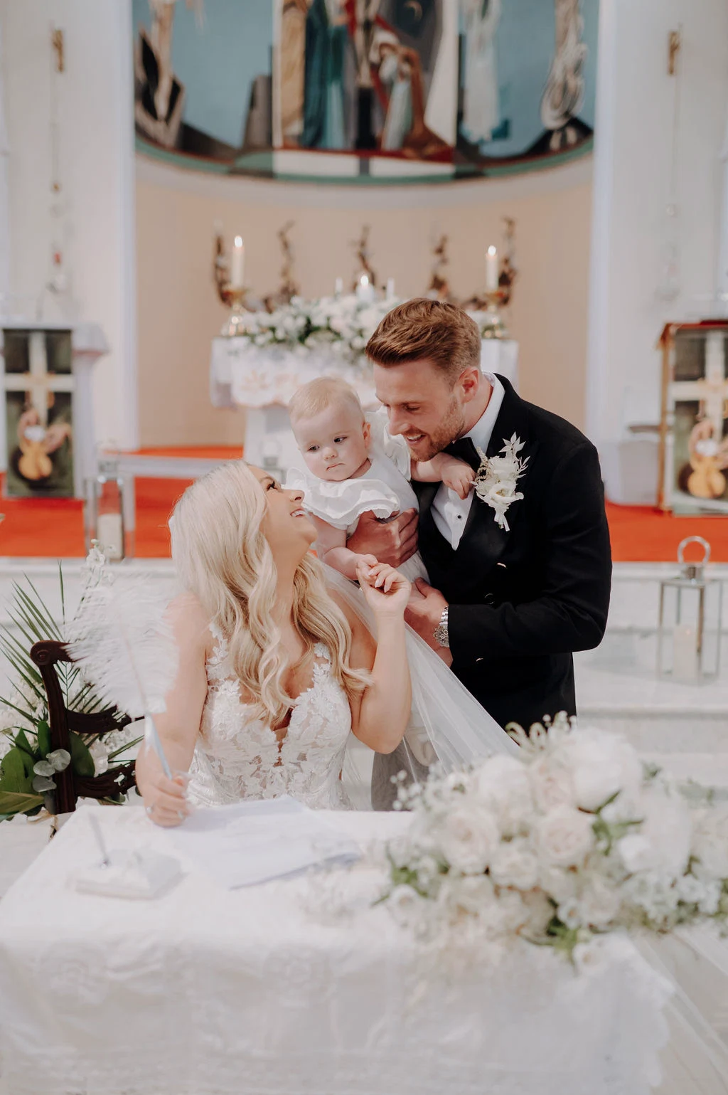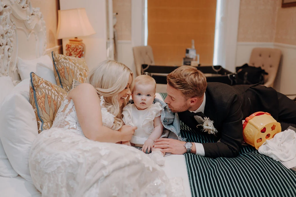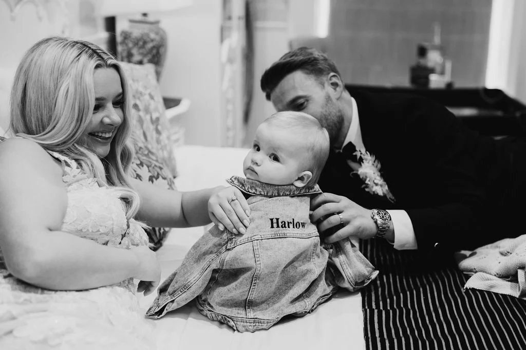 Our daughter Harlow was 13 months old at the time and was meant to walk up the aisle with my bridesmaids, but fell asleep on the way to the church, so she missed the whole ceremony. She woke up just at the end in time for the pictures, and Conor got emotional again seeing her. Emma captured some fab photos at the end of the ceremony of our little family!