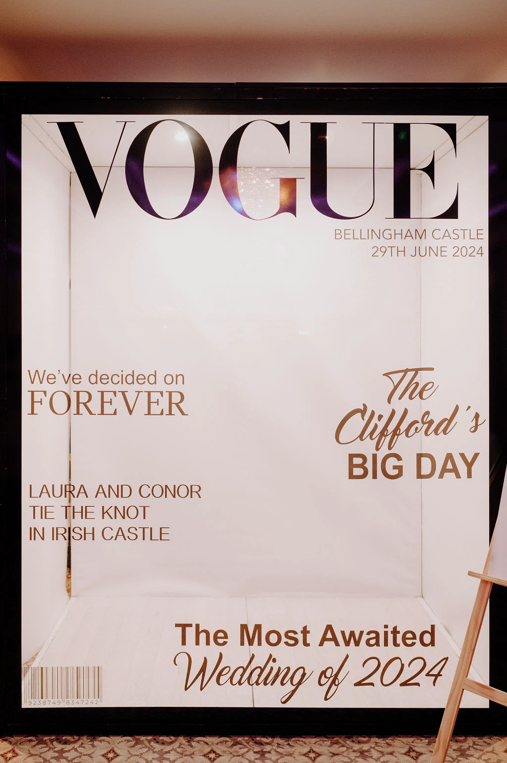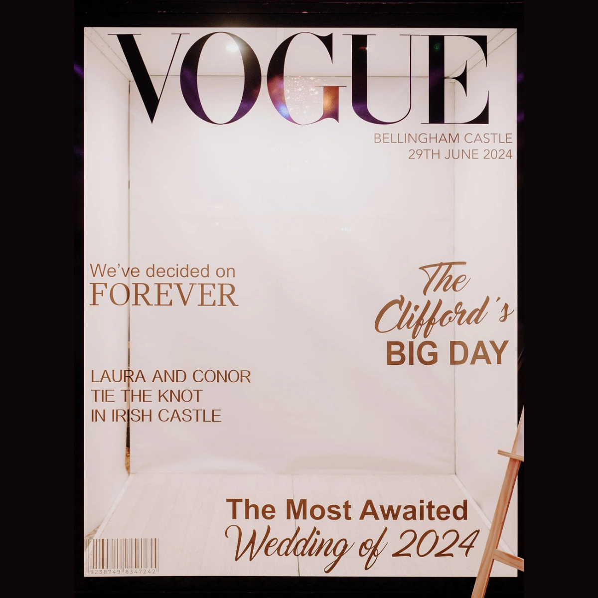 We also booked a Vogue magazine–style photo box. I knew I wanted something a little different for our guests to get photos in, so we booked this with Champagne Memories Events. Outside of the décor, I wanted little finishing touches, so we had personalised drink toppers with our initials for the reception drinks and personalised drink stirrers.