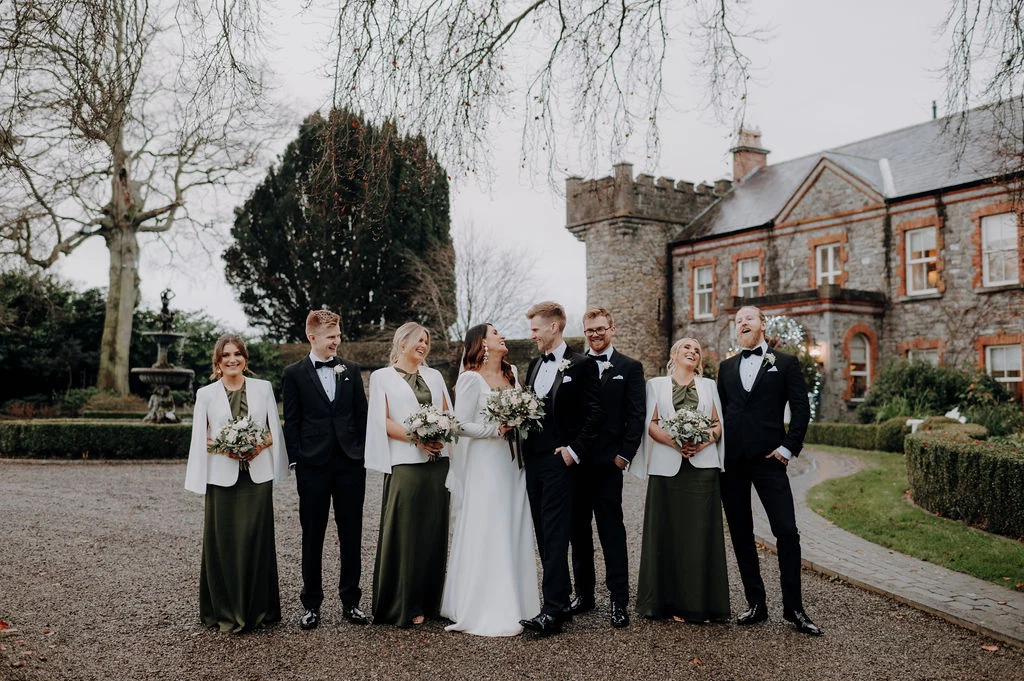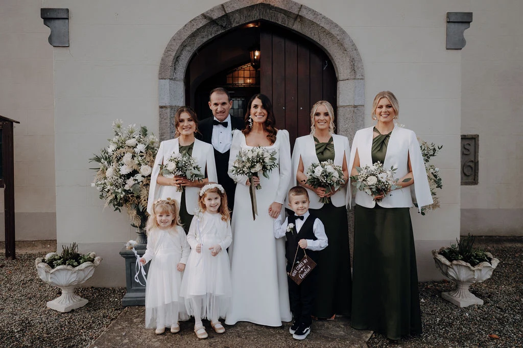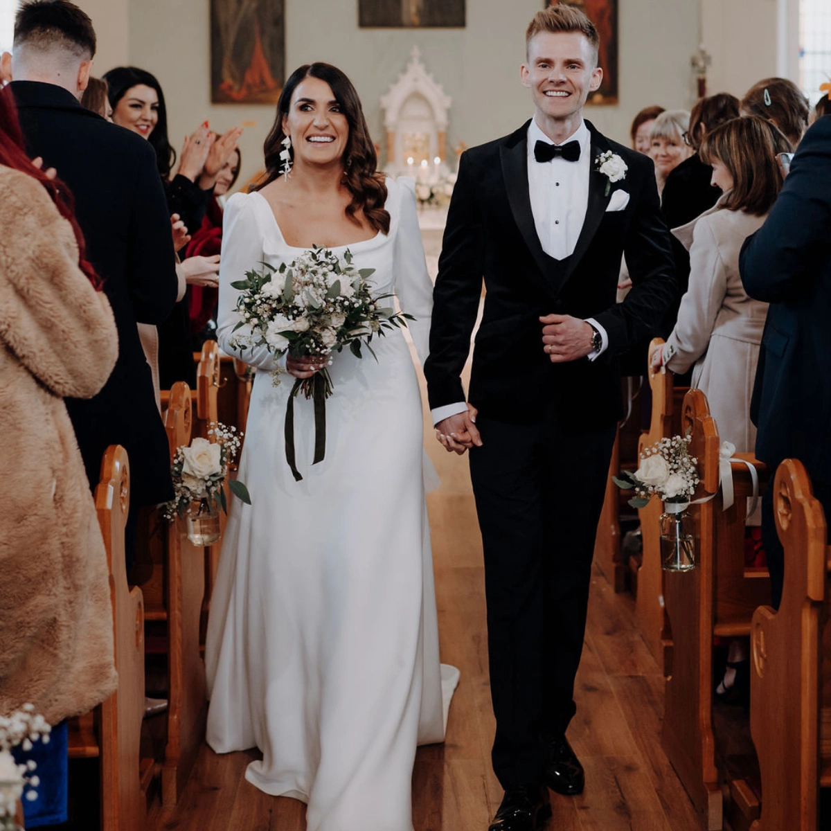 Wedding dress: Pronovias dress from The White Room. Bride’s shoes & bag: Loeffler Randall from The White & Gold. Wedding Suit: Richie Whelan’s Menswear. Bridesmaids’ dresses: Folkster. Cake: Mimi’s Bakes. Florist: The Tangled Bramble. Make-up: Nicole McGrath. Hair: Clare Feary from Snipetts Hair Salon. Wedding car: Peader from My Wedding Car.ie. Band: Arthur. Videographer: Evan from Irish Eye Wedding Videos.