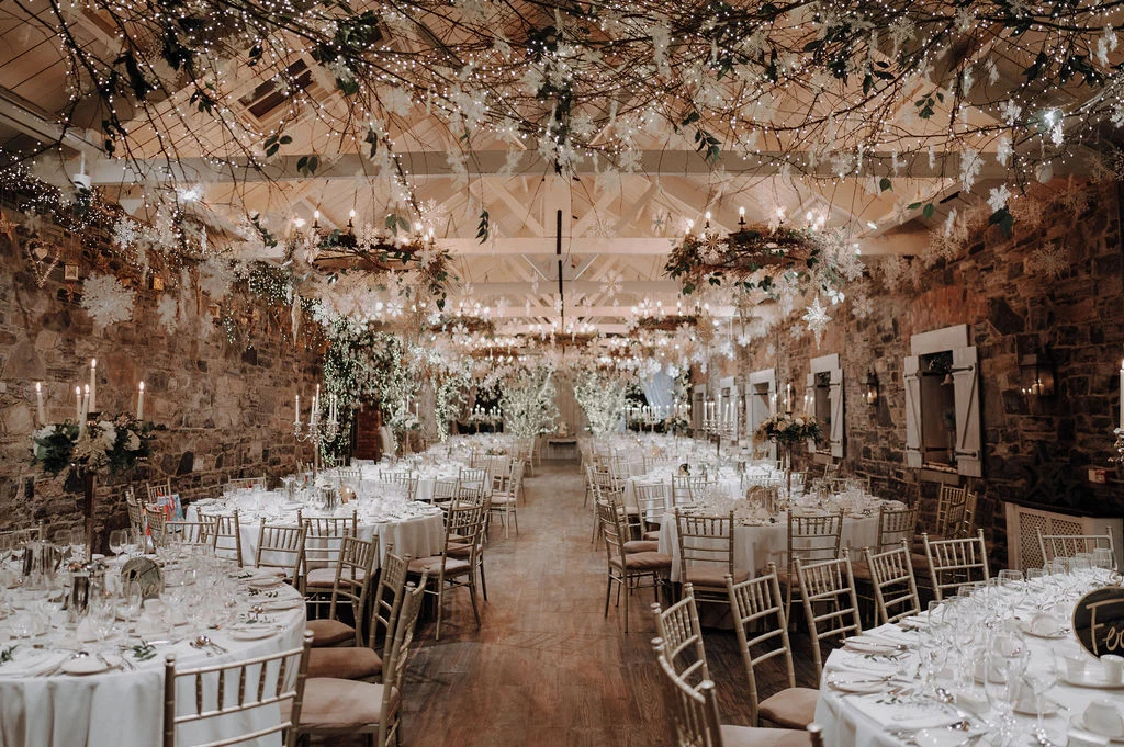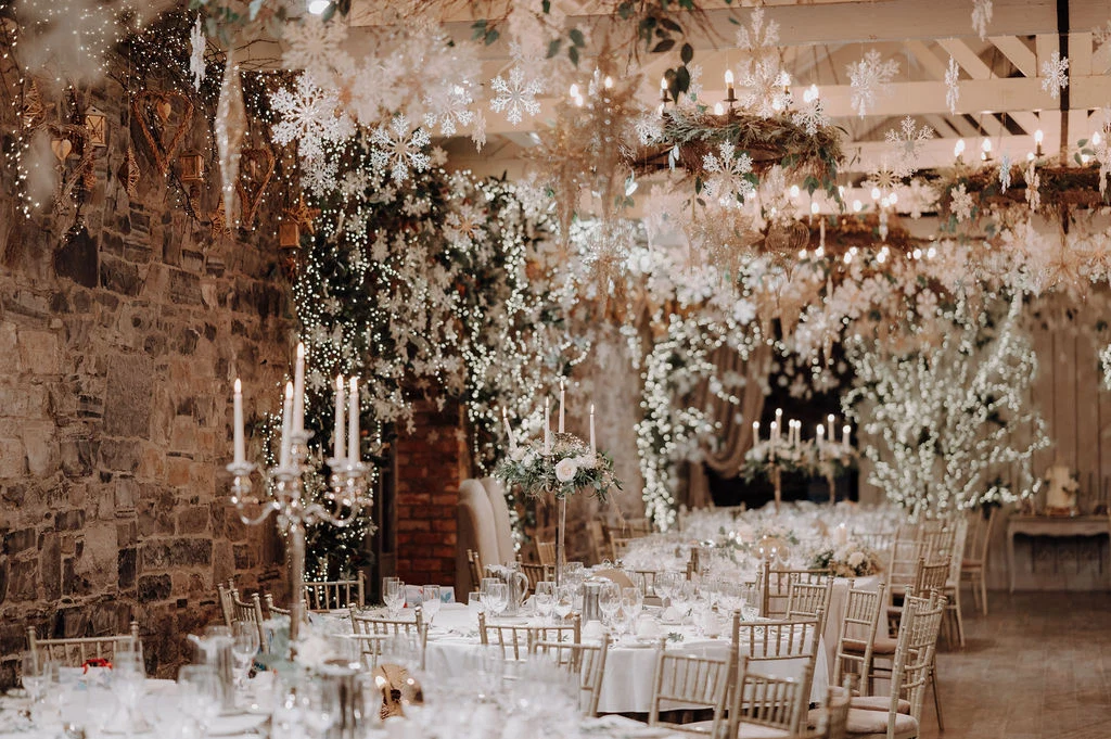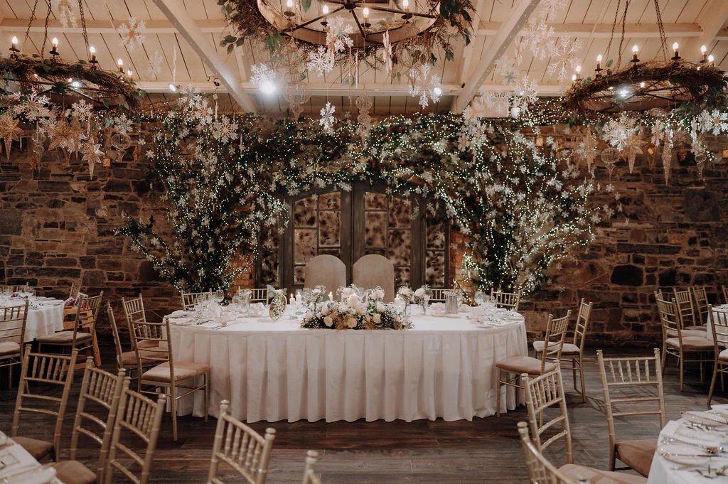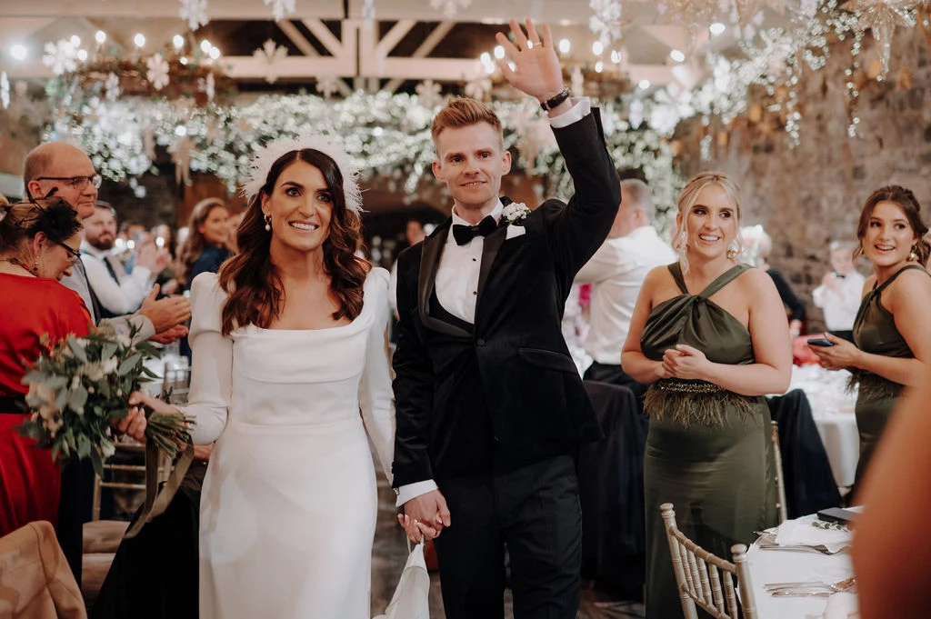 Laura and Marc tied the knot in their local church before heading in style to Ballymagarvey Village. Akin to a winter wonderland, the venue was beautifully decorated with twinkling lights, dangling stars and snowflakes, and hibernal florals.