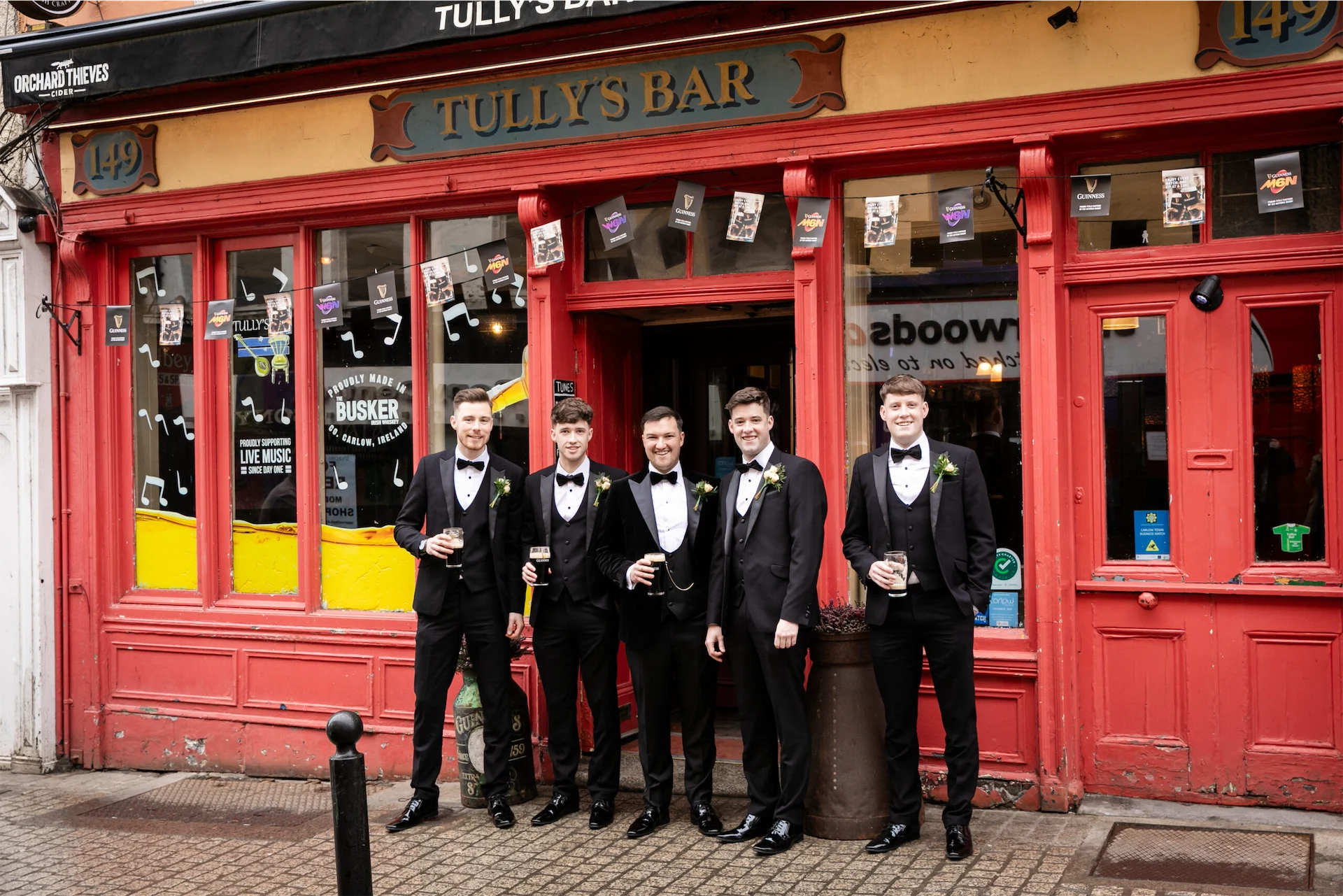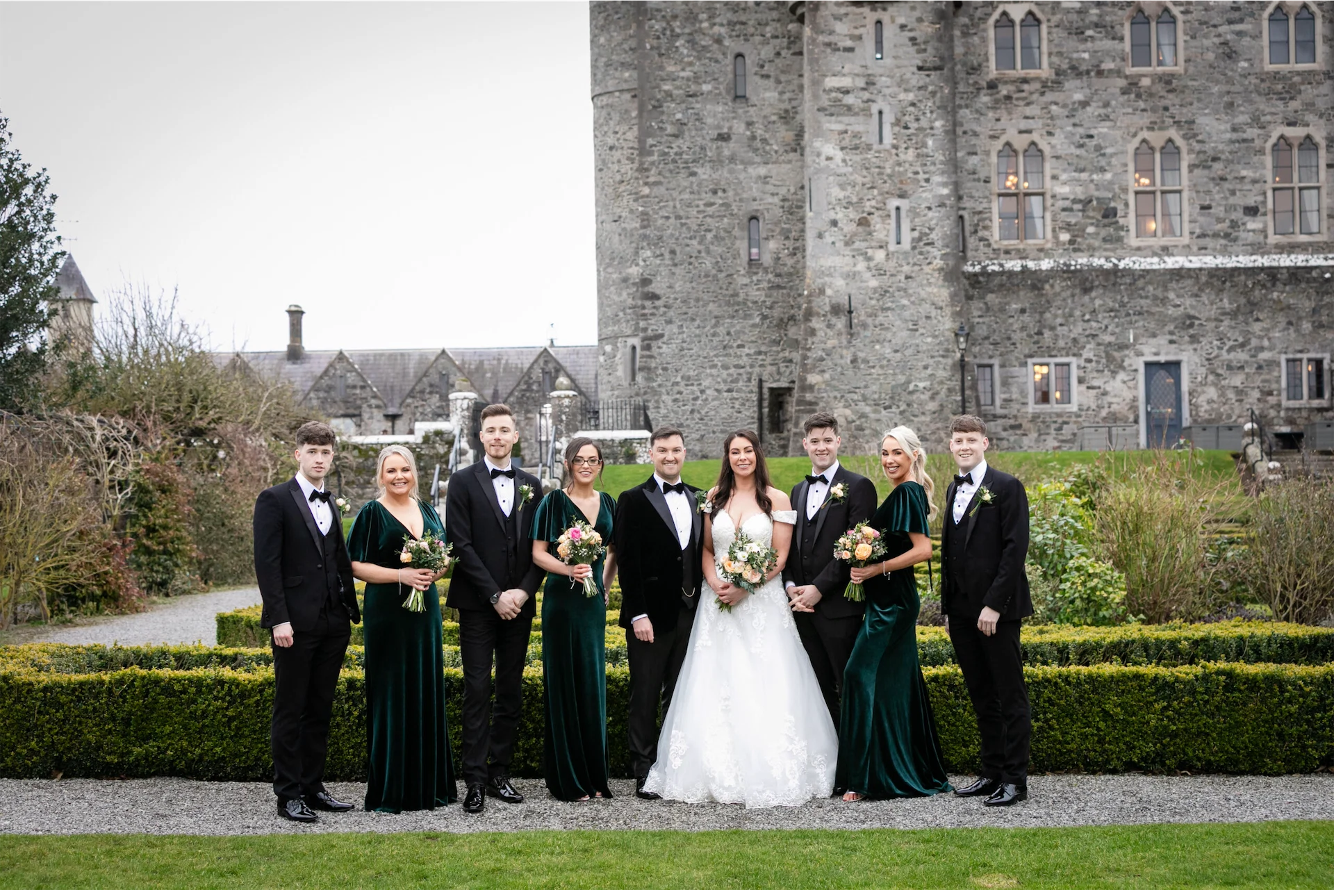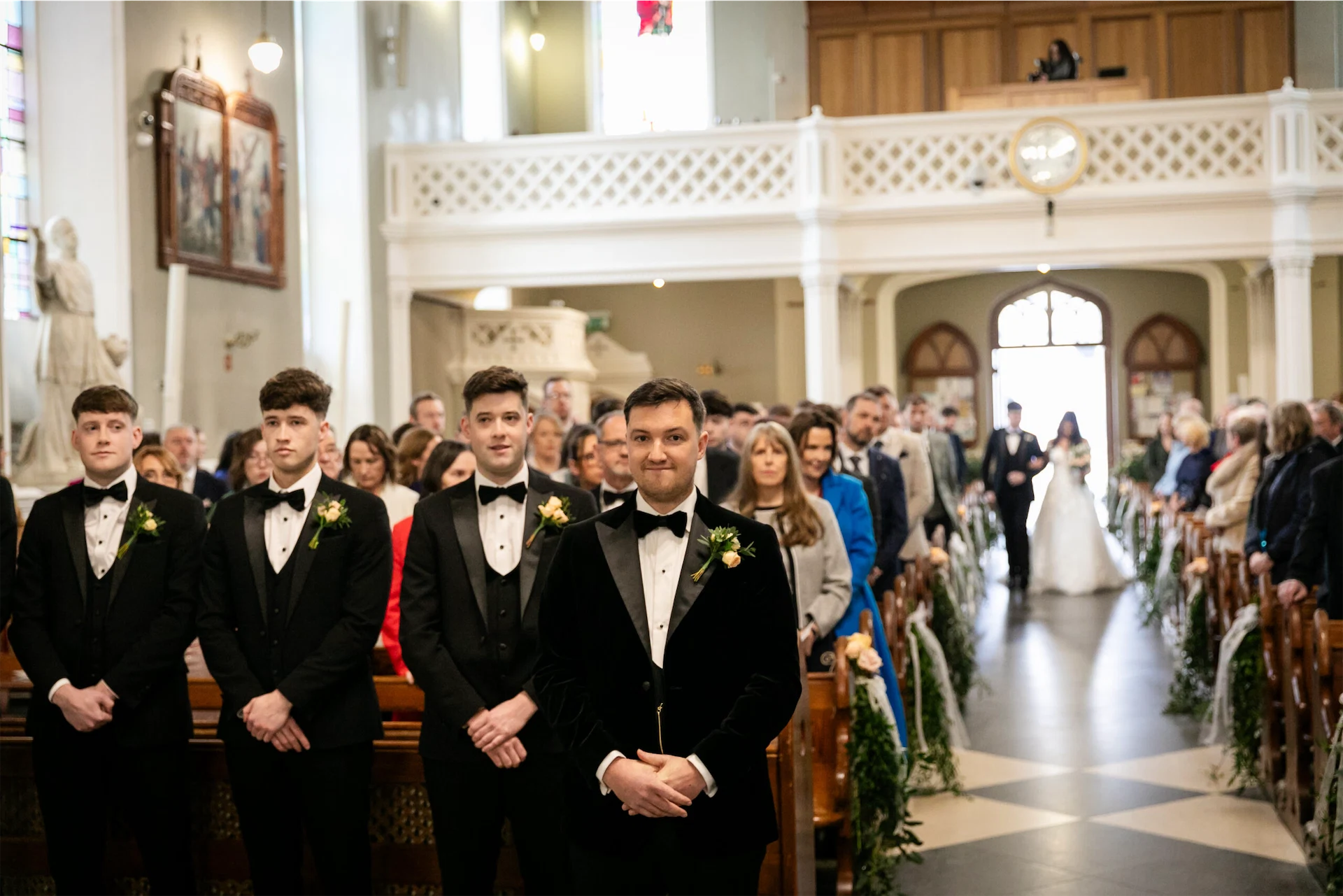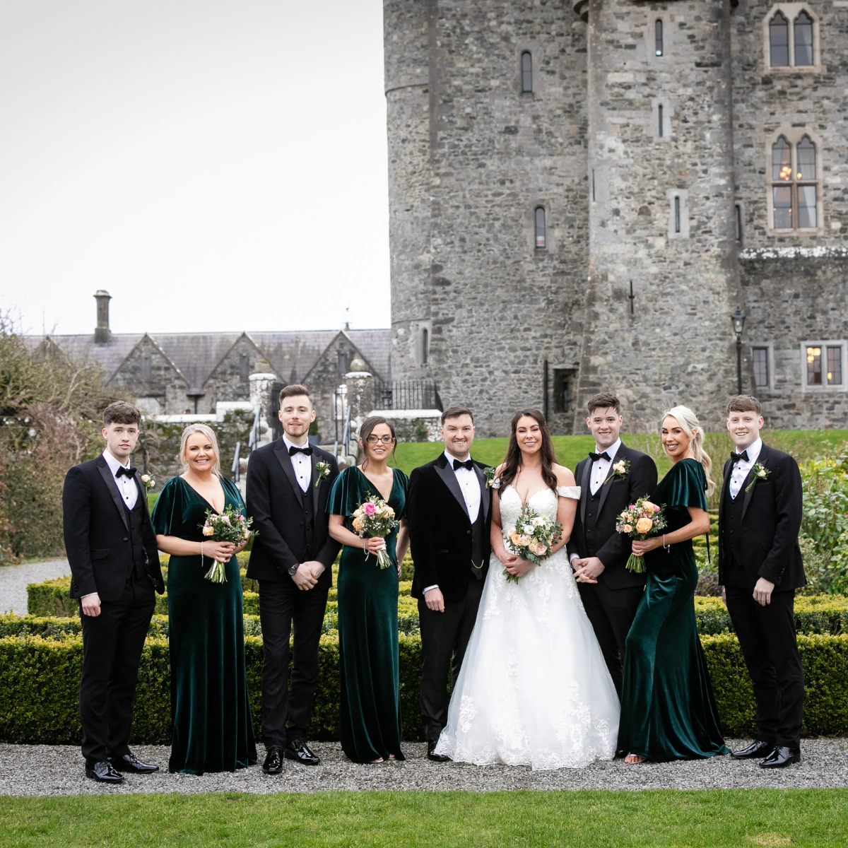 Wedding Dress: Essence of Australia from Jeutonic Bridal. Bride’s Earrings: Alan Dalton. Groom’s Tux: Louis Copeland. Bridesmaids’ Dresses: Sorella Vita. Groomsmen’s Tuxes: Mac’s Menswear. Flowers: Slieveardagh Blooms and Oasis Flowers. Make-up: Coco Rouge Make-up. Hair: Joanne Kelly O’Hara. Cake: Catherine McKeown. Transport: VW Weddings. Videographer: I Carry Your Heart Wedding. Content Creation: FOMO Media.