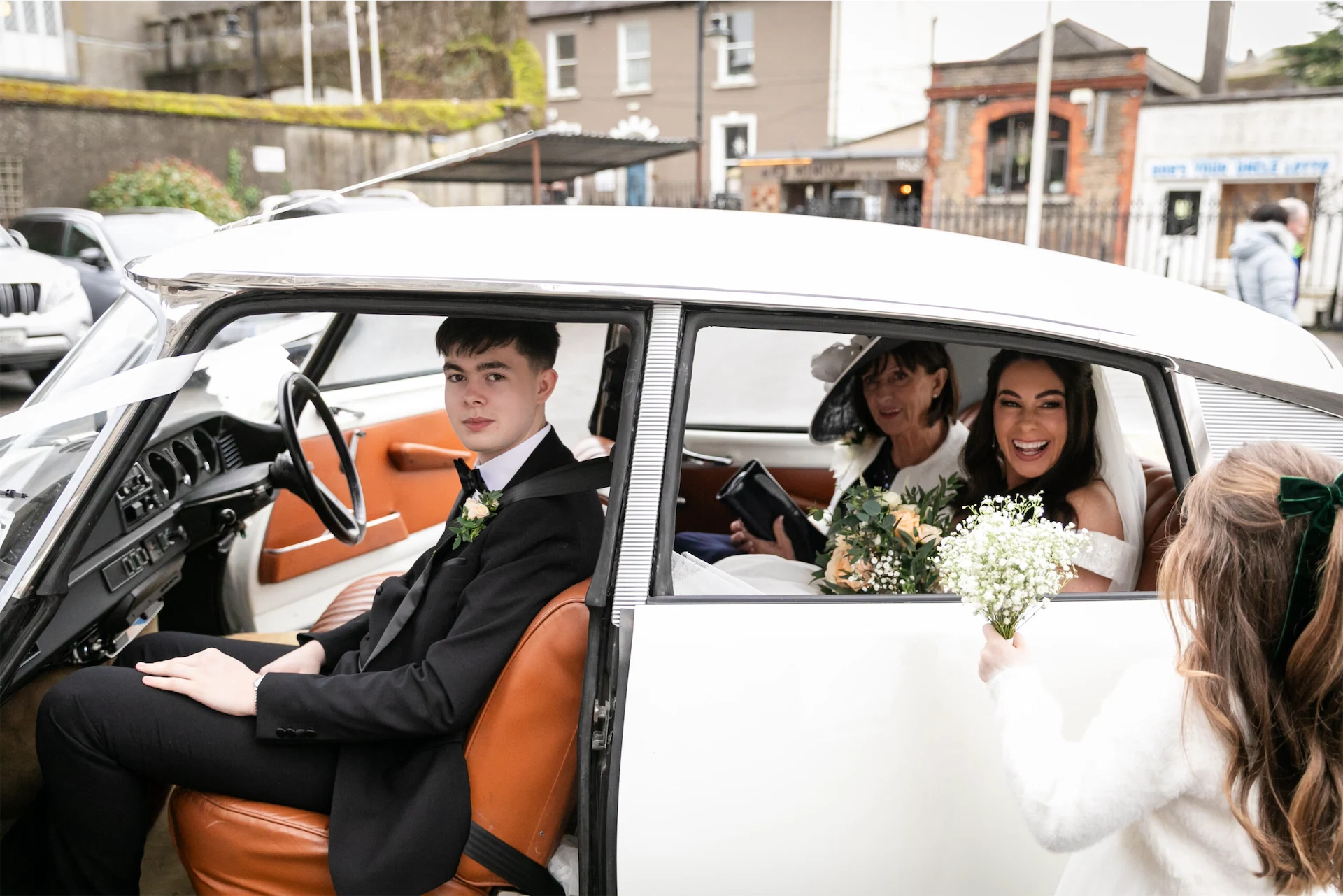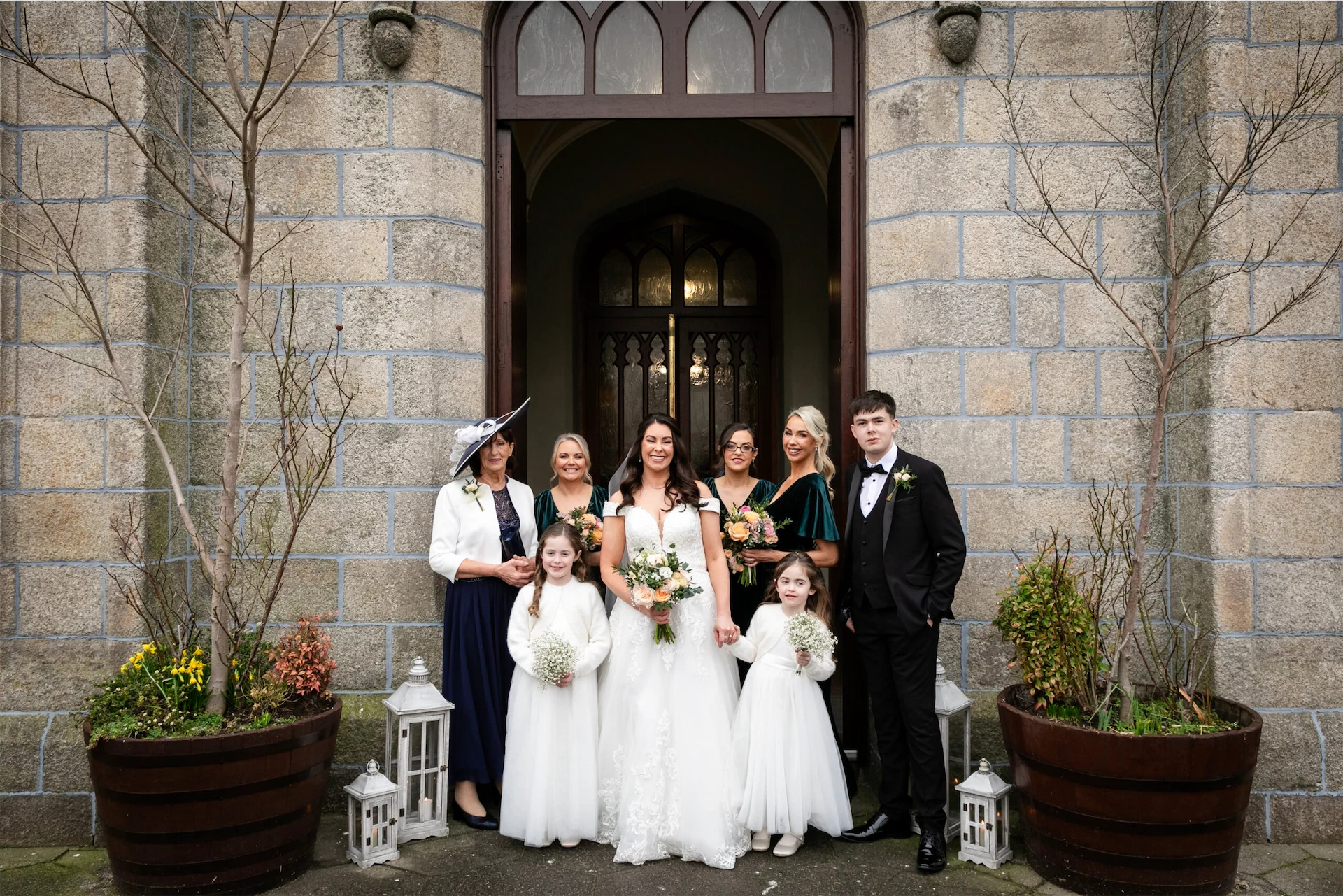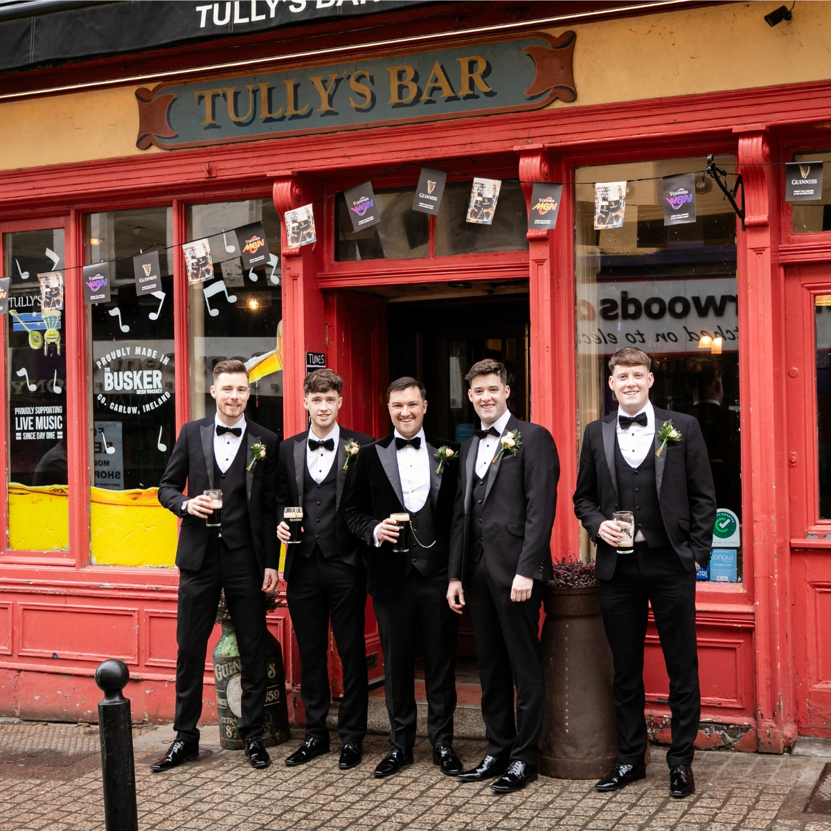 Wedding Dress: Essence of Australia from Jeutonic Bridal. Bride’s Earrings: Alan Dalton. Groom’s Tux: Louis Copeland. Bridesmaids’ Dresses: Sorella Vita. Groomsmen’s Tuxes: Mac’s Menswear. Flowers: Slieveardagh Blooms and Oasis Flowers. Make-up: Coco Rouge Make-up. Hair: Joanne Kelly O’Hara. Cake: Catherine McKeown. Transport: VW Weddings. Videographer: I Carry Your Heart Wedding. Content Creation: FOMO Media.