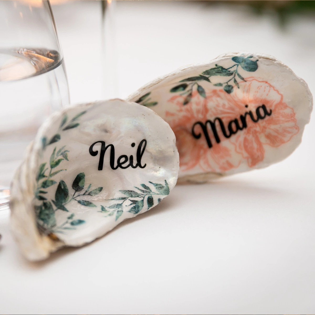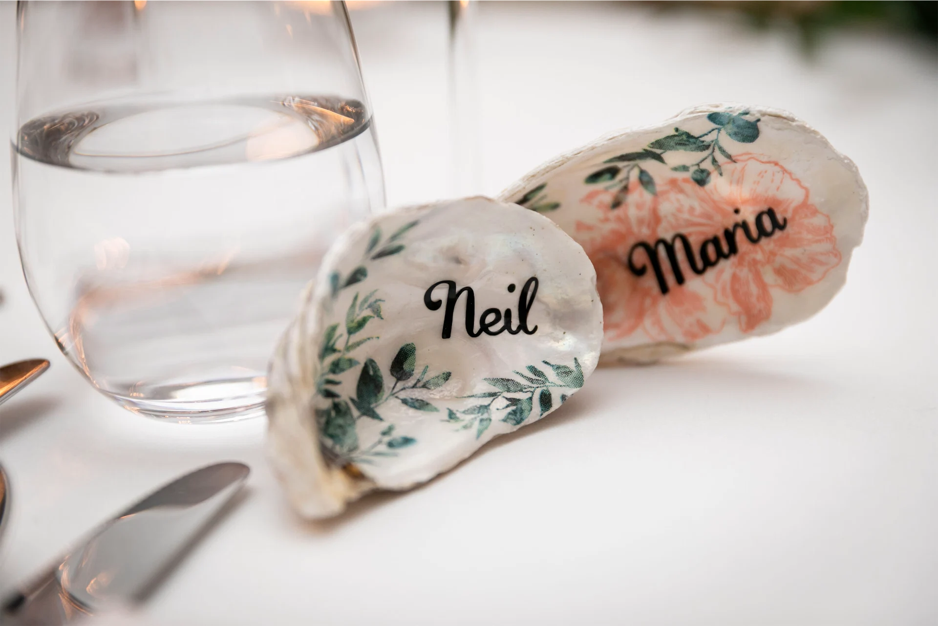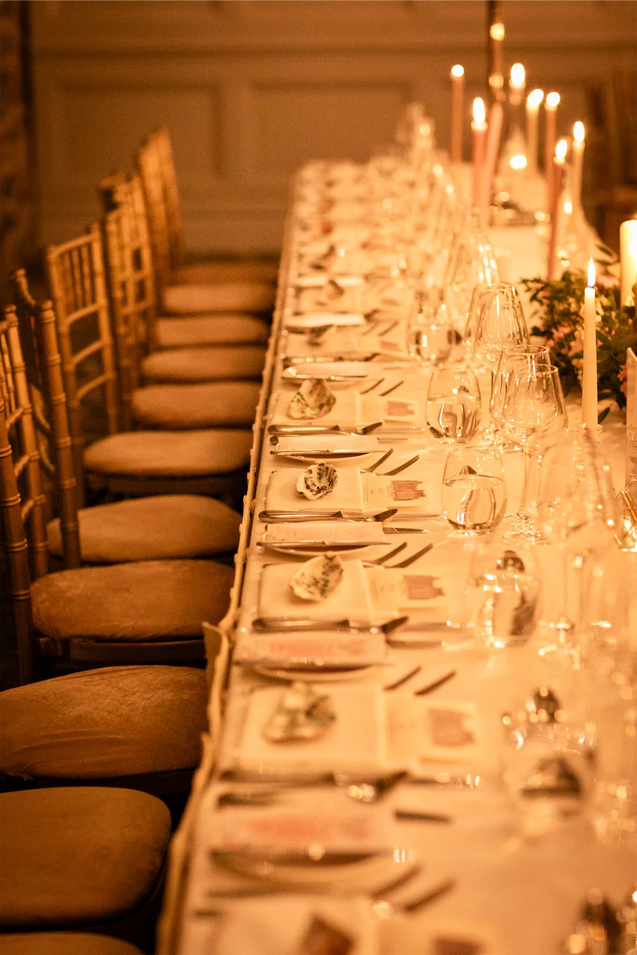 We planned everything ourselves – in true teacher stereotype, I have a thing for planning and organising, while Neil has a thing for golf, so it worked out well. We created placenames using oyster shells we gathered on the Cunnigar in An Rinn. My art students helped me decoupage them in floral patterns in colours corresponding to our flowers and used calligraphic names for each guest. These were a real talking point. We also had individual thank you cards at each place setting. Some fourth-year students also made beautiful candles in oyster shells for us to add to the array of peach and pink and ivory candles that flickered all night in the Baronial hall.