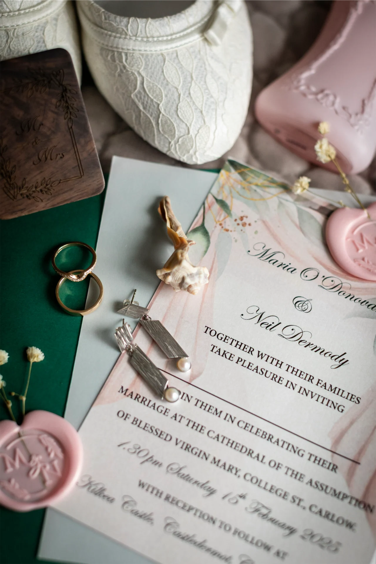 We always knew we wanted a church ceremony as Gaeilge. Fr. Ger Ahern, a good family friend of Neill’s family, was our celebrant. Carlow Cathedral was a beautiful location for our ceremony, and having Fr. Ger was a huge part in making our day special and celebrating everything dear to us… family, friends, language, art, music. Aoibhe Devereux, a fifth-year art student at our school, designed our beautiful mass booklets.