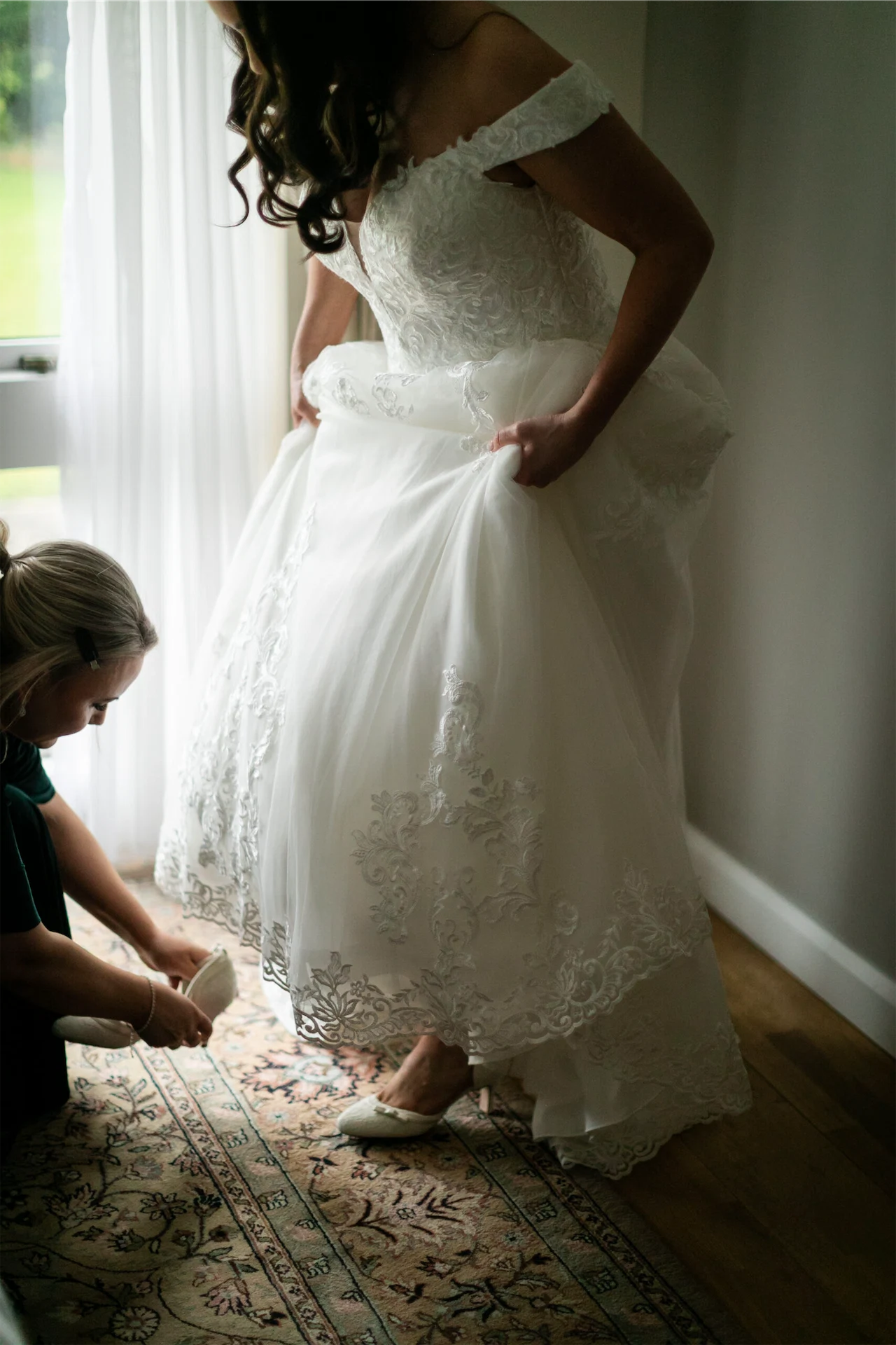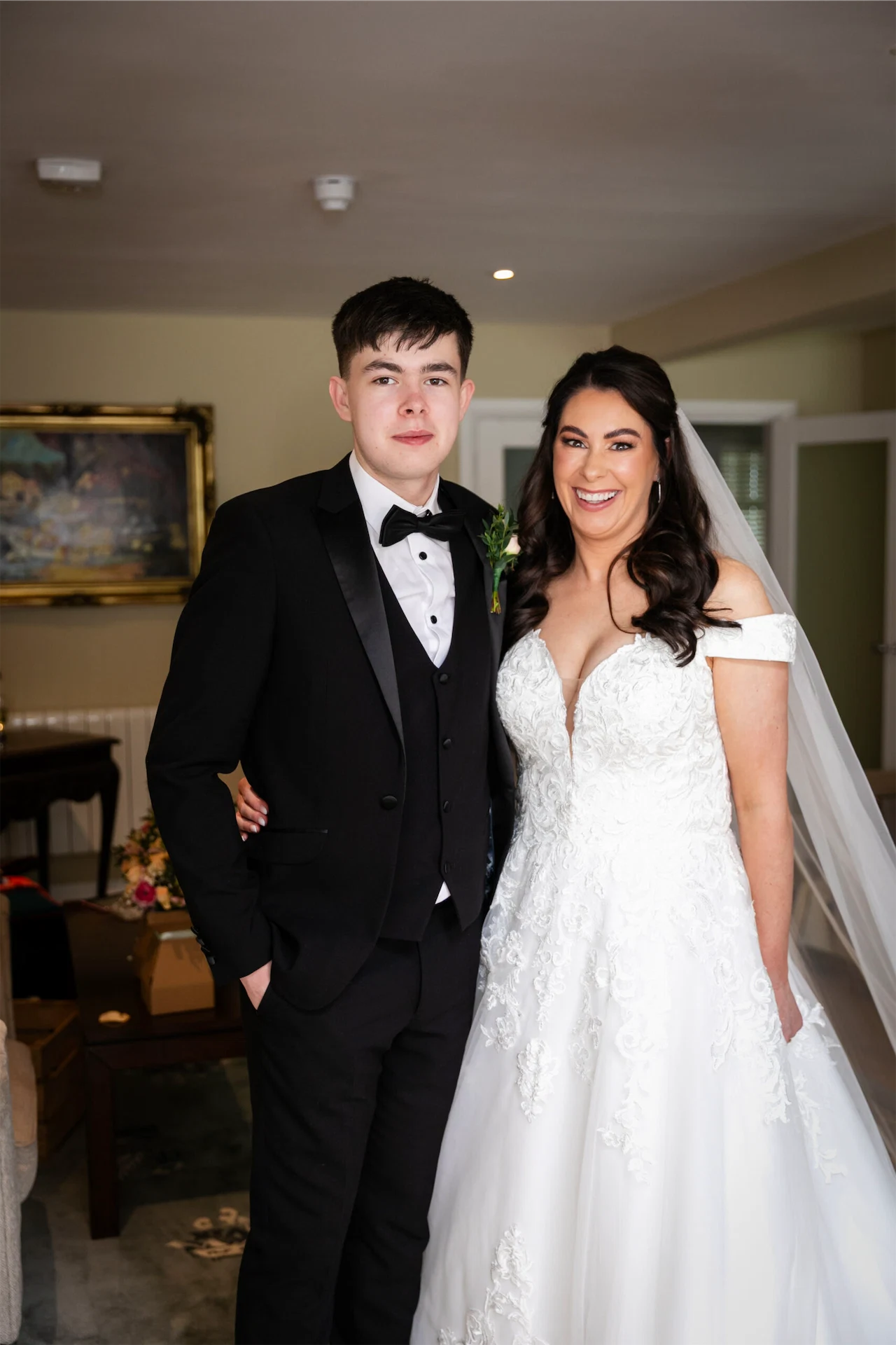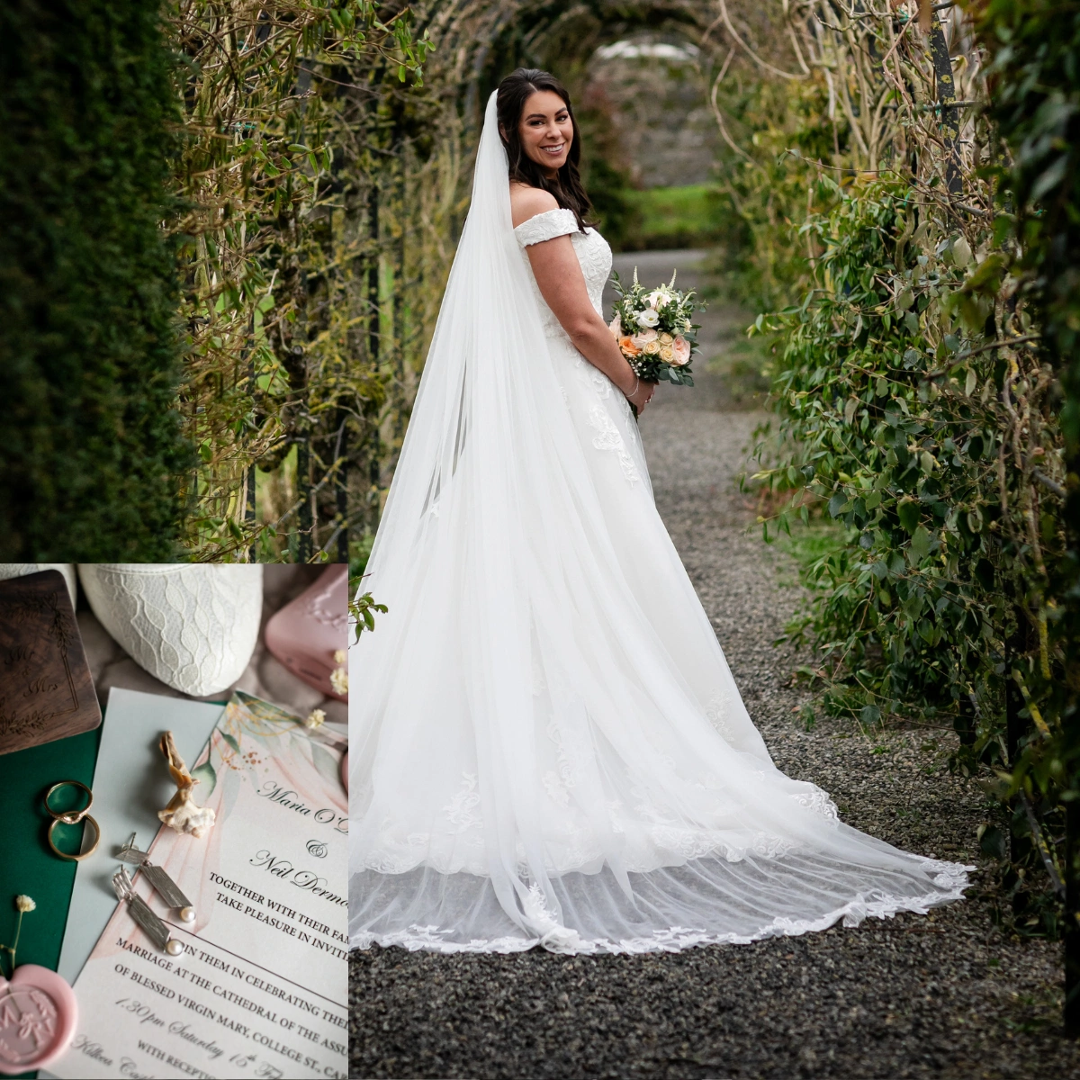 My dress was from Essence of Australia, an off-the-shoulder A-line lace dress I bought in Jeutonic Bridal in Killkenny. My cathedral-length veil was handmade, and I wore bespoke custom-made earrings by goldsmith Alan Dalton in Dungarvan; they had pearl detail and subtle textures of the faint ripples across waves. Alan also made our wedding bands – mine is an 18-carat rose gold and diamond curved band that fits my engagement ring. Neil’s ring was also 18-carat rose gold.