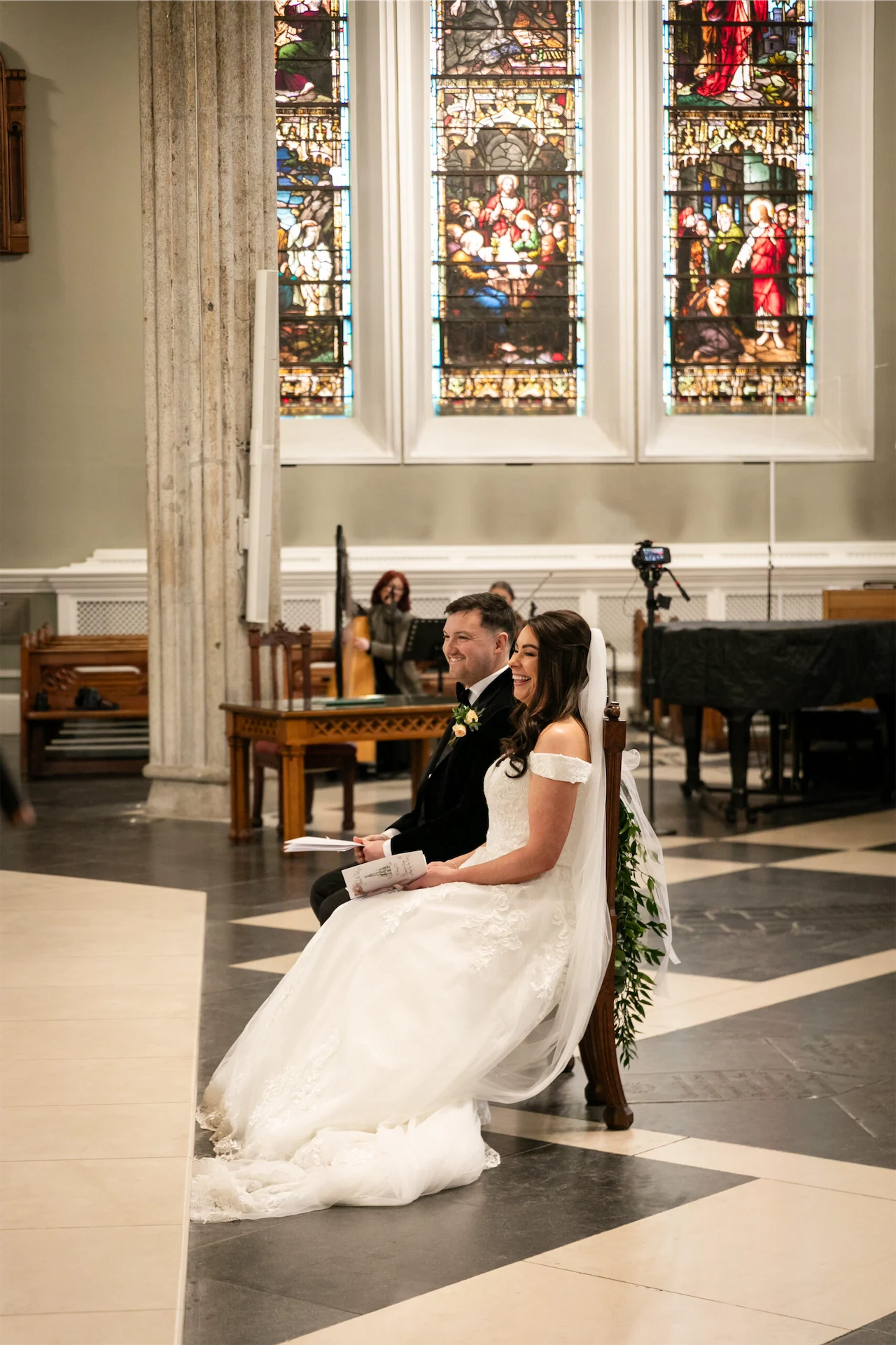 Our music was provided by the amazing harpist and singer Orla Fallon, who sang as Gaeilge, accompanied by our friend Sarah O Gorman, another notable musician on fiddle. After communion, Dearán Ó Droma sang In Eireann Ni Neosainn Ce Hi and Neil’s brother Seán read a beautiful poem. Our friends and talented musicians from Meánscoil San Nioclás surprised us by playing to finish our ceremony and to play us out of the cathedral.