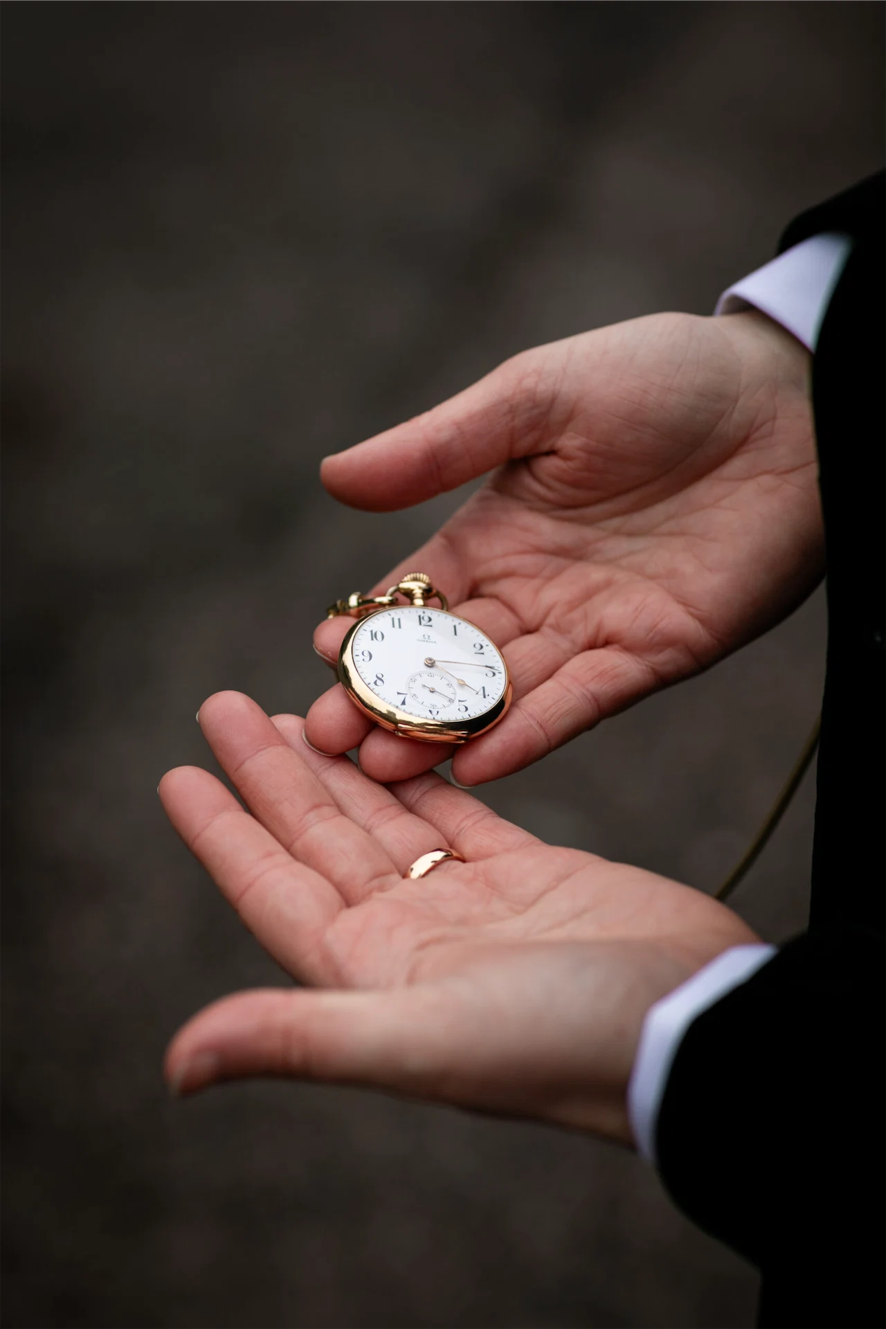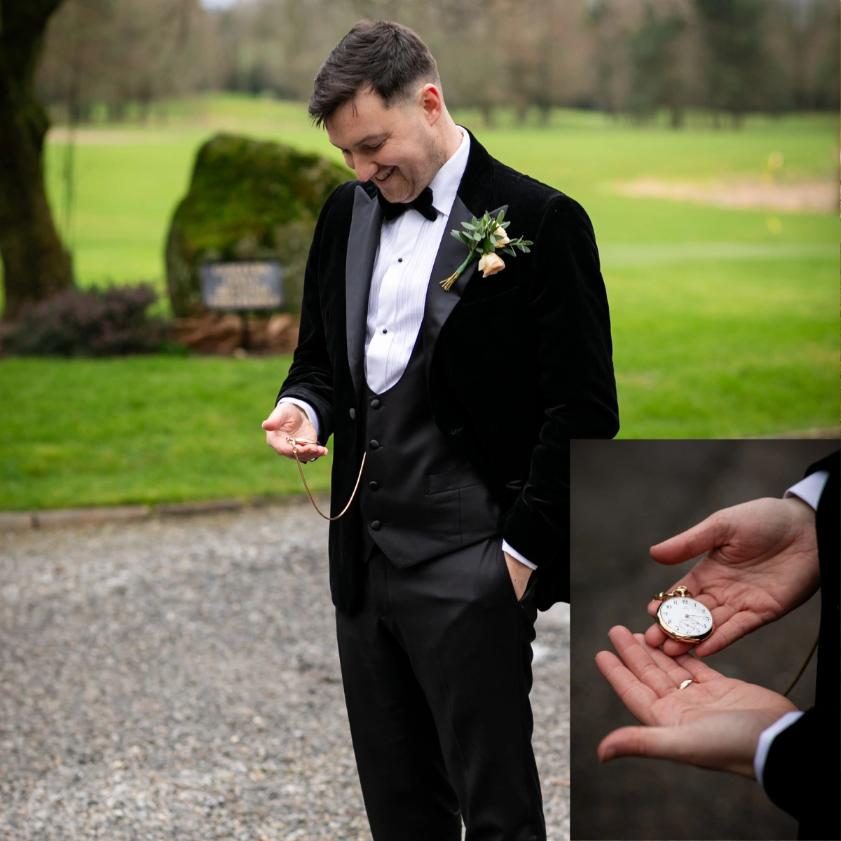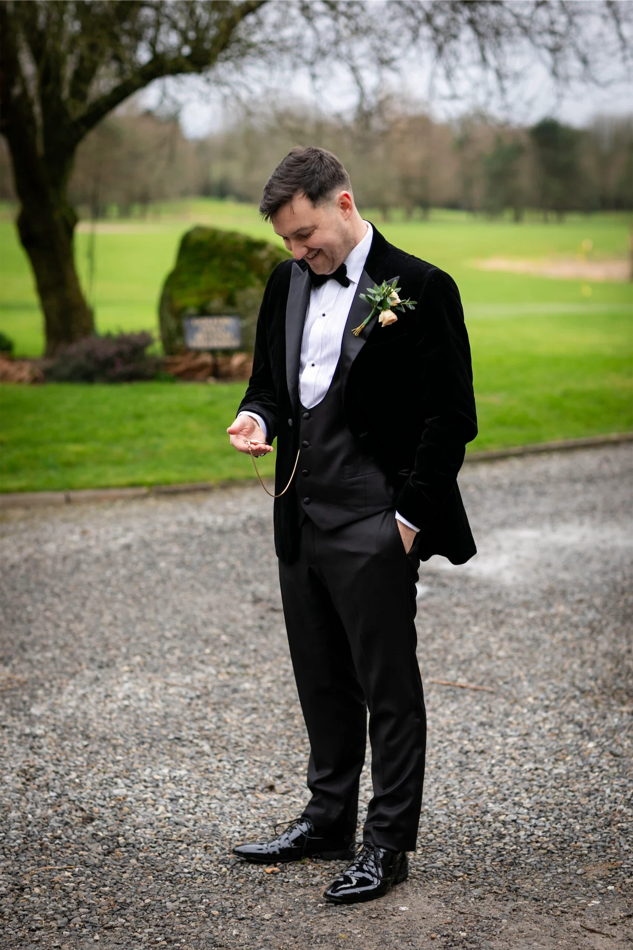 Neil wore a custom-made black tux from Louis Copeland. The trimming inside was Van Gogh’s “Starry Night” inspired, and Neil had it customised further with our names on the inner lapel and his surname under the collar in yellow thread. He wore a gold vintage Omega pocketwatch. We both wore Parfums de Marly scents – I had Delina, and Neil chose Althiar.
