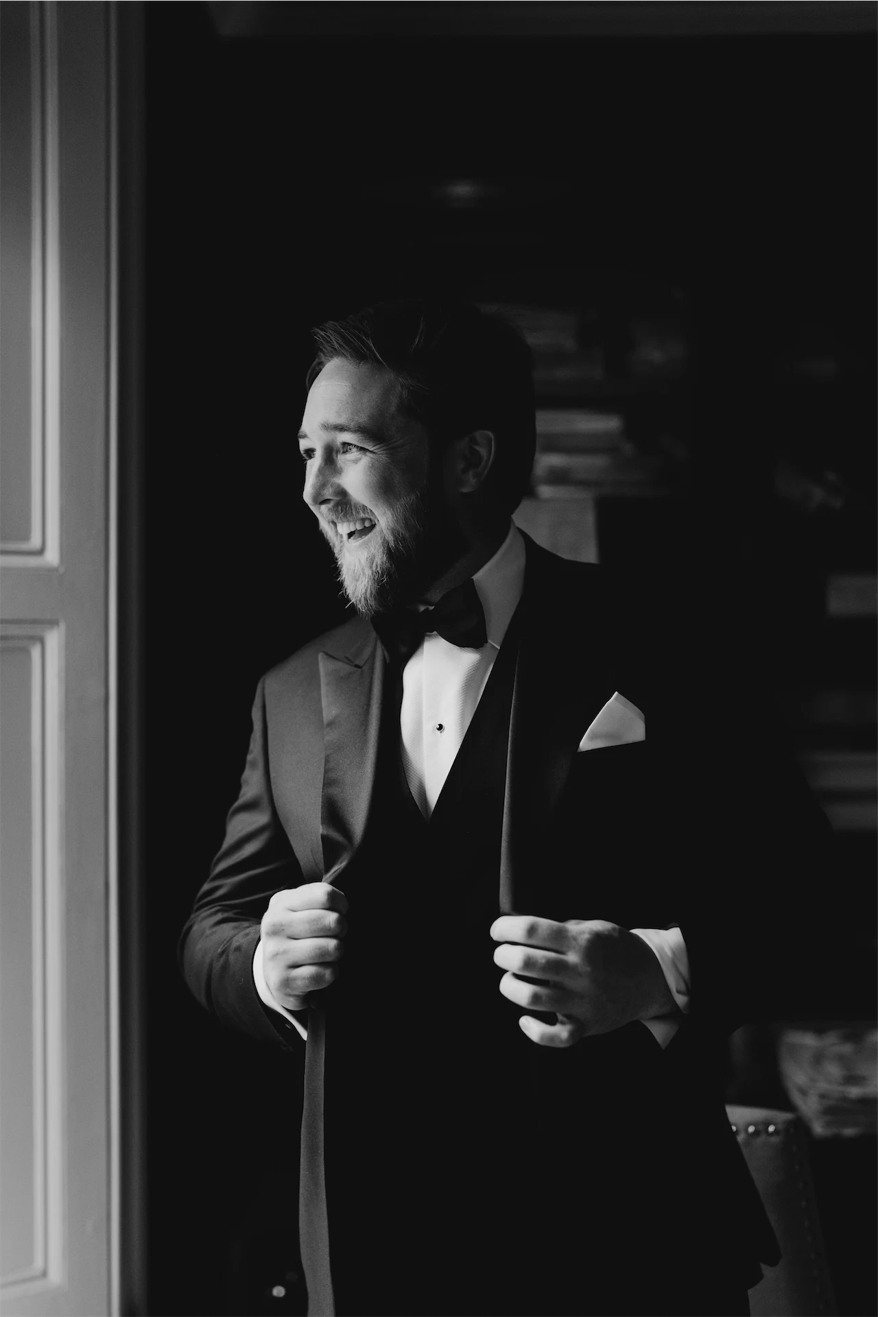 Rob’s wedding suit was from Louis Copeland suit in Wicklow Street as we wanted something completely custom-made. Our point of contact was John Byrne, who was excellent. We selected a three-piece tuxedo suit in a Super 170 Loro Piana Wool fabric. He wore slim-fit trousers that matched his jacket – a slim single-button peaked lapel style with a contrast lining in burgundy satin; our initials and date are stitched into the left lining.